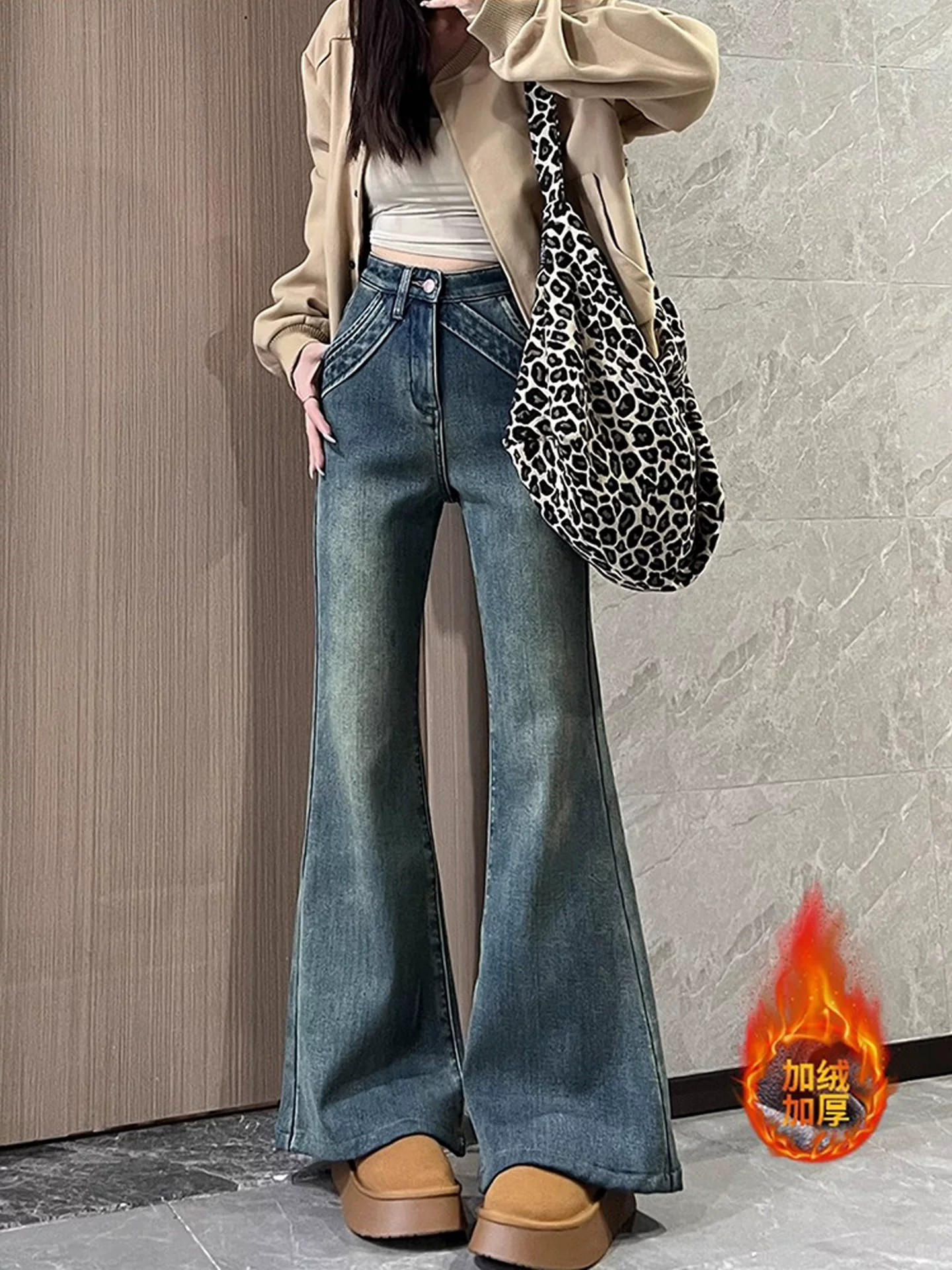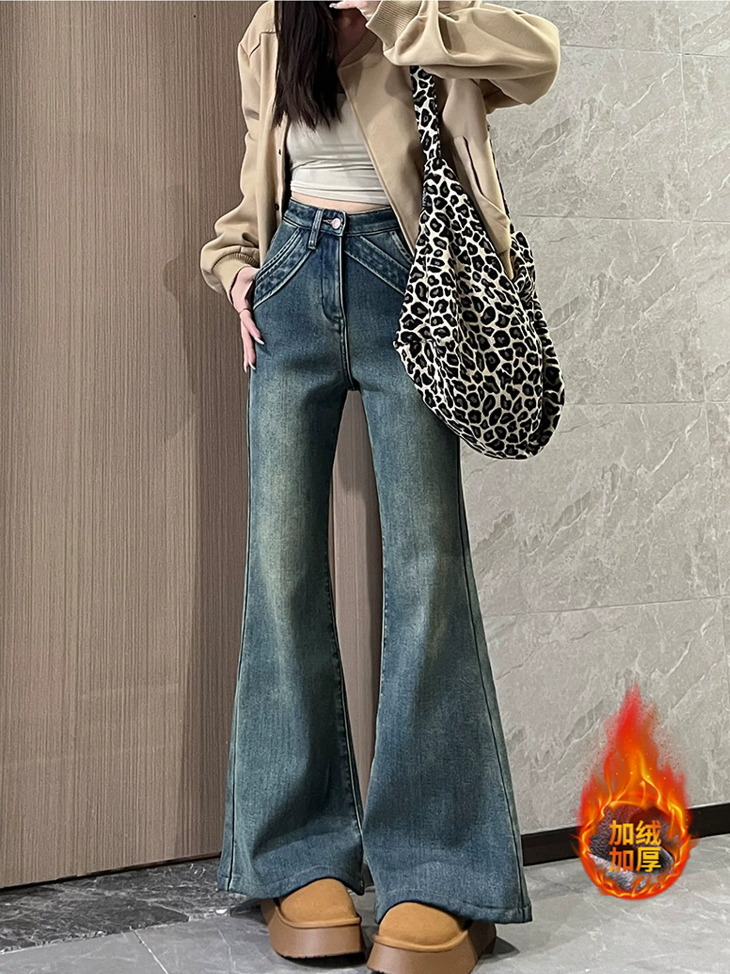 - Quần jean nữ ống loe cạp cao dày dặn lót lông cừu, thu đông 2025, size lớn, co giãn, tôn dáng, kiểu bootcut