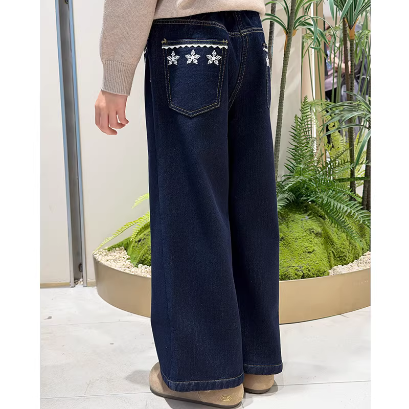 Quần jean nữ ống loe lót lông cừu, kiểu thu đông 2025, thêu hình bông tuyết, quần cạp cao, quần ống chuông tôn dáng nhỏ nhắn