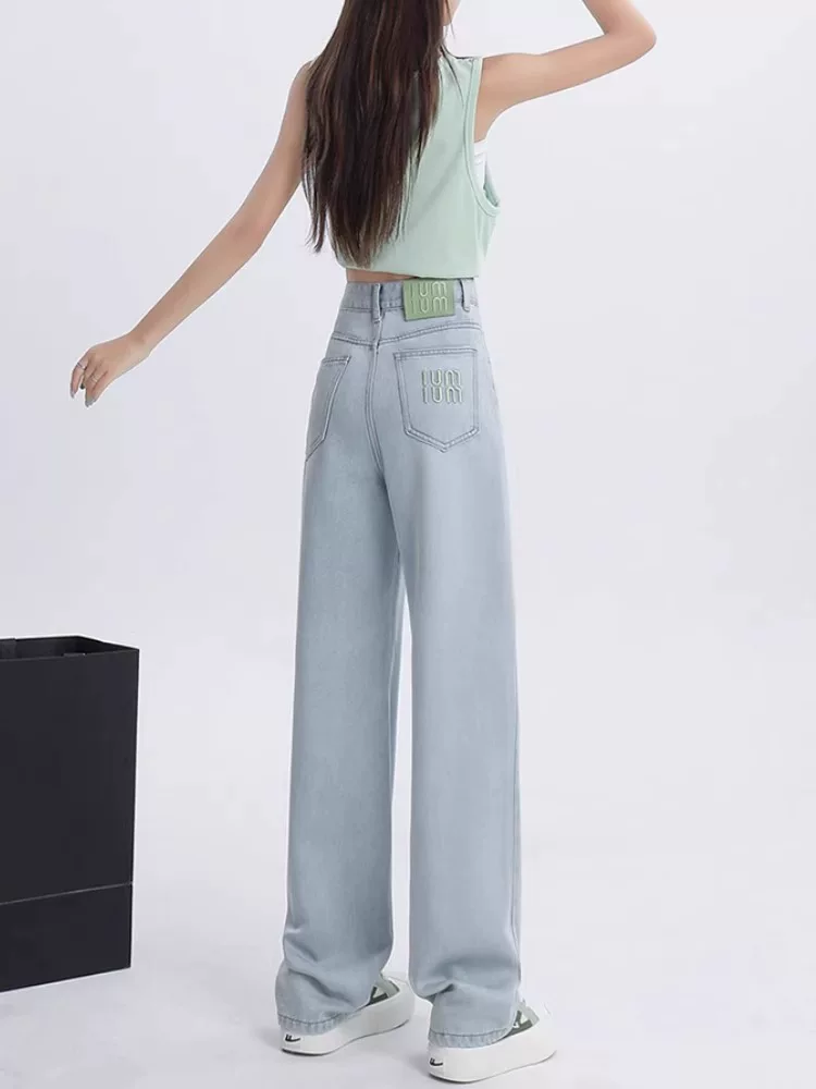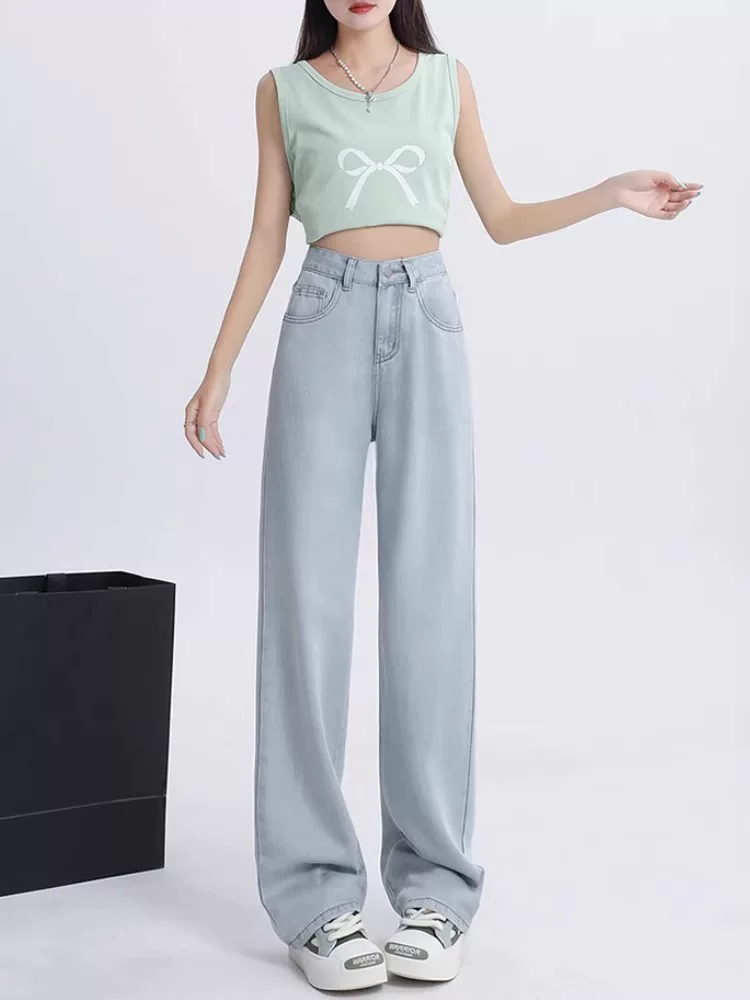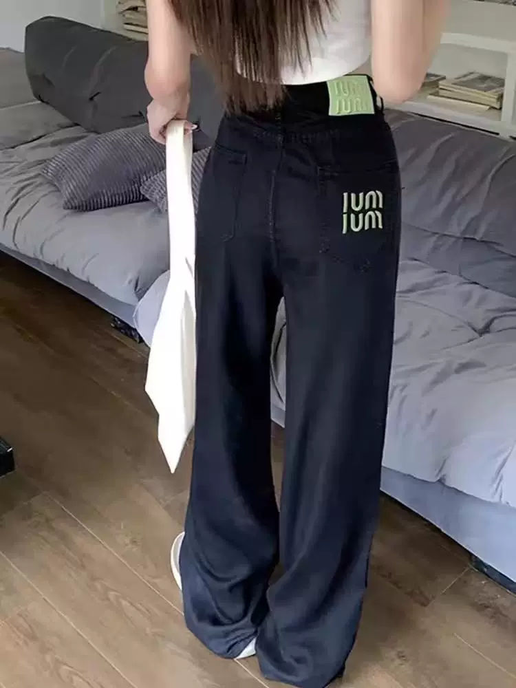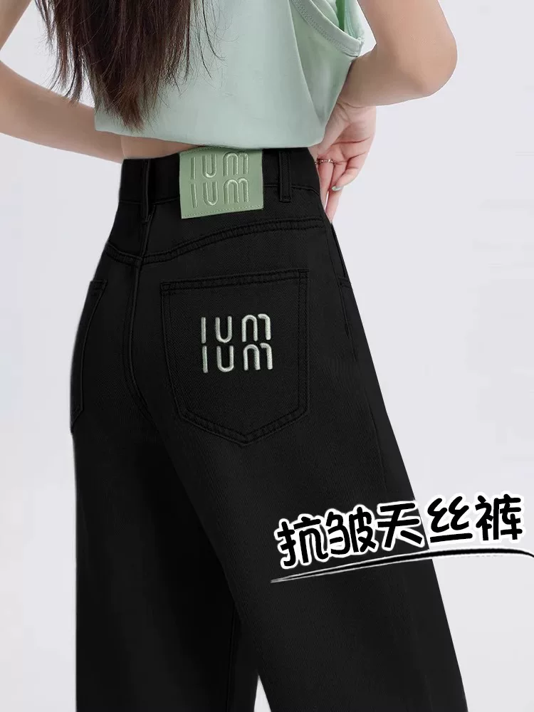 Quần jean ống đứng bằng vải lụa đen dành cho nữ, kiểu dáng mỏng mùa hè, cỡ lớn, lưng cao, mềm mại, thon gọn, quần ống rộng Tencel