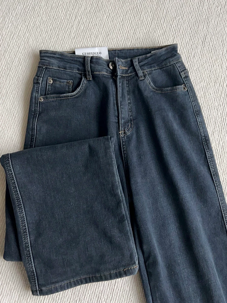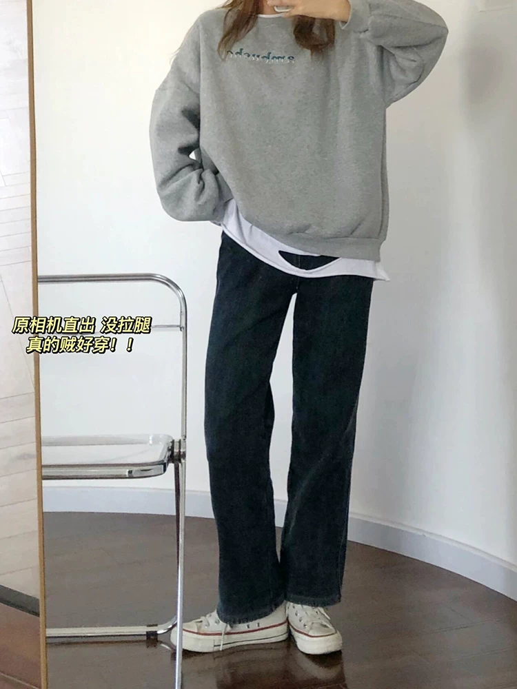 Quần jean ống đứng cho nữ, cỡ lớn, mùa thu đông, lót lông cừu, dày dặn, cạp cao, che hông, giảm béo, quần thuốc lá, dáng quả lê
