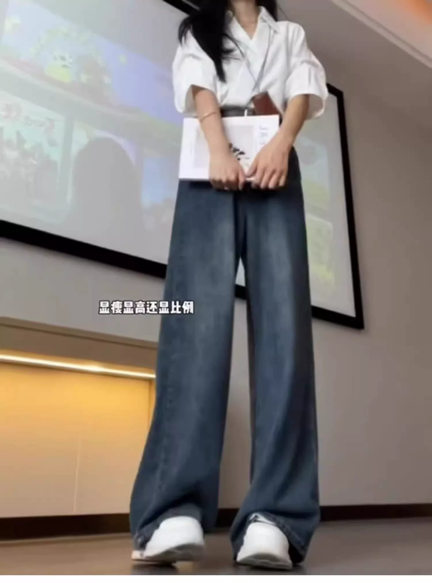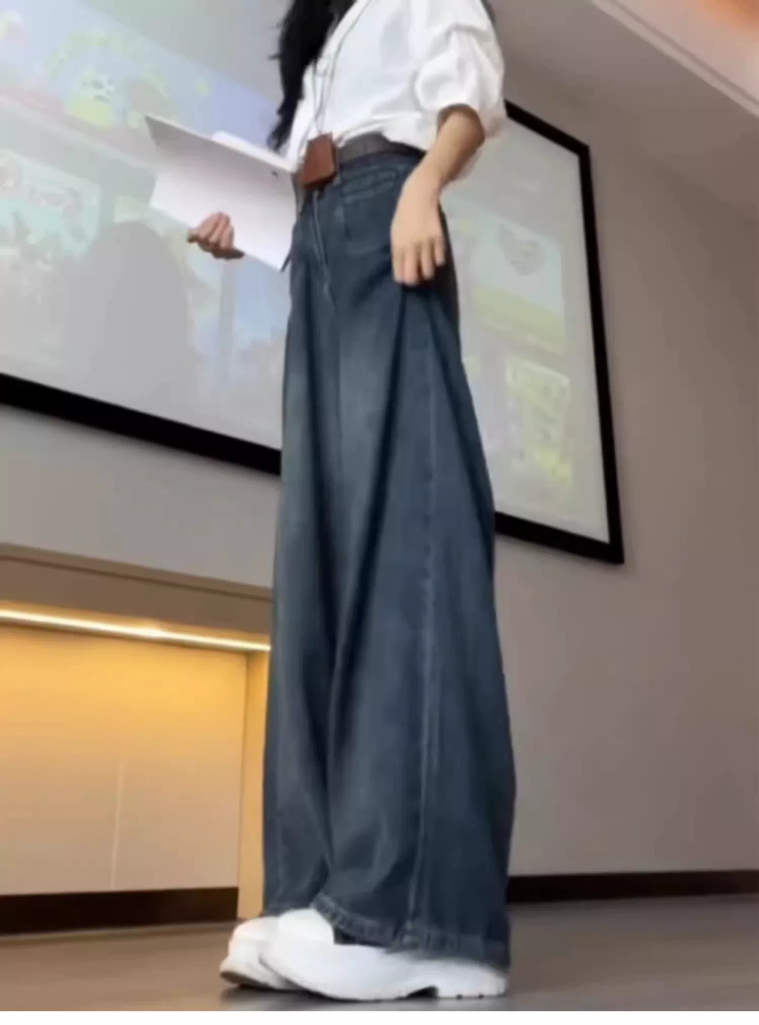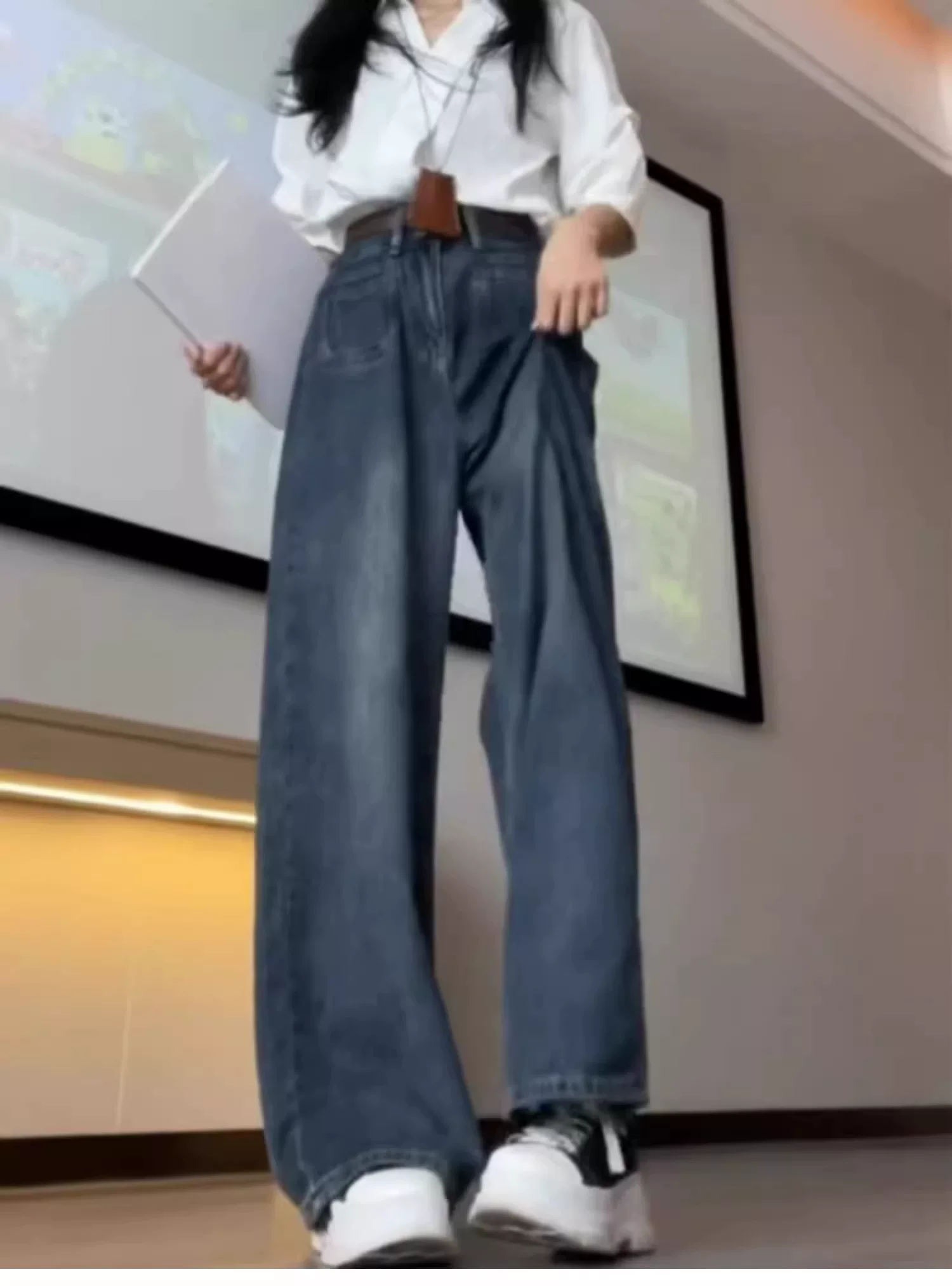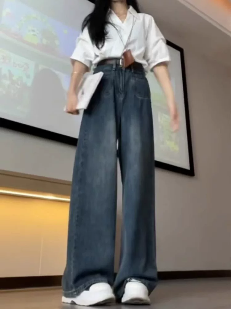 - Quần jean ống đứng cho nữ, kiểu dáng mùa thu mới, cỡ lớn, lưng cao, dáng rộng, che hông, giảm béo, quần ống rộng dáng chữ A mềm mại