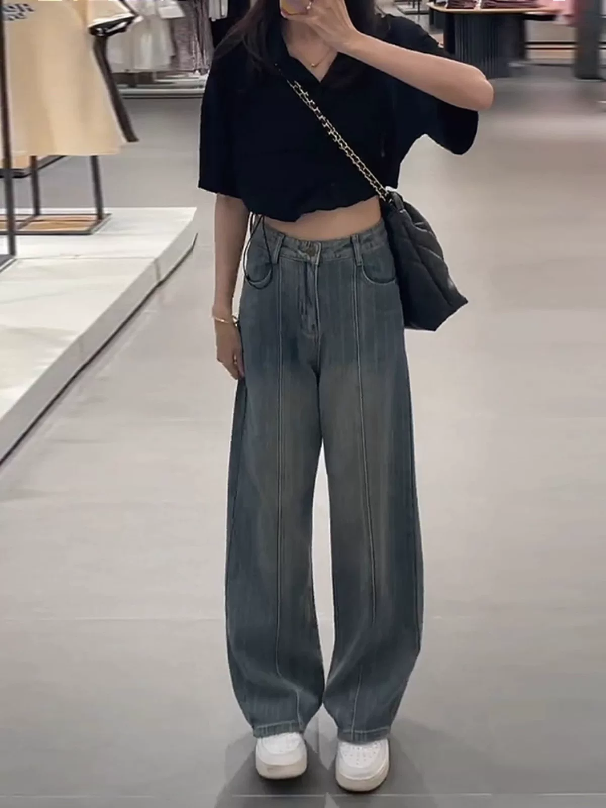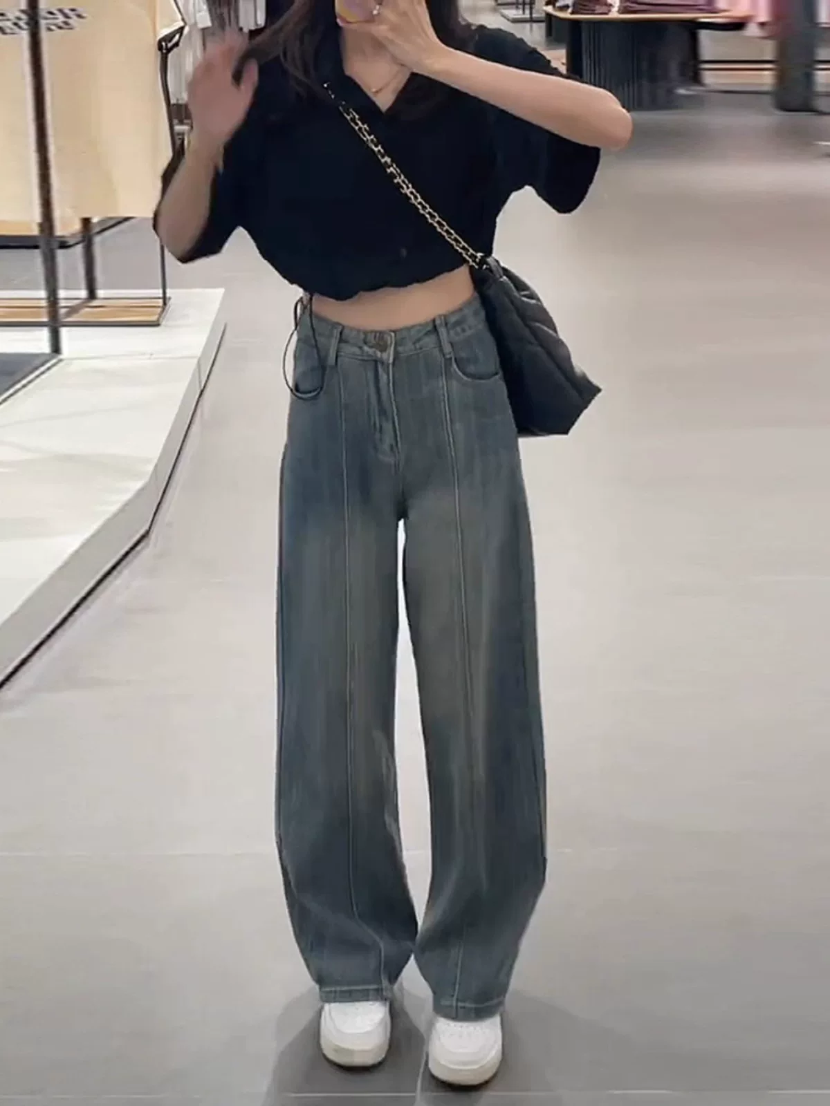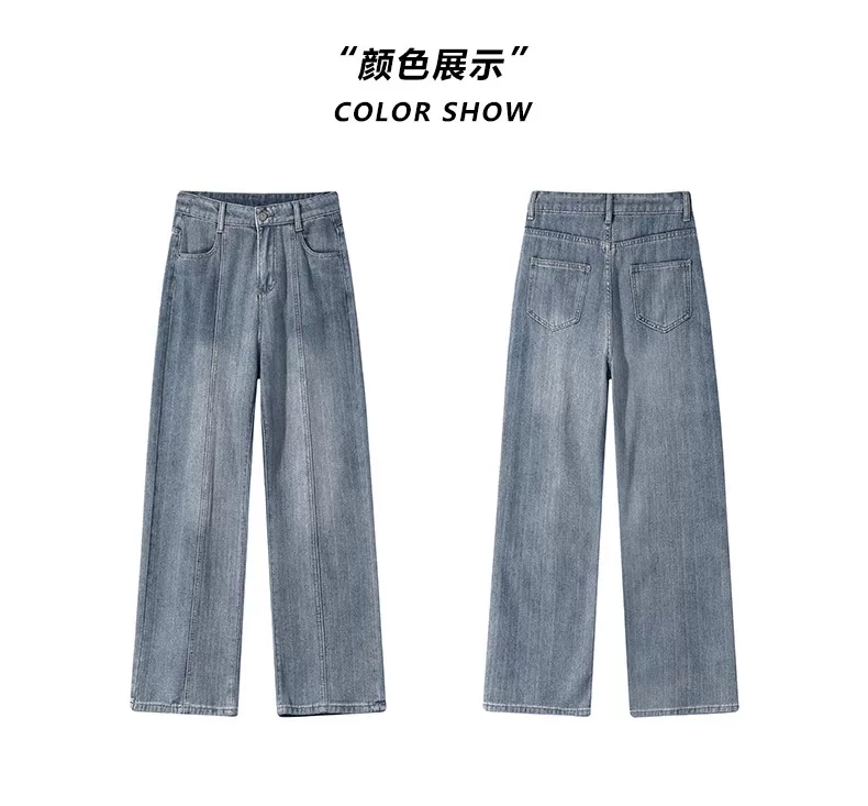 Quần jean ống đứng cổ điển dành cho nữ, cỡ lớn, thiết kế đầu thu, lưng cao, dáng rộng, che hông, giảm béo, quần ống rộng