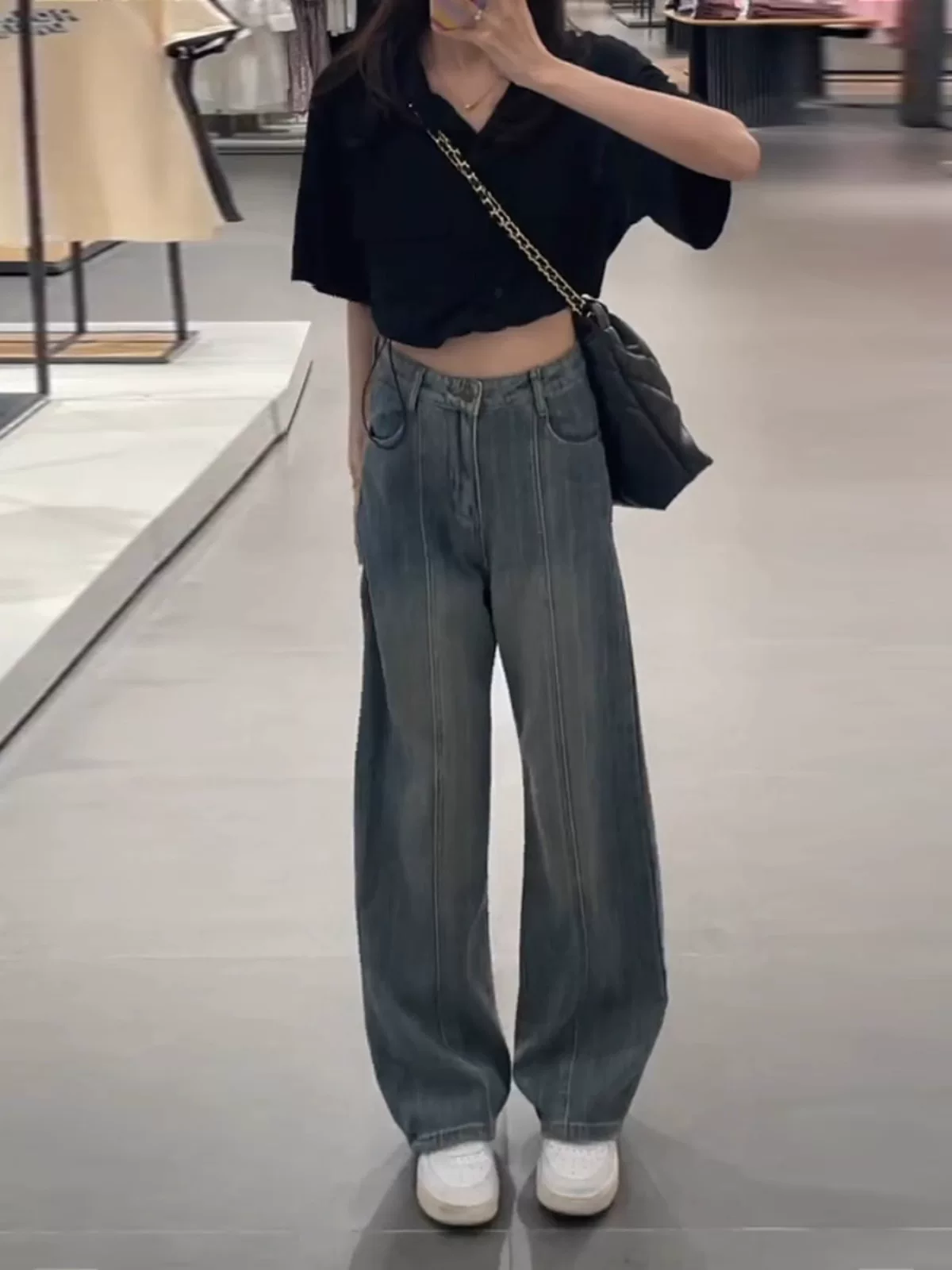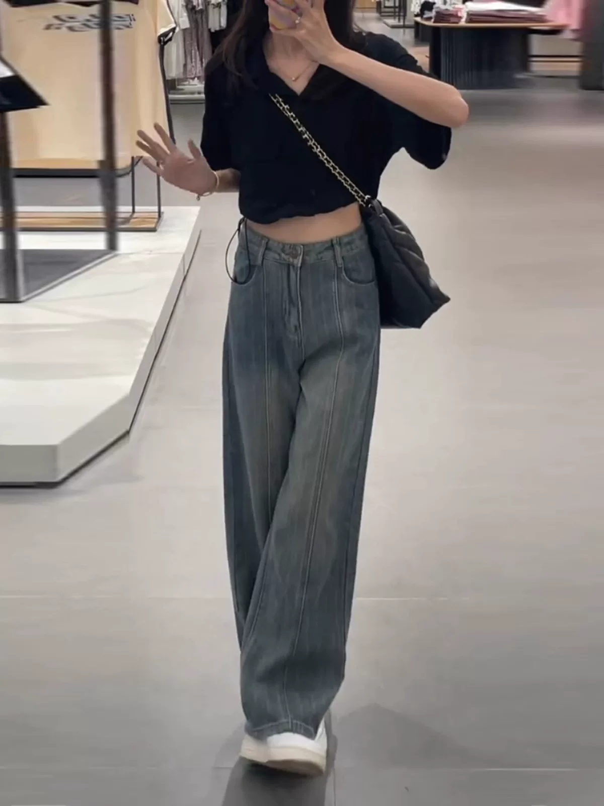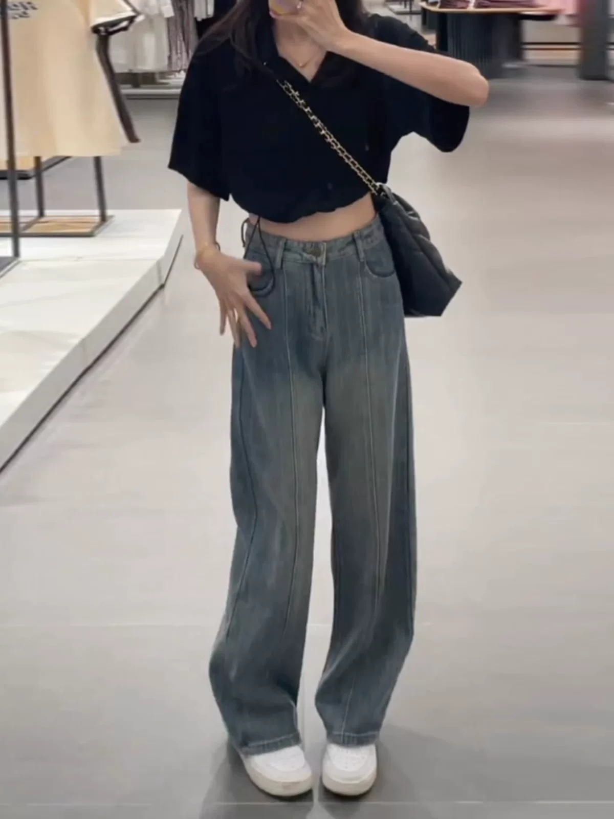 Quần jean ống đứng cổ điển dành cho nữ, cỡ lớn, thiết kế đầu thu, lưng cao, dáng rộng, che hông, giảm béo, quần ống rộng