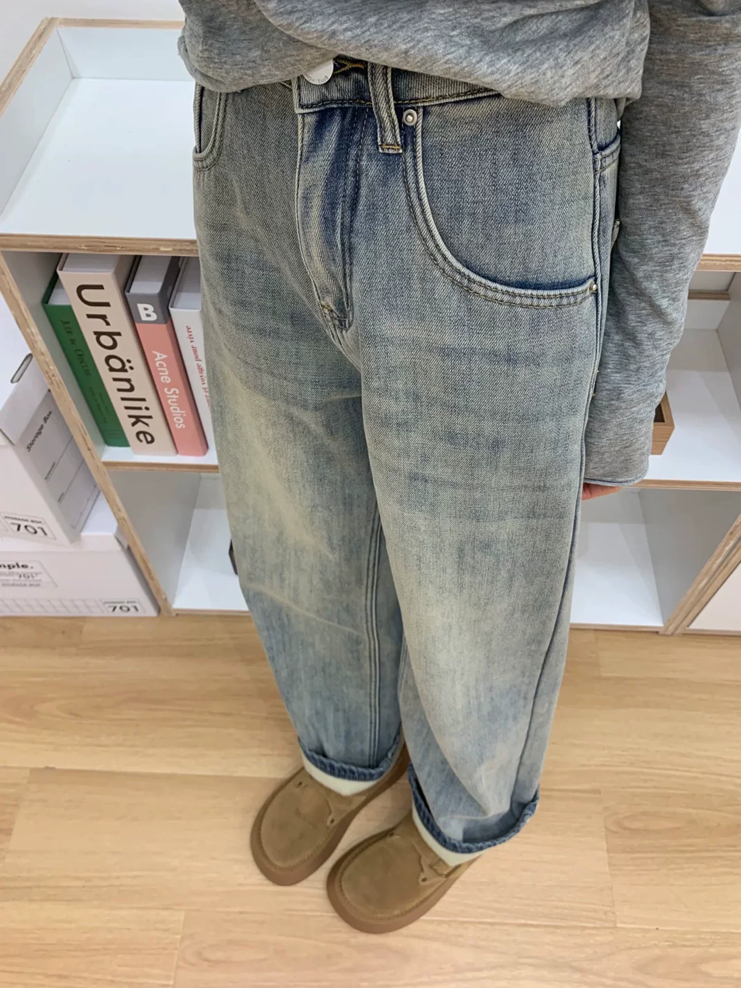 - Quần jean ống đứng cổ điển dành cho nữ, lót lông cừu, dày, cỡ lớn, lưng cao, rộng rãi, tôn dáng, dành cho người có thân hình quả lê, quần ống rộng