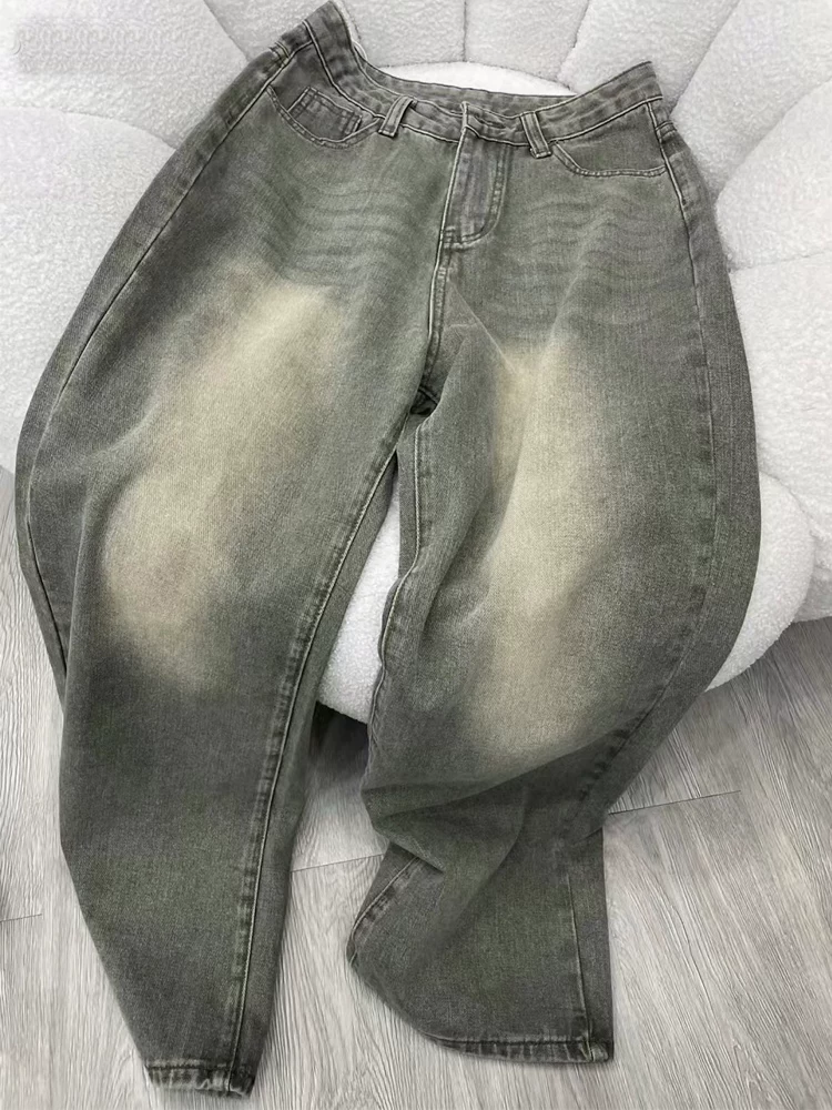Quần jean ống đứng cổ điển màu xanh bạc hà dành cho nữ, đầu thu, cỡ lớn, lưng cao, dáng rộng, dáng rộng, quần ống rộng dáng rộng