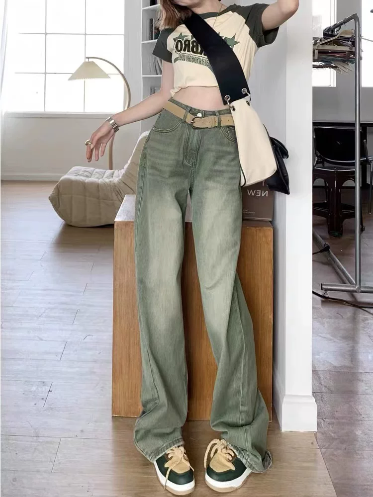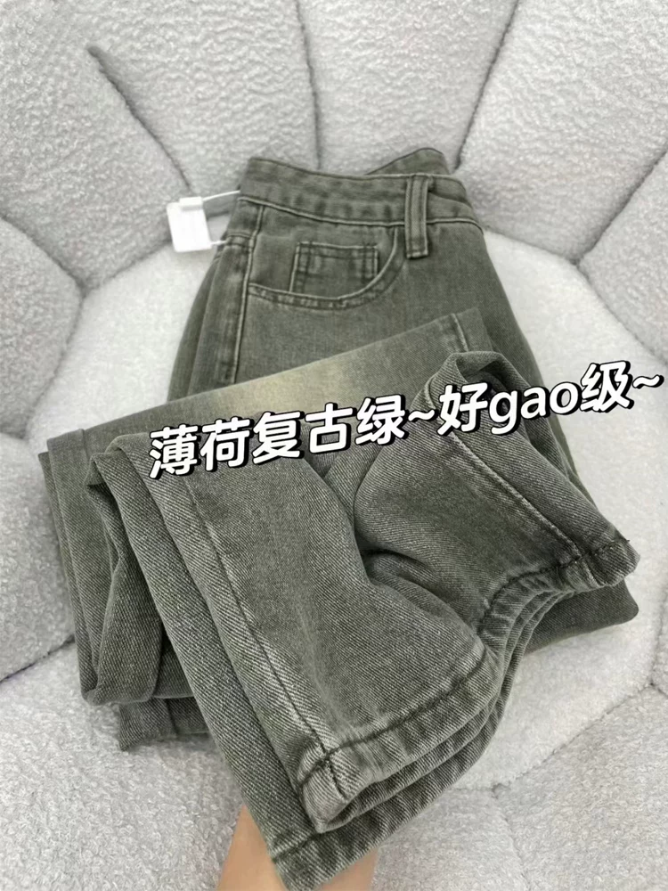 - Quần jean ống đứng cổ điển màu xanh bạc hà dành cho nữ, đầu thu, cỡ lớn, lưng cao, dáng rộng, dáng rộng, quần ống rộng dáng rộng