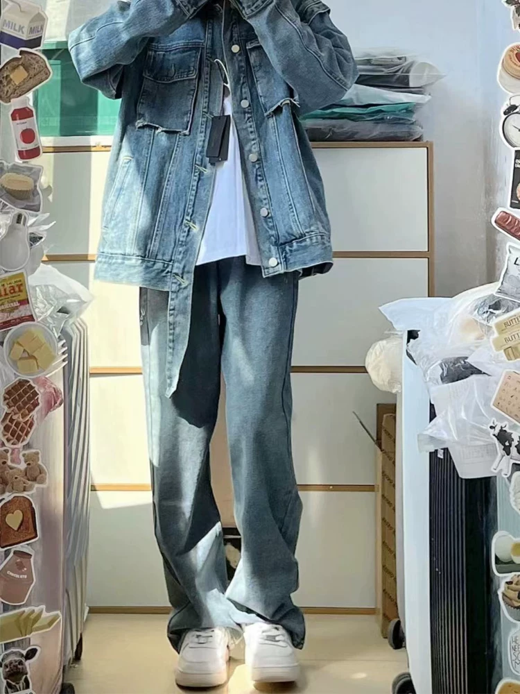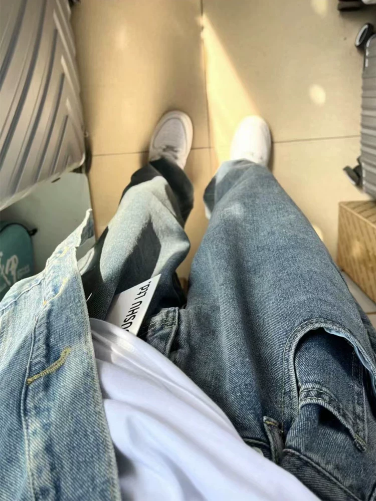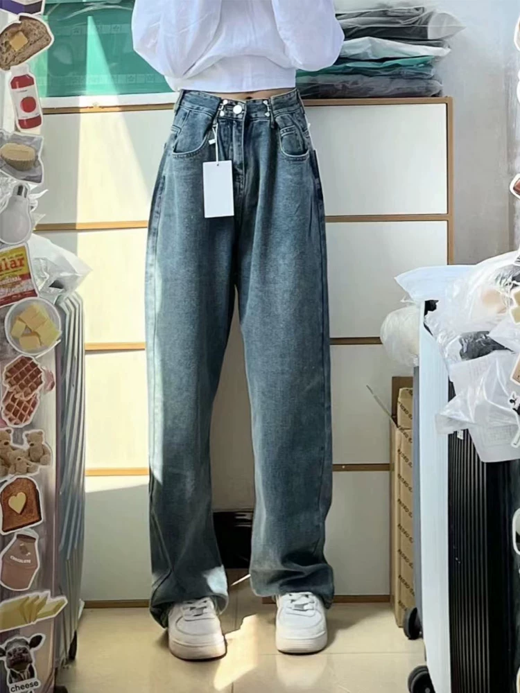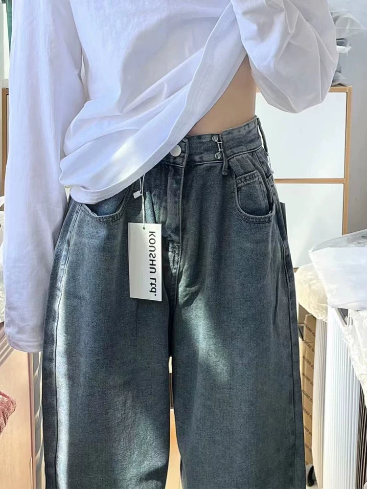 Quần jean ống đứng có thể điều chỉnh dáng quả lê dành cho nữ, cỡ lớn, mùa thu, lưng cao, dáng rộng, che hông, quần ống rộng giảm béo
