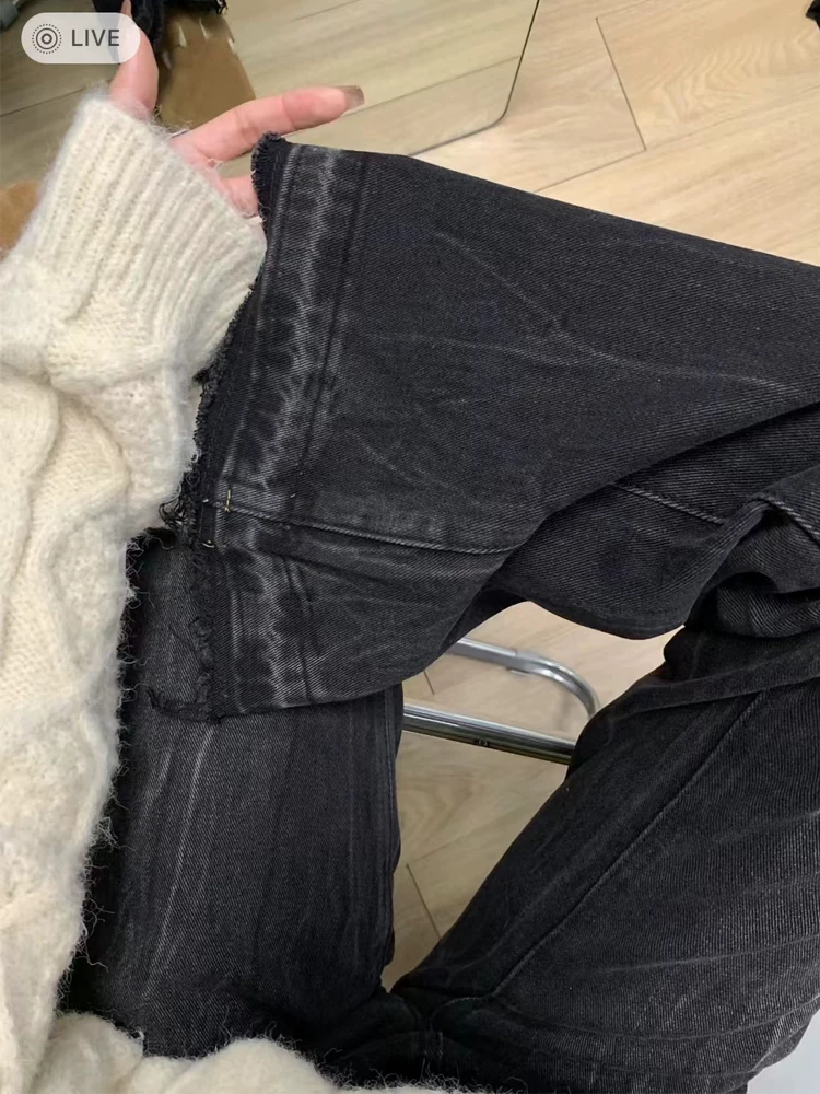 Quần jean ống đứng dành cho nữ, kiểu thu đông, lót lông cừu, cỡ lớn, màu đen và xám, không bó sát ở chân, cạp cao, quần ống loe che hông.