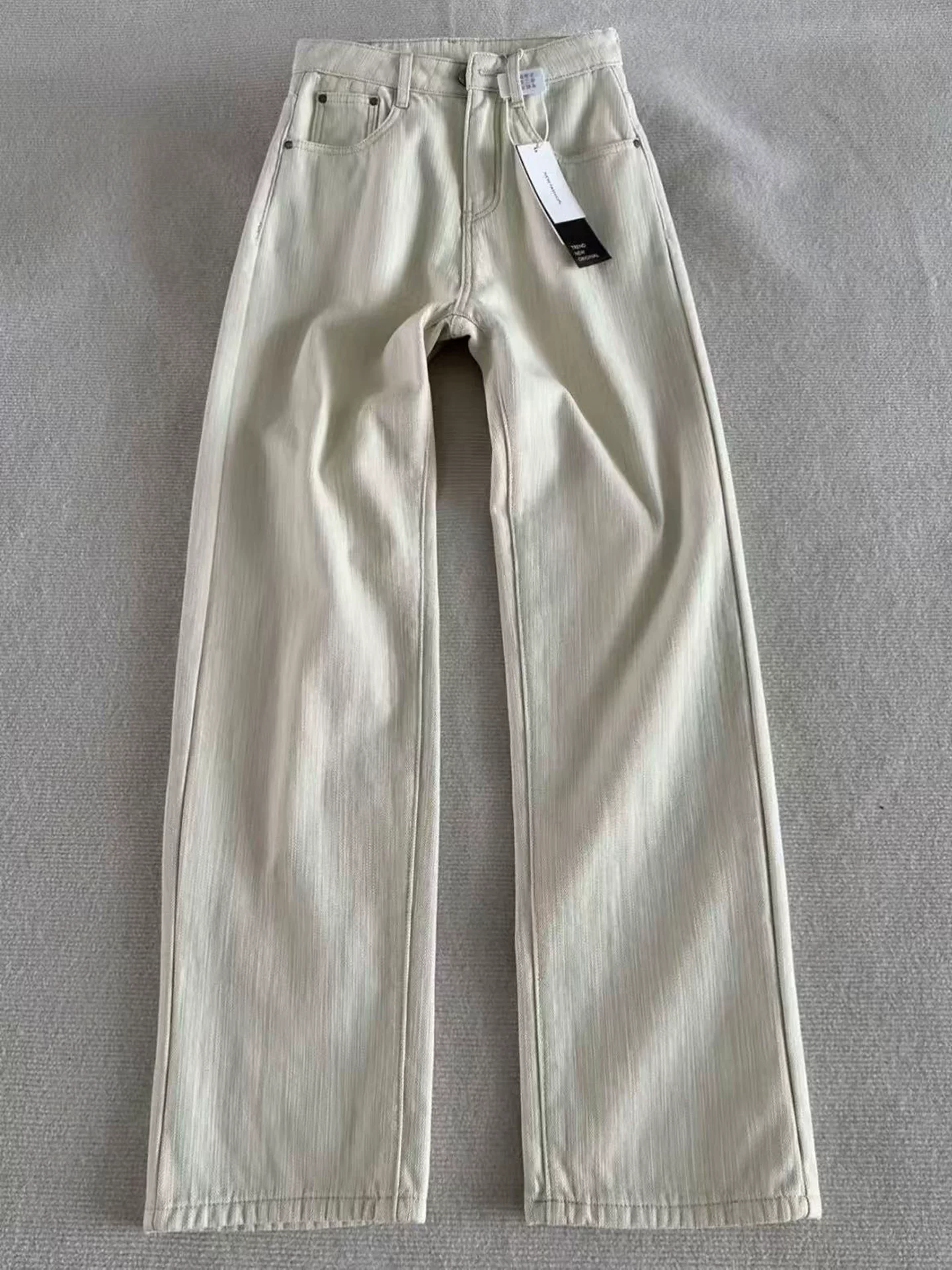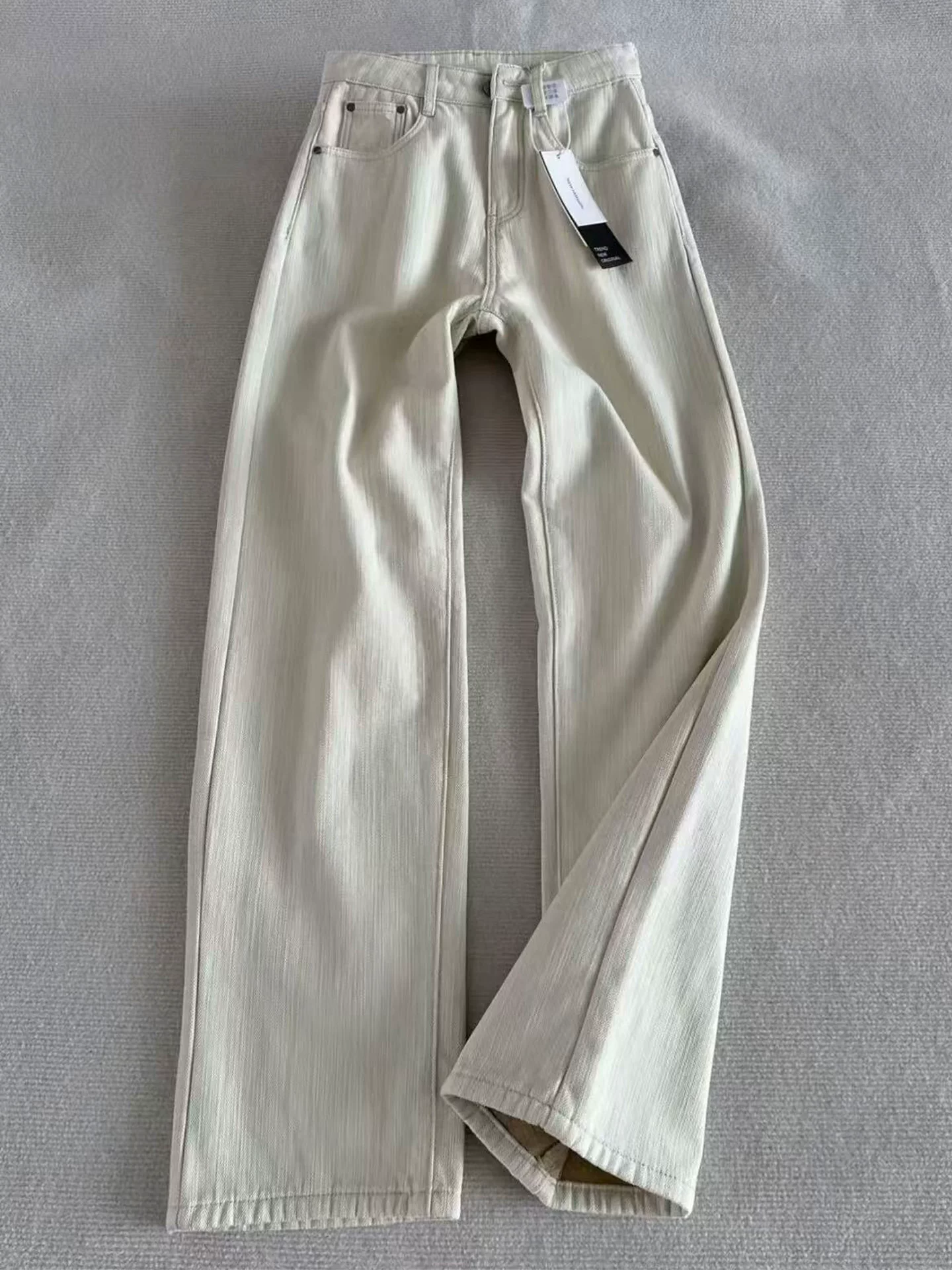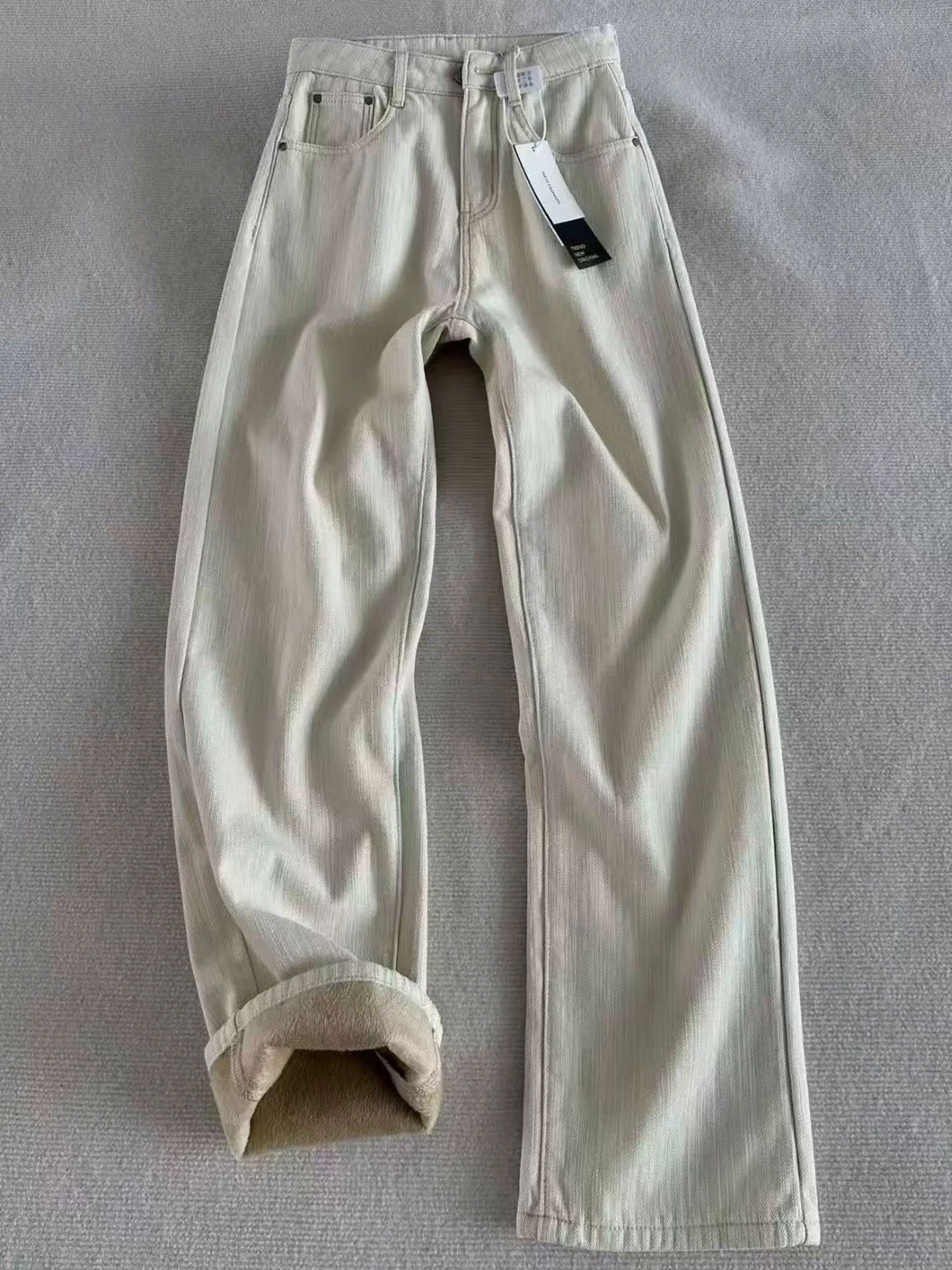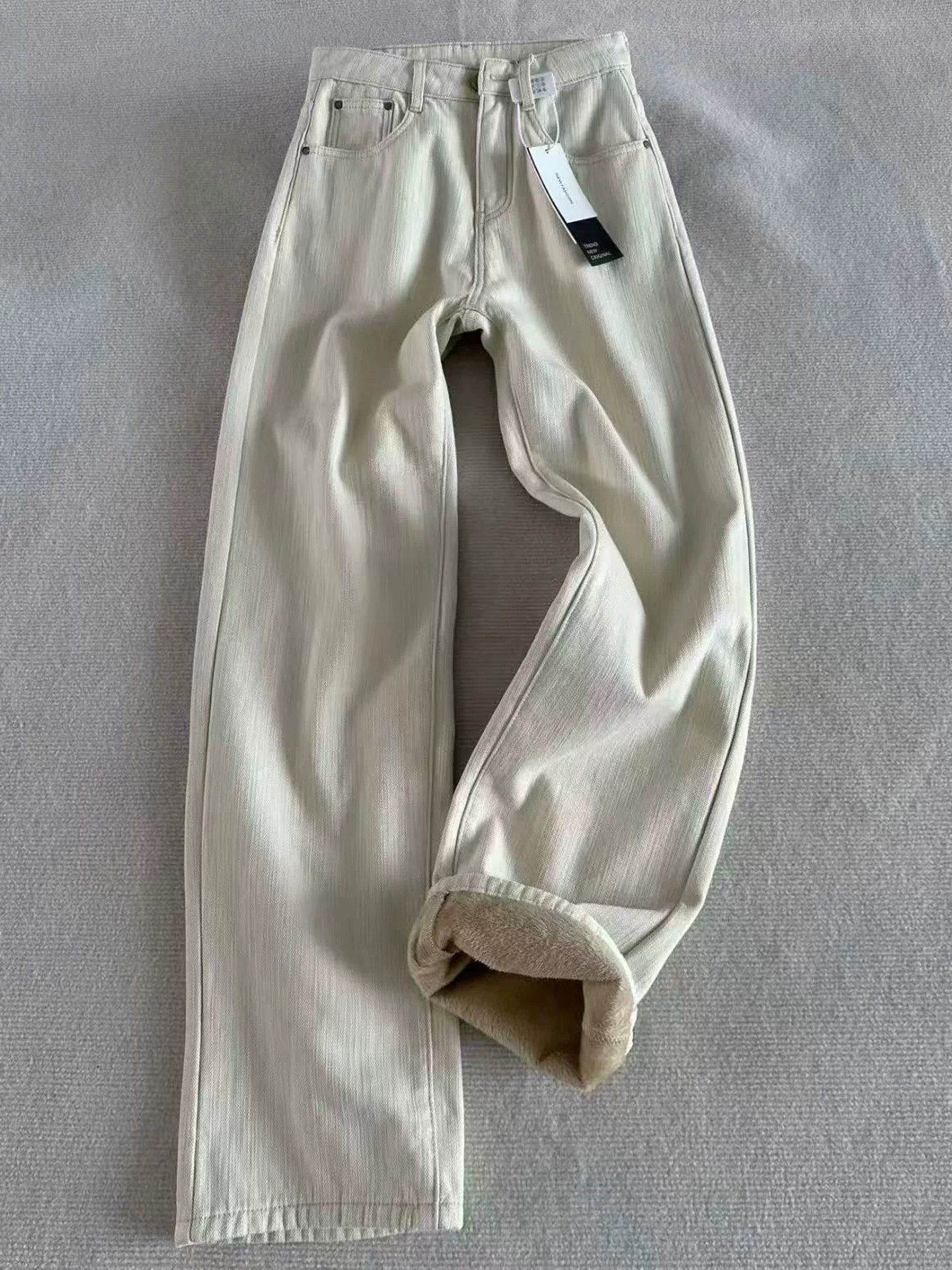 Quần jean ống đứng dày lót lông màu trắng nhạt dành cho nữ, mùa thu đông, cỡ lớn, lưng cao, dáng rộng, dáng quả lê, quần ống rộng