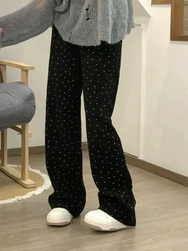 Quần jean ống đứng họa tiết hoa chấm bi phong cách Hàn Quốc dành cho nữ, đầu thu, cỡ lớn, lưng cao, dáng rộng, dáng rộng, quần dài ống rộng