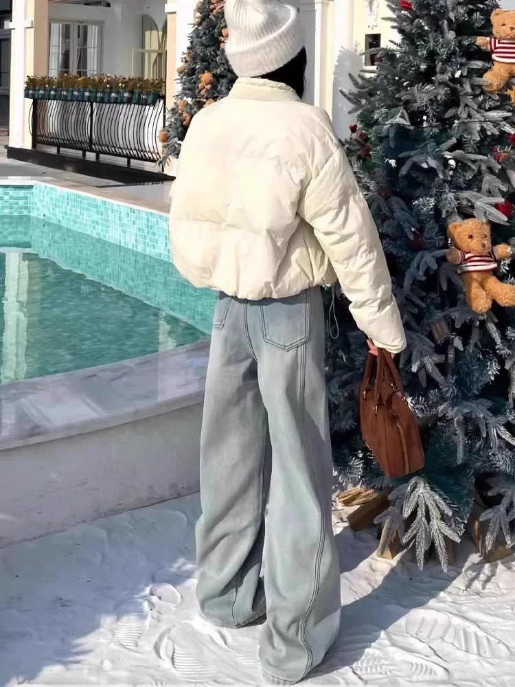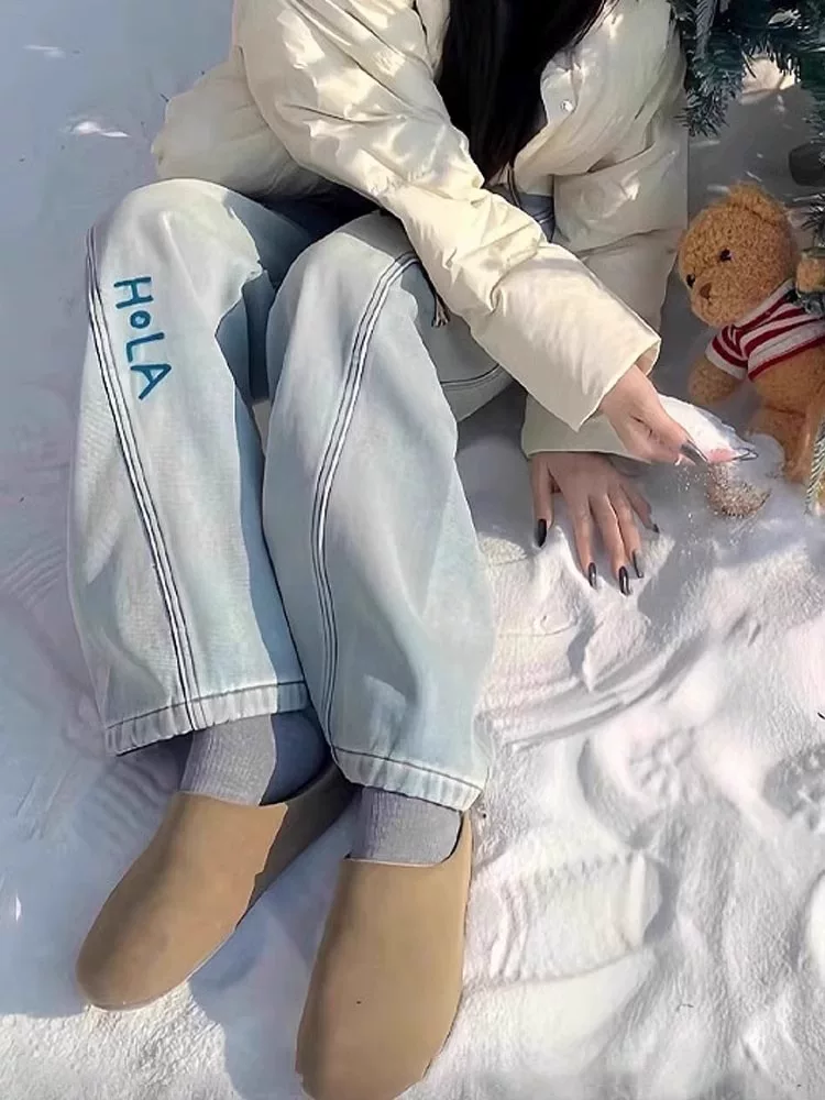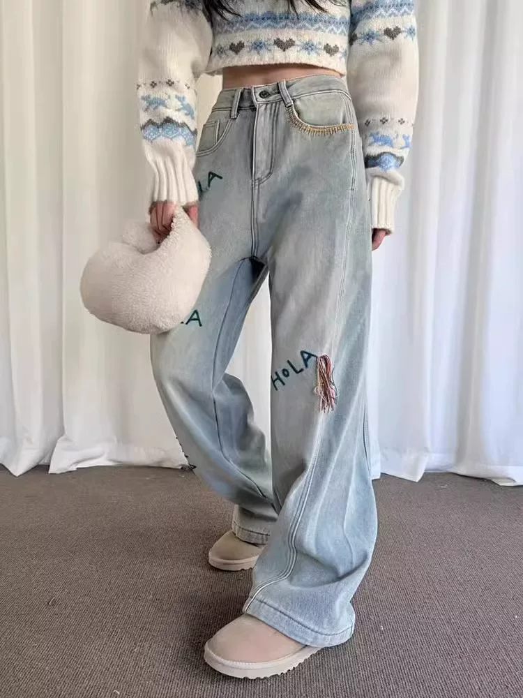 - Quần jean ống đứng kiểu Mỹ màu xanh nhạt dành cho nữ, mùa xuân 2025, size lớn, cạp cao, tôn dáng, thêu chữ, quần ống rộng