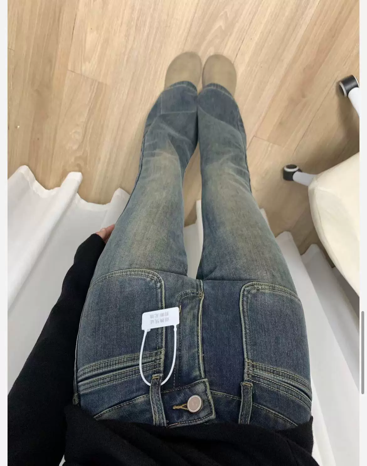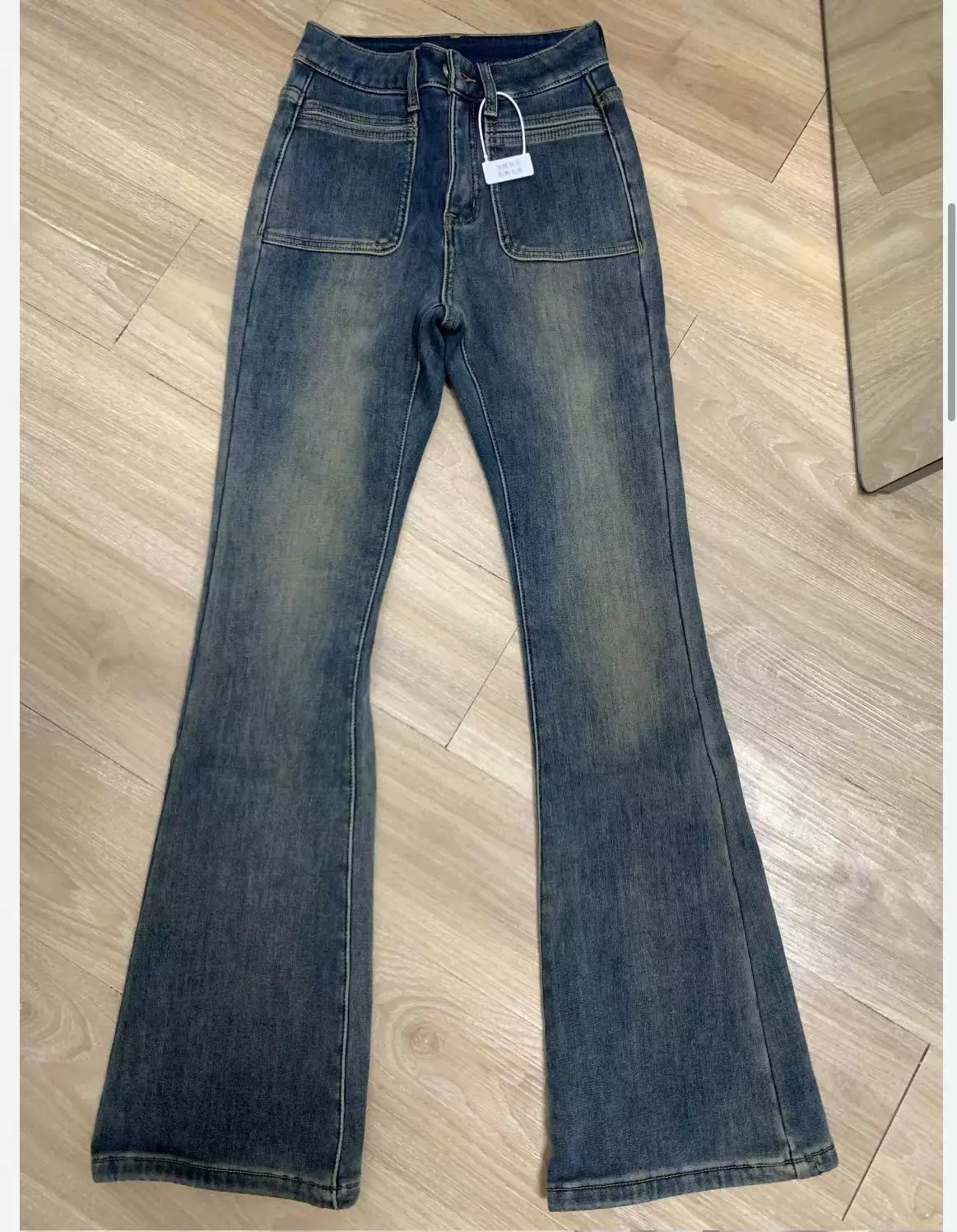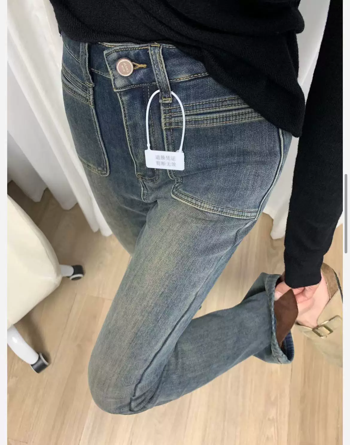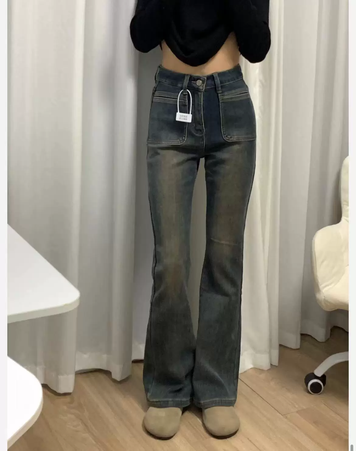 - Quần jean ống đứng loe dành cho nữ, mùa thu đông, cỡ lớn, dày dặn có lót lông cừu, không bó sát ở chân, cạp cao, co giãn, quần ống loe che hông.
