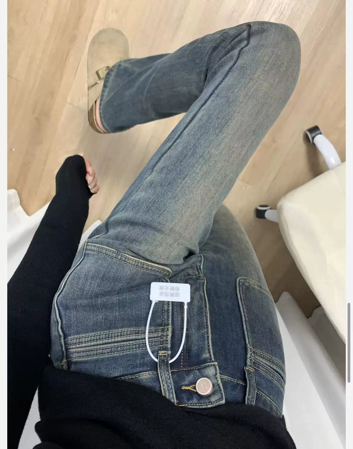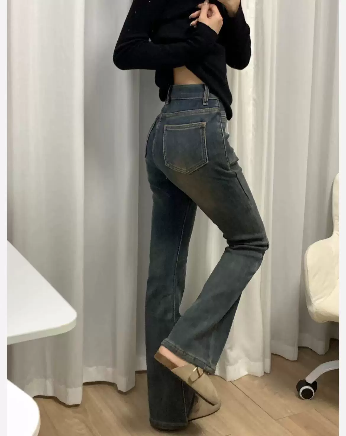 Quần jean ống đứng loe dành cho nữ, mùa thu đông, cỡ lớn, dày dặn có lót lông cừu, không bó sát ở chân, cạp cao, co giãn, quần ống loe che hông.