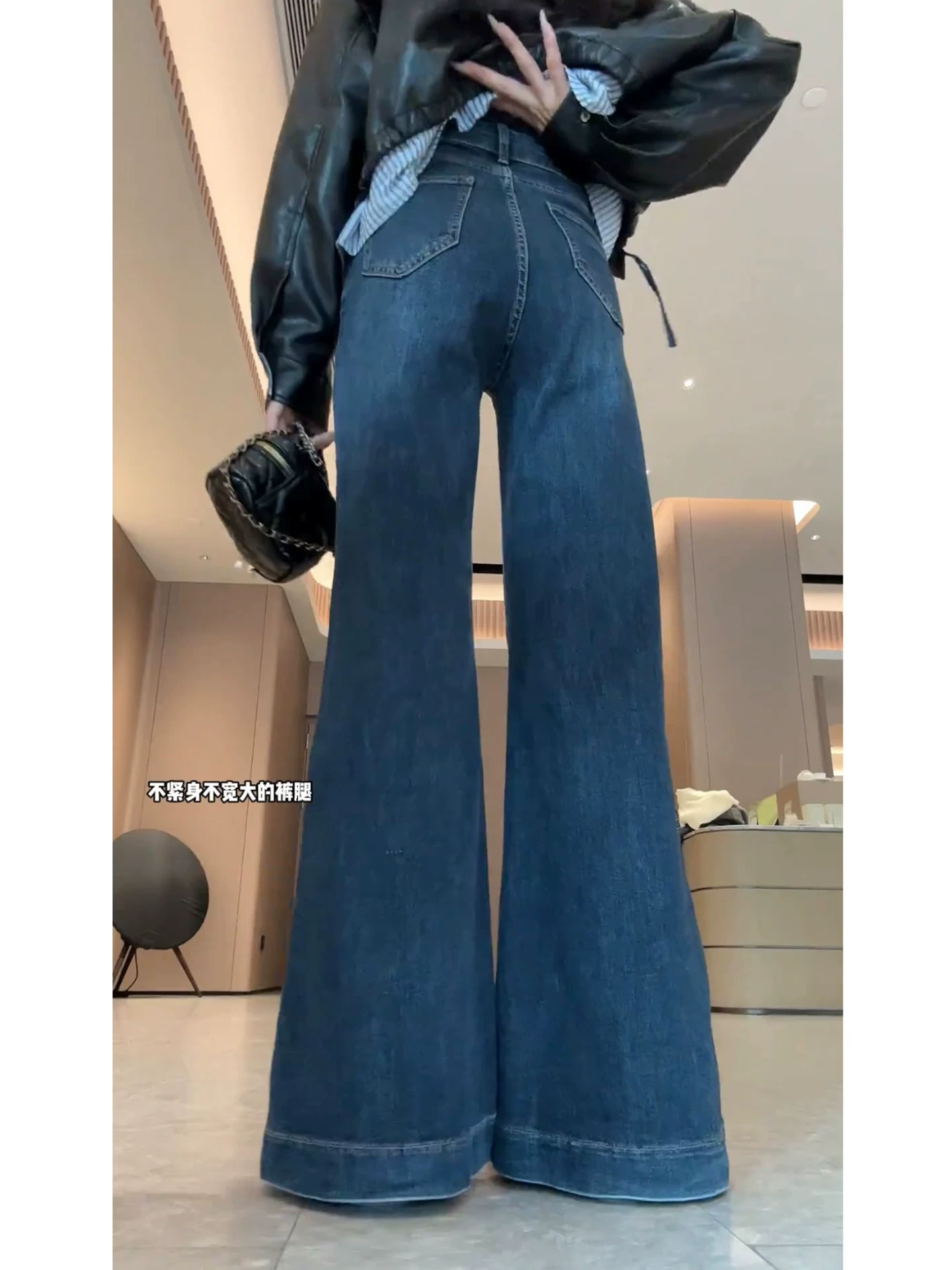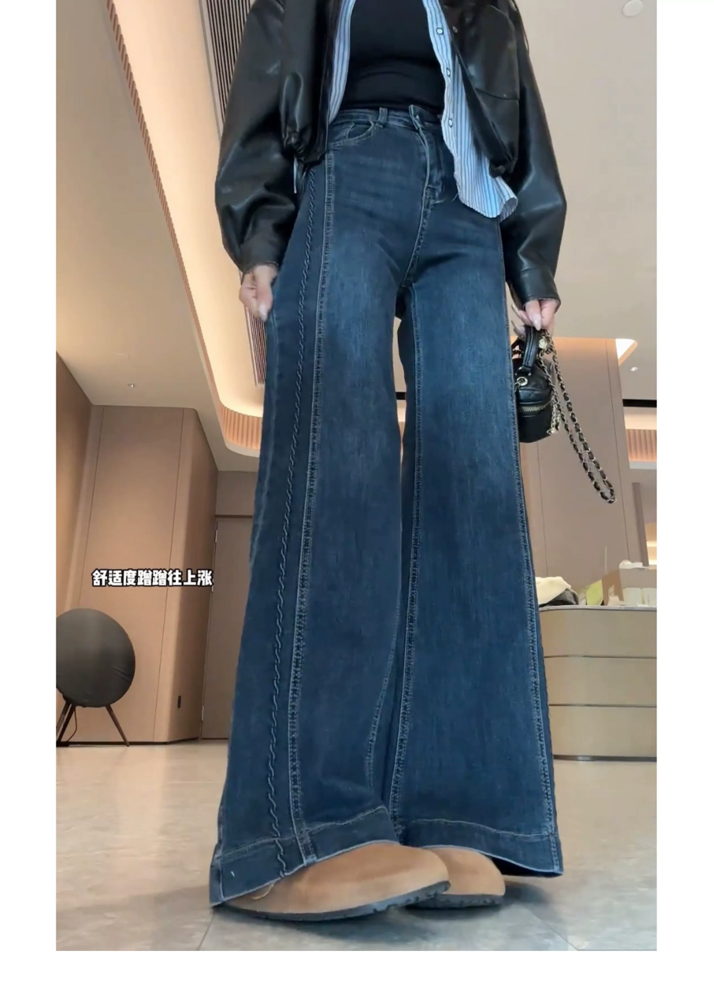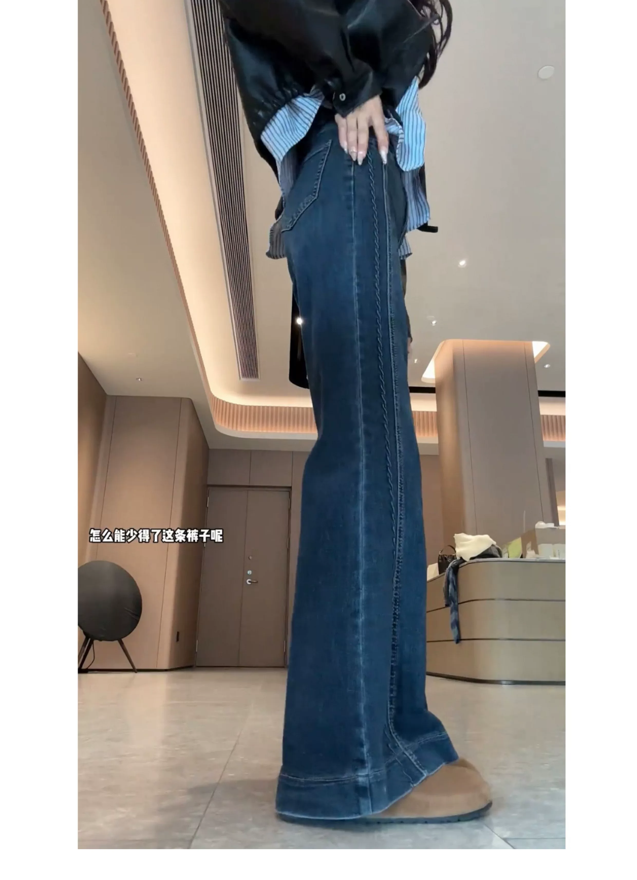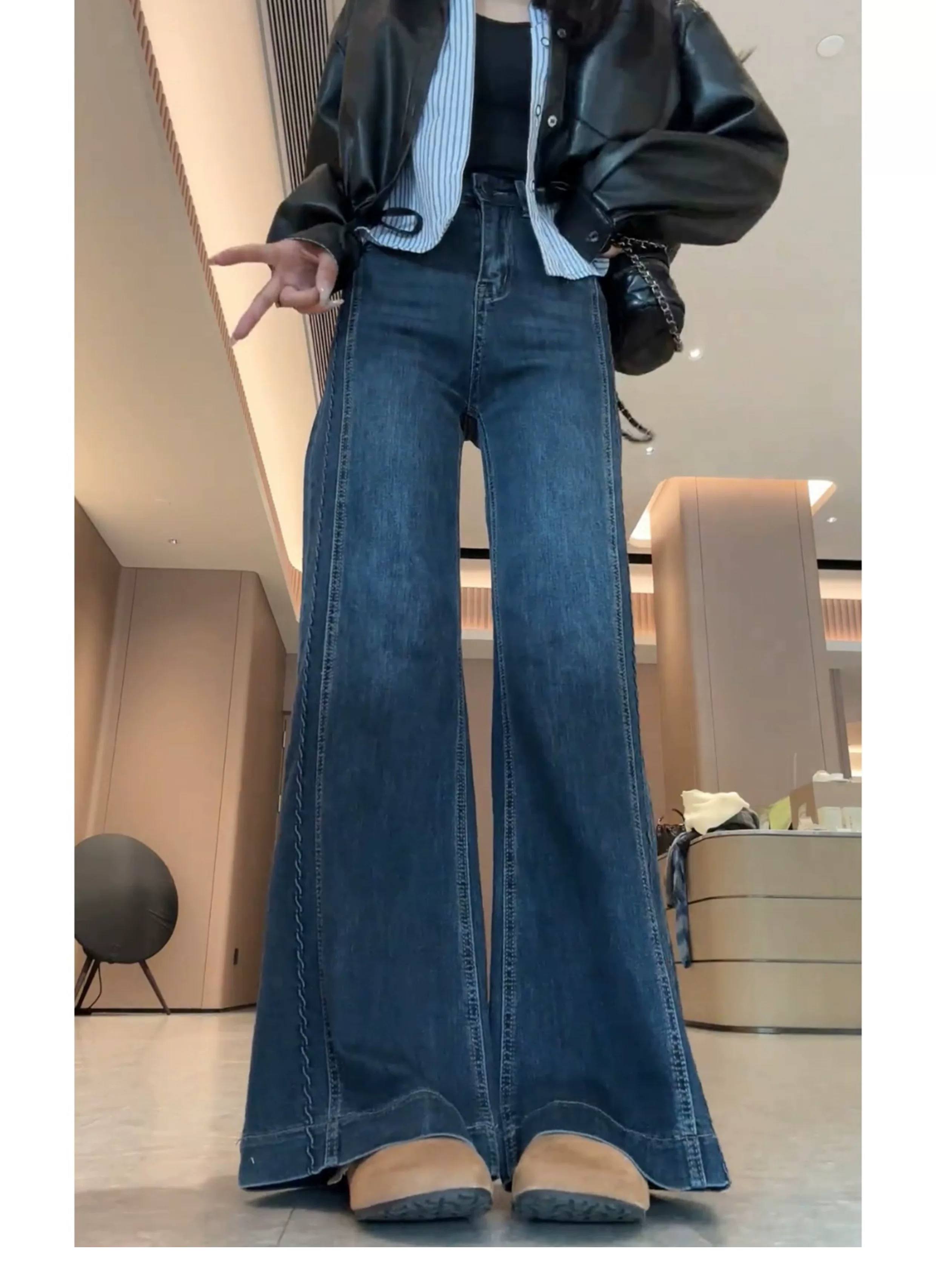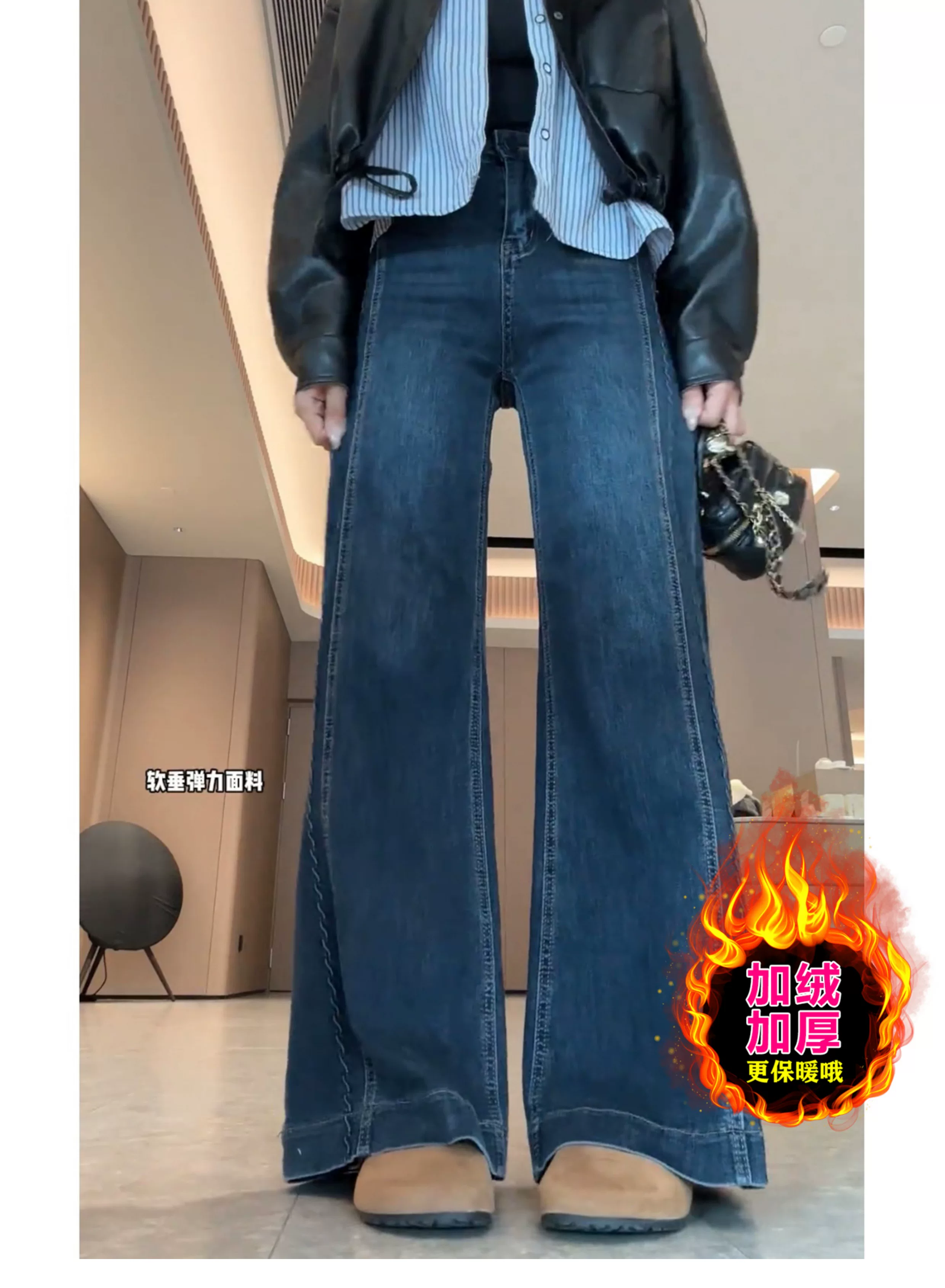 Quần jean ống đứng loe dành cho nữ, mùa thu đông, lót lông cừu, dày, cỡ lớn, lưng cao, giảm béo, dáng rộng, không bó sát, quần ống chuông