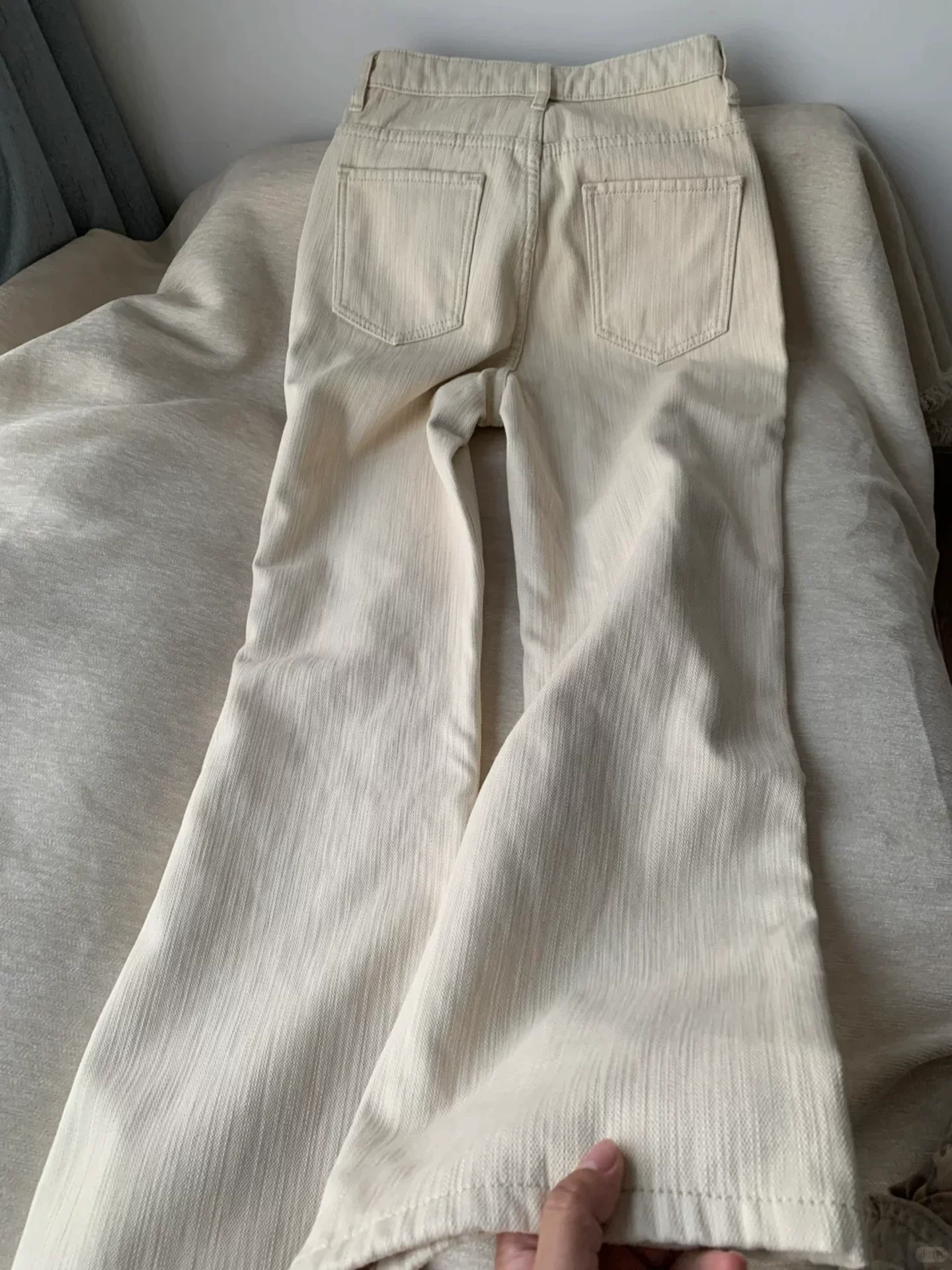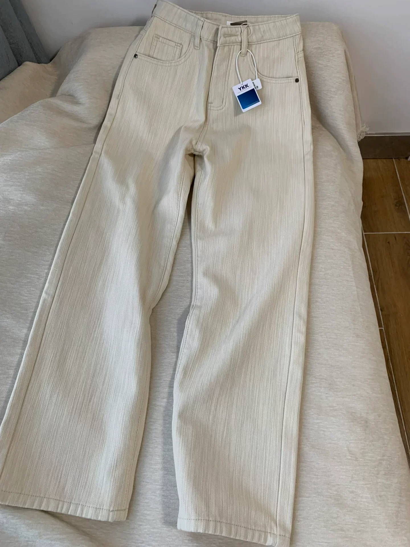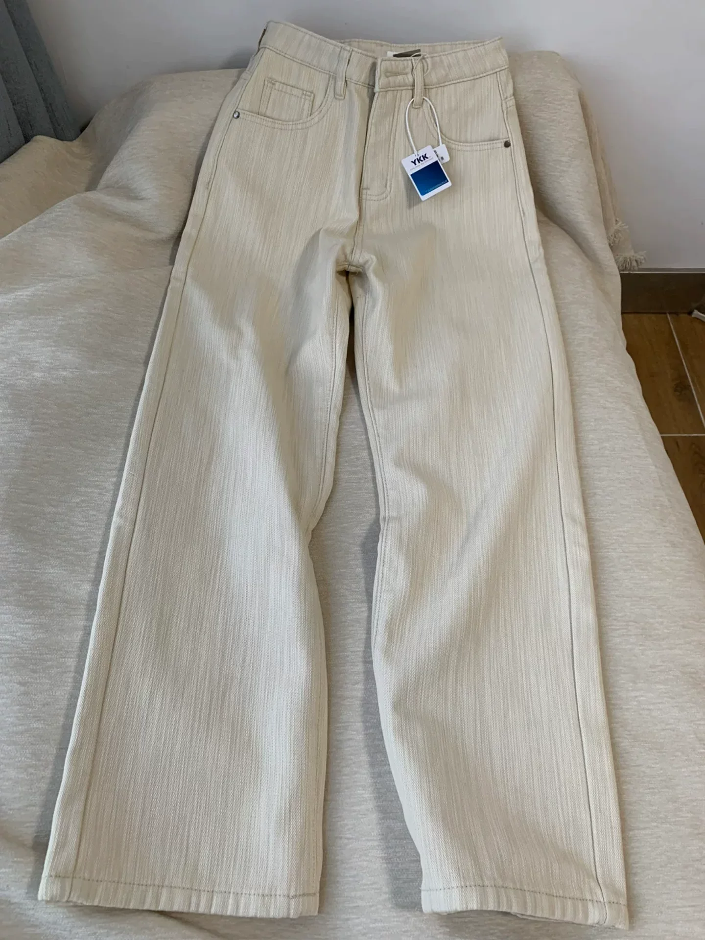 Quần jean ống đứng màu be dành cho nữ, mùa thu đông, lót lông cừu, dày, cỡ lớn, lưng cao, rộng, mềm mại, tôn dáng, quần ống rộng.