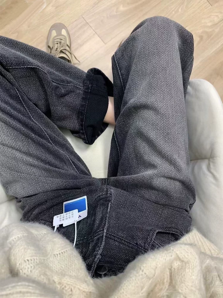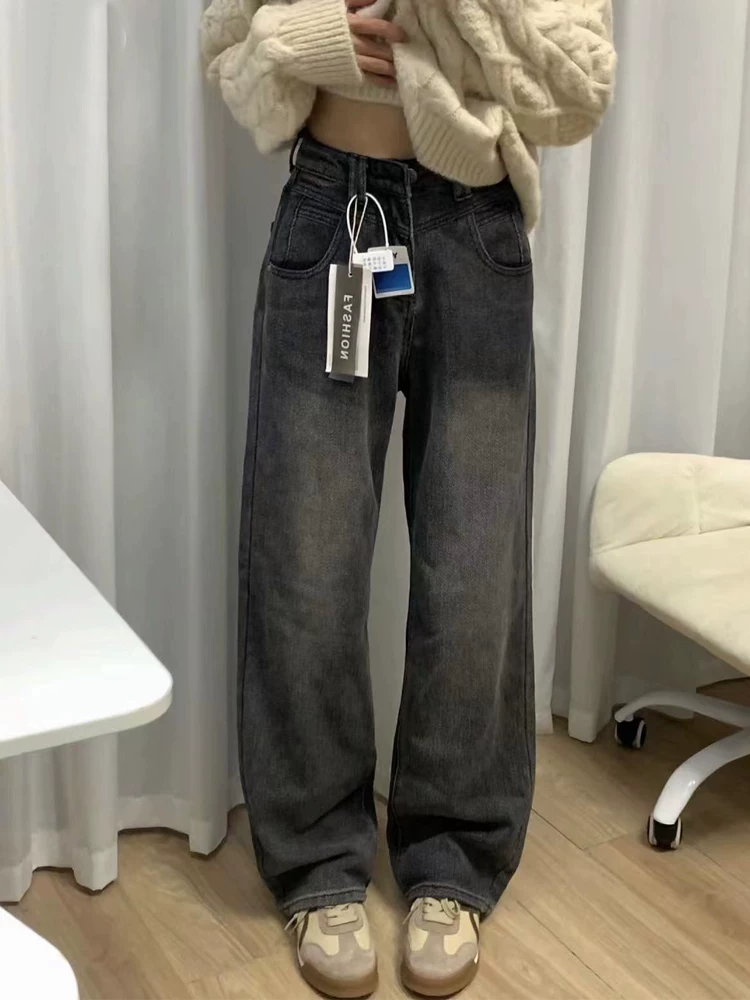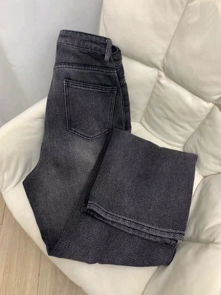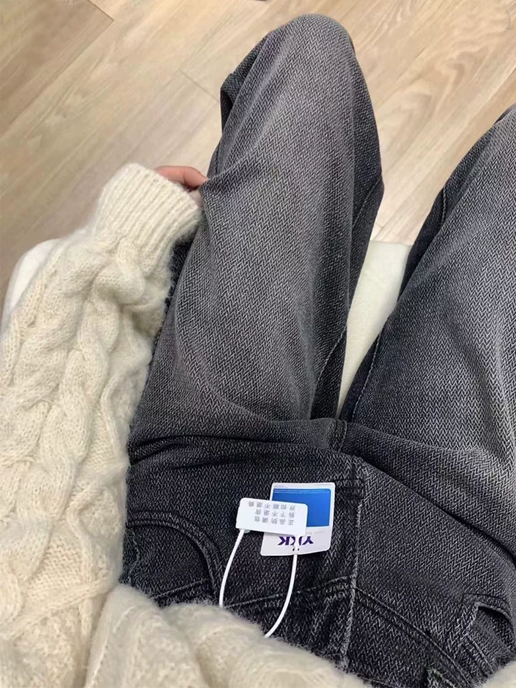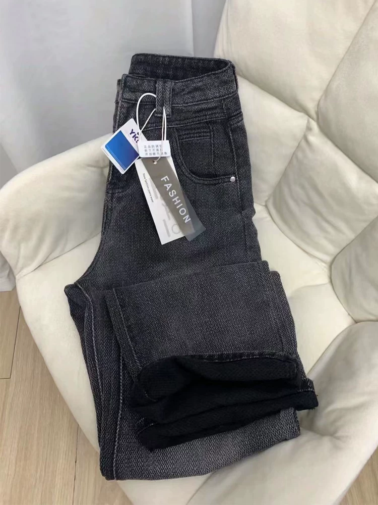 Quần jean ống đứng màu đen và xám dành cho nữ, mùa thu đông, cỡ lớn, lót lông cừu, dày dặn, lưng cao, dáng rộng, giảm béo, quần ống rộng.