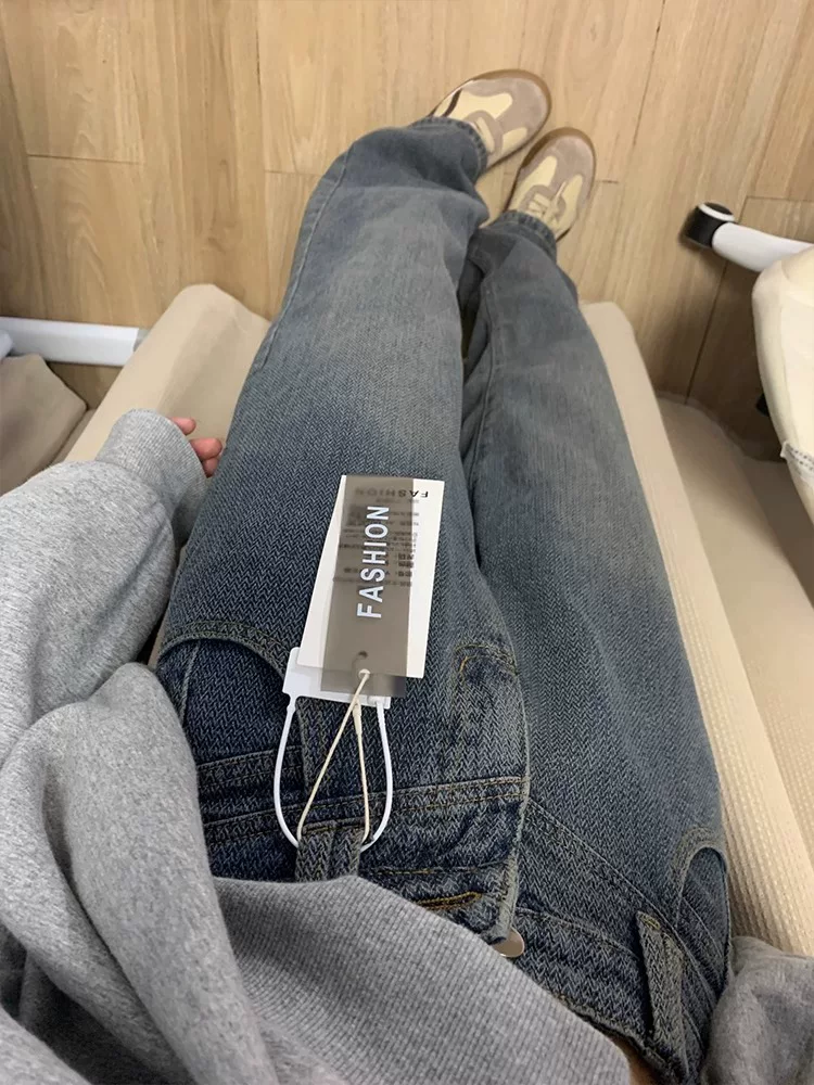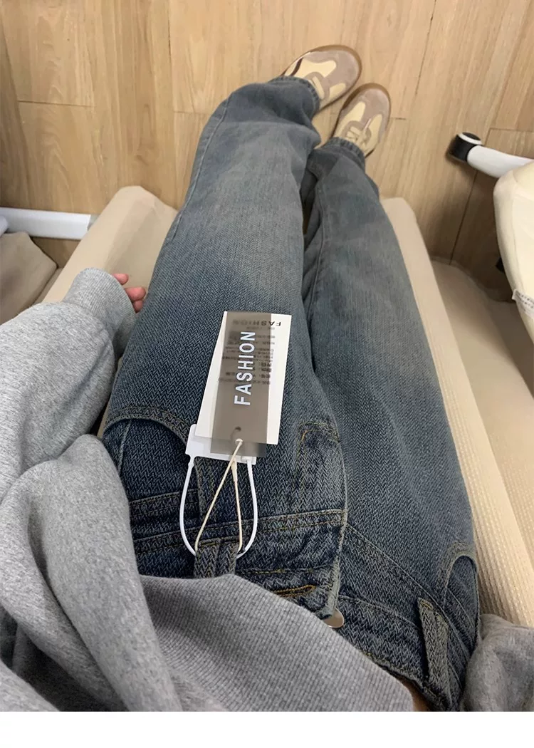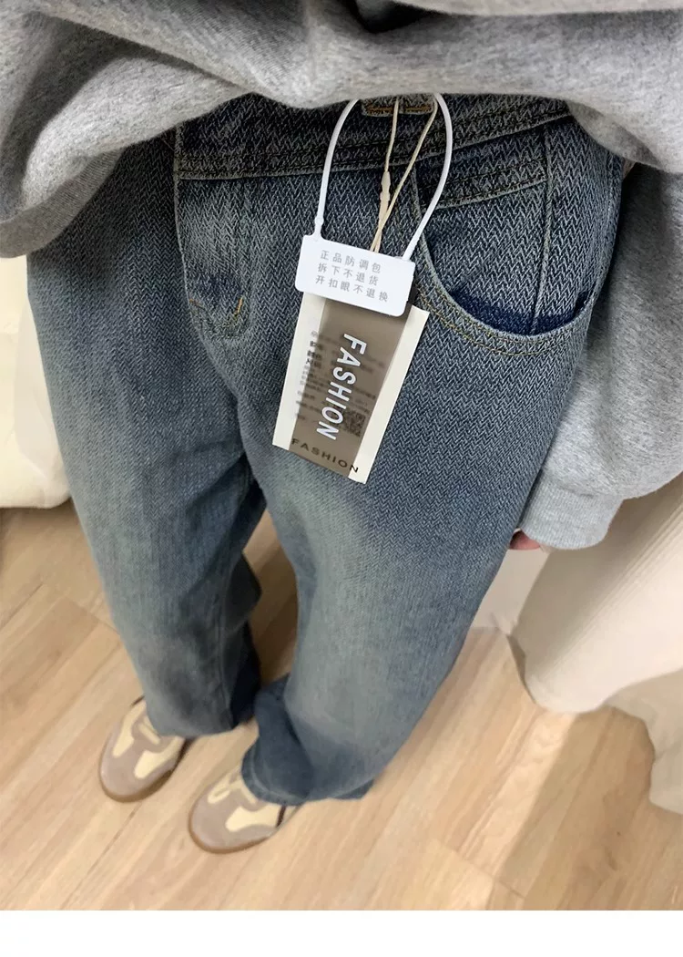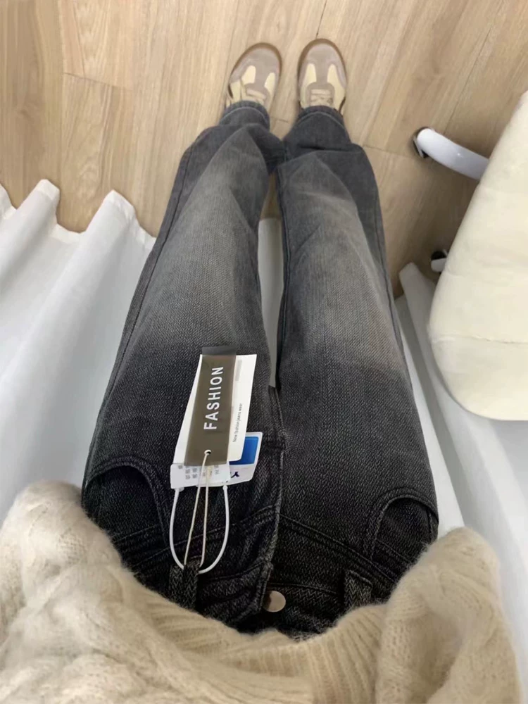 Quần jean ống đứng màu đen và xám dành cho nữ, mùa thu đông, cỡ lớn, lót lông cừu, dày dặn, lưng cao, dáng rộng, giảm béo, quần ống rộng.