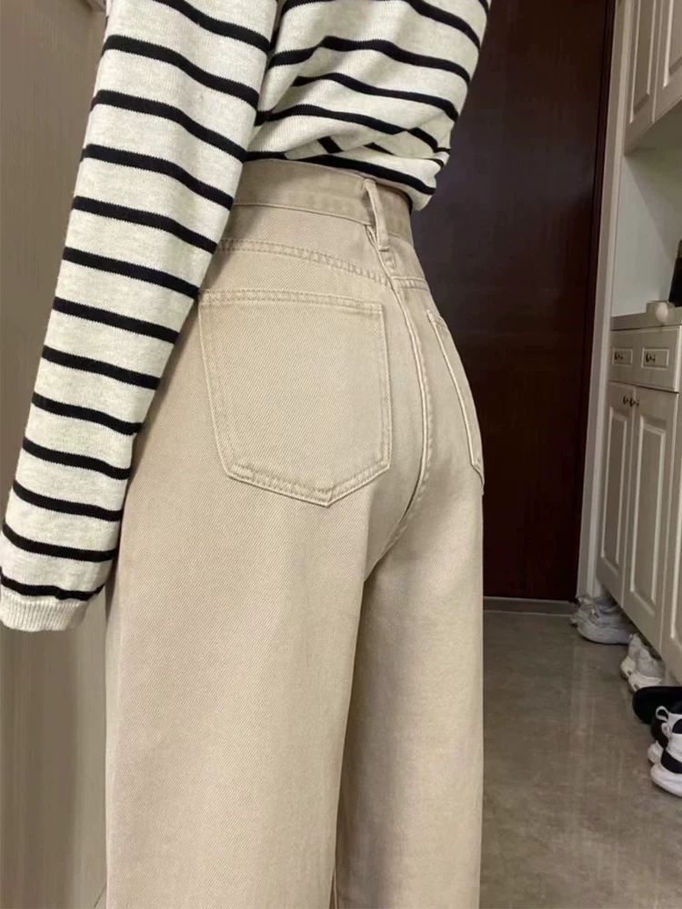 - Quần jean ống đứng màu kaki cho nữ, cỡ lớn, phong cách mới mùa thu, lưng cao, dáng rộng, che hông, giảm béo, quần ống rộng