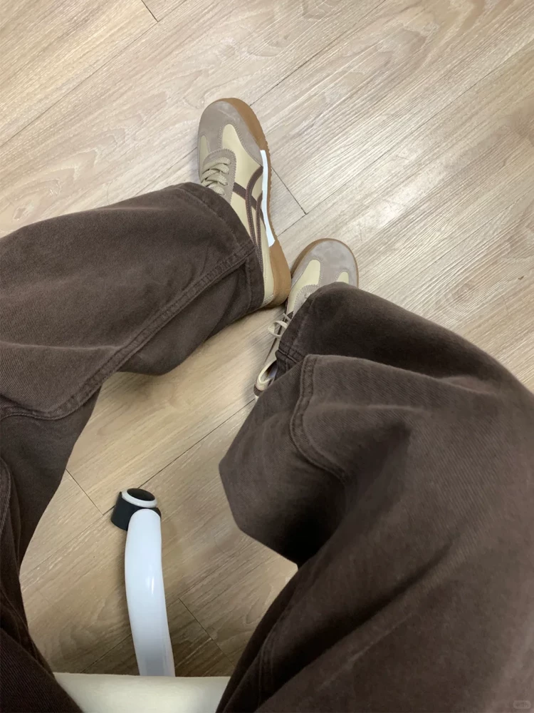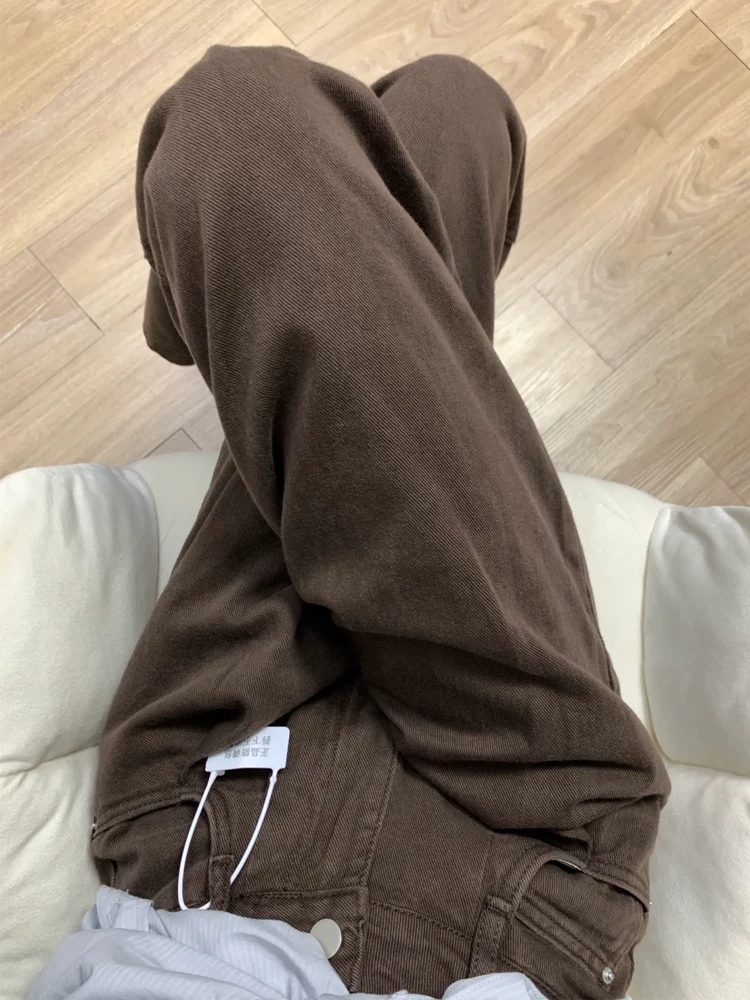 - Quần jean ống đứng màu nâu dành cho nữ, kiểu dáng mùa xuân mới, cỡ lớn, lưng cao, dáng rộng, xếp nếp, giảm béo, quần ống rộng hẹp