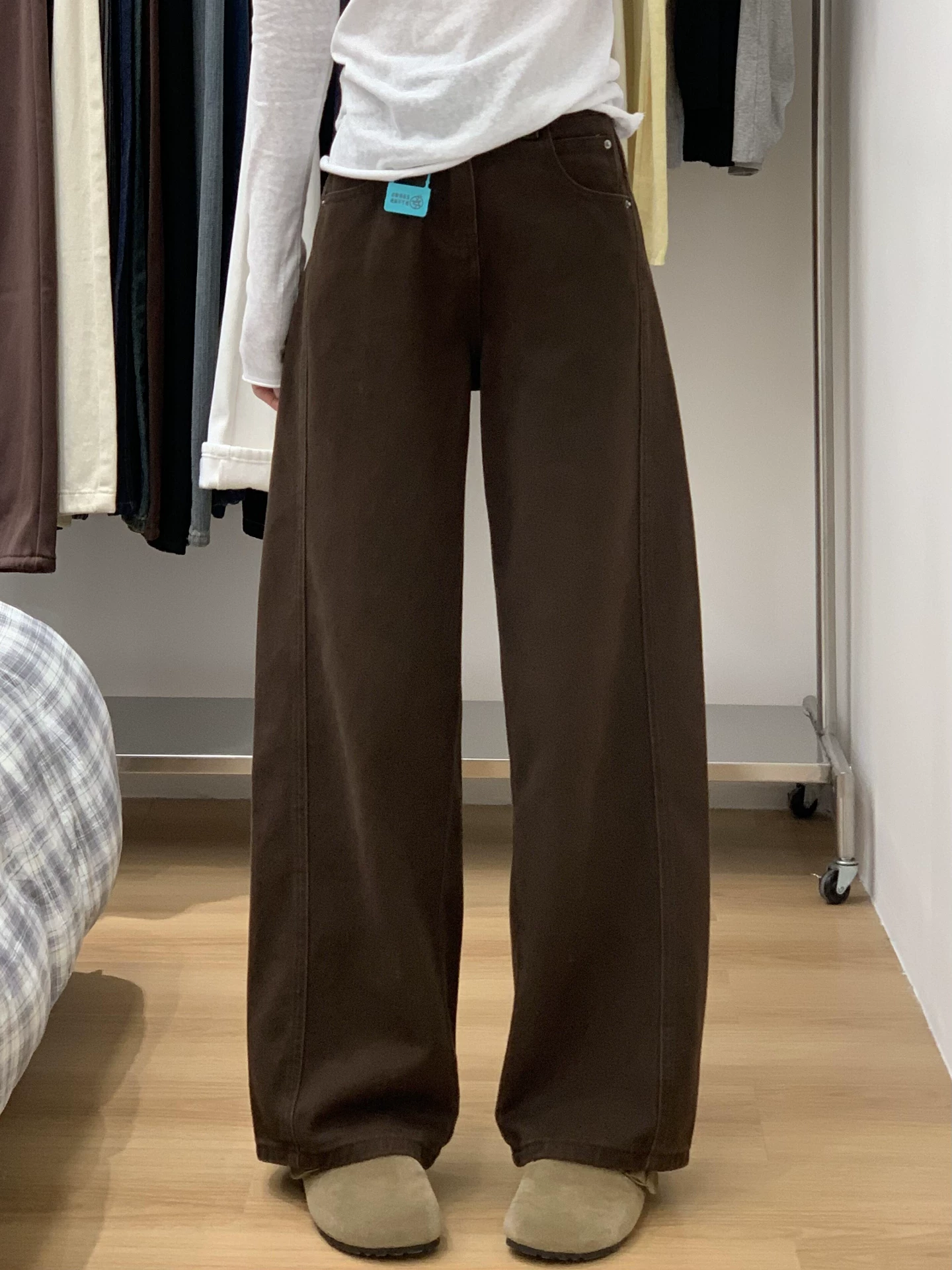 - Quần jean ống đứng màu nâu dành cho nữ, lót lông cừu mùa đông, cỡ lớn, lưng cao, dáng rộng, giảm béo, dáng quả lê, quần ống rộng