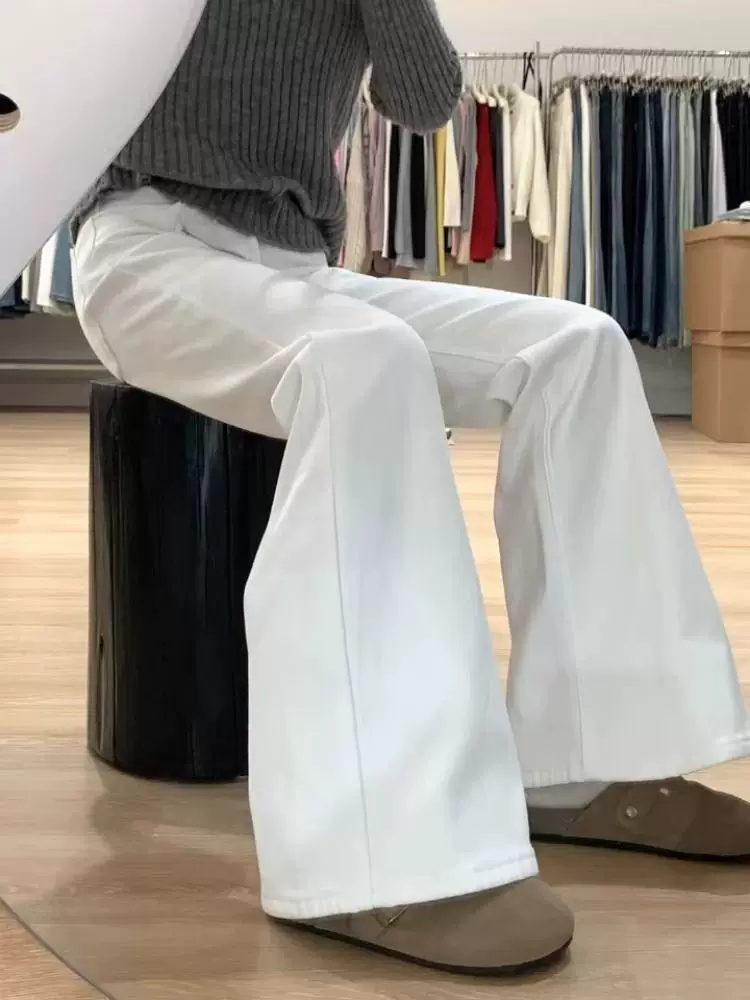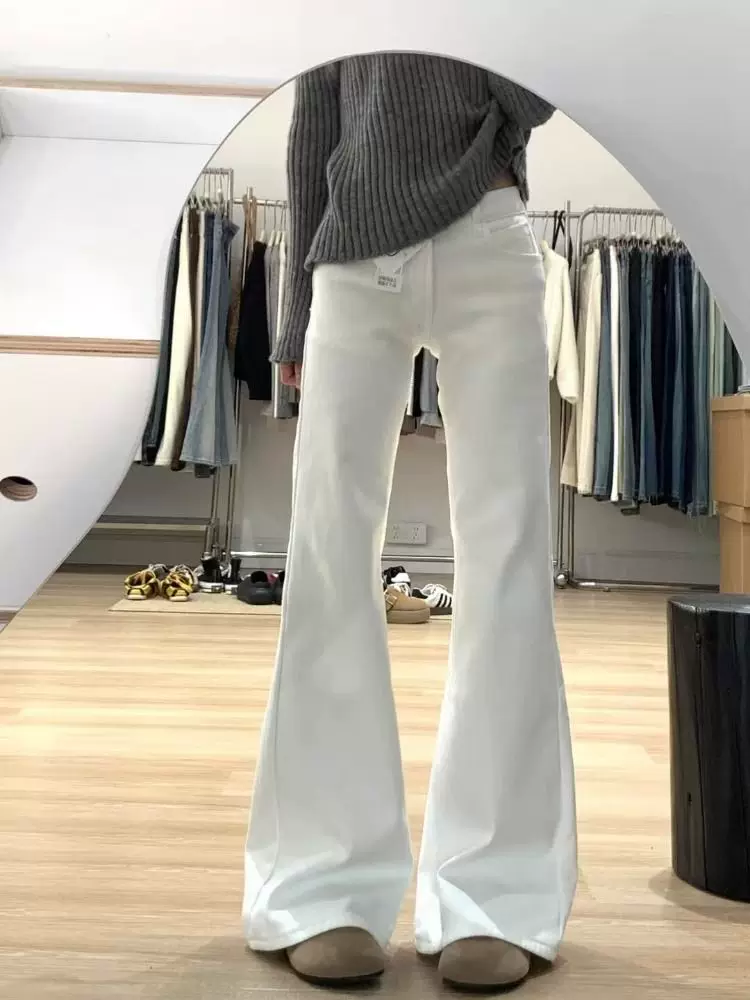 - Quần jean ống đứng màu trắng dành cho nữ, phong cách đầu thu, cỡ lớn, lưng cao, co giãn, che hông, giảm béo, quần ống loe.