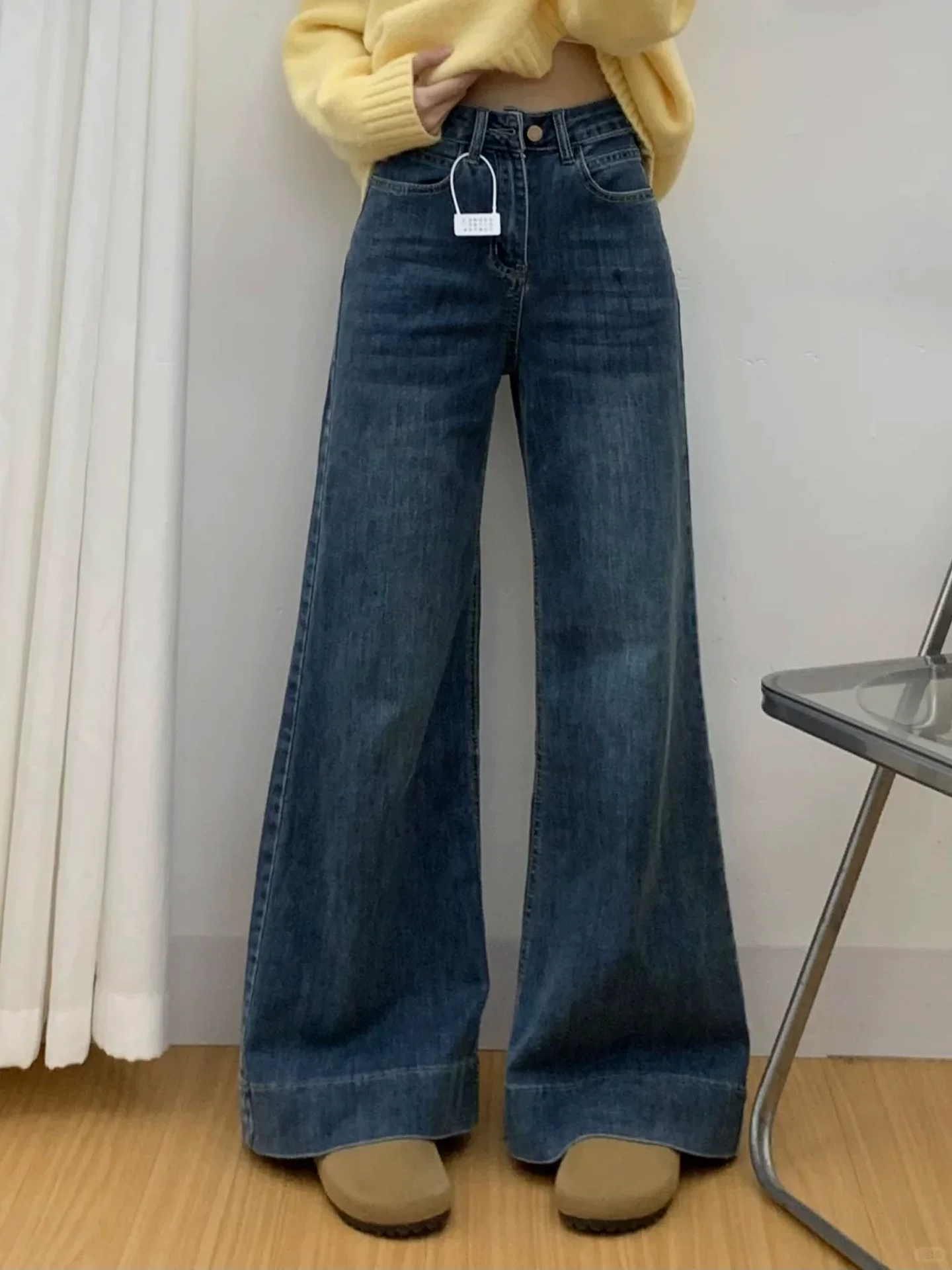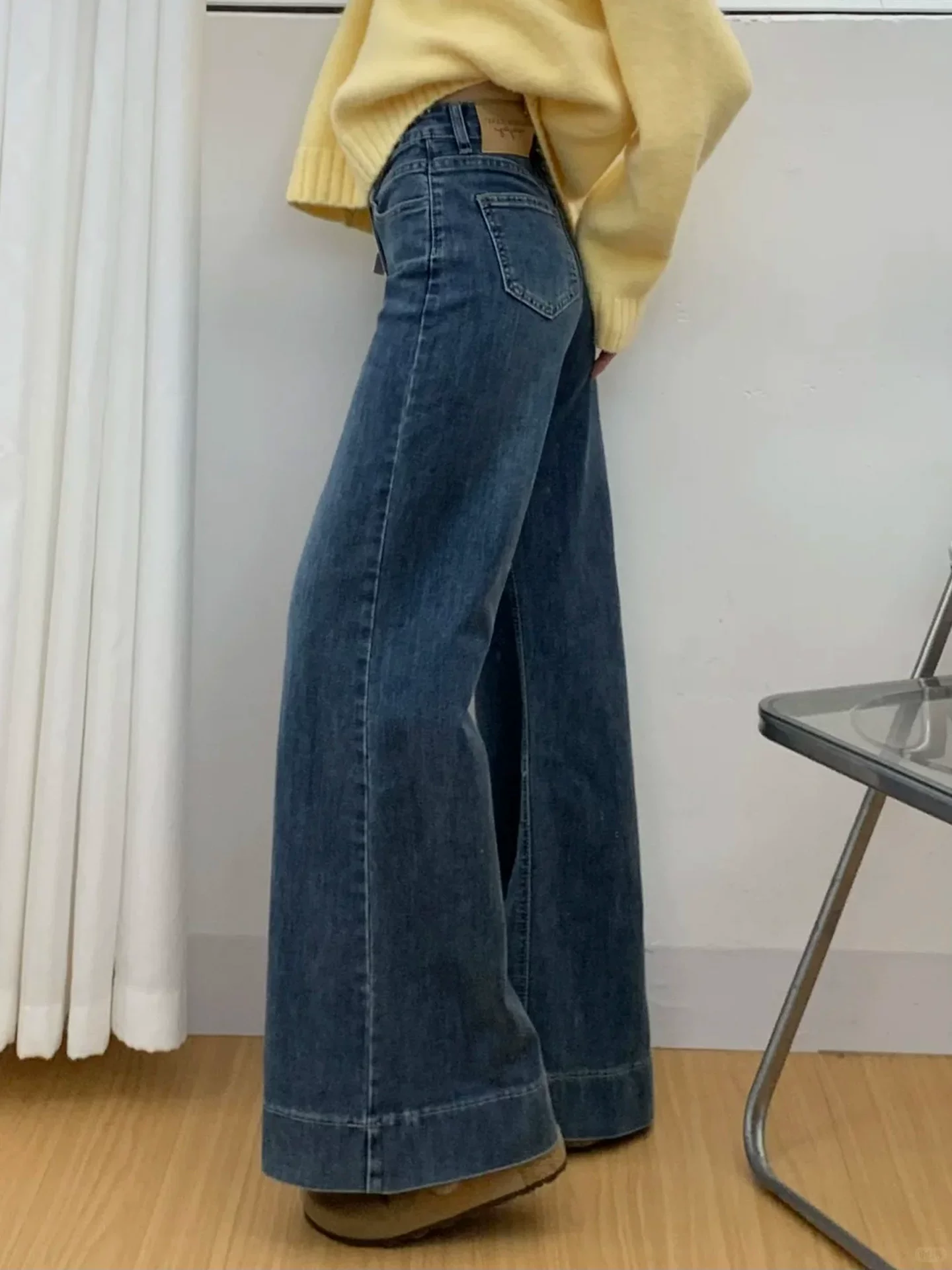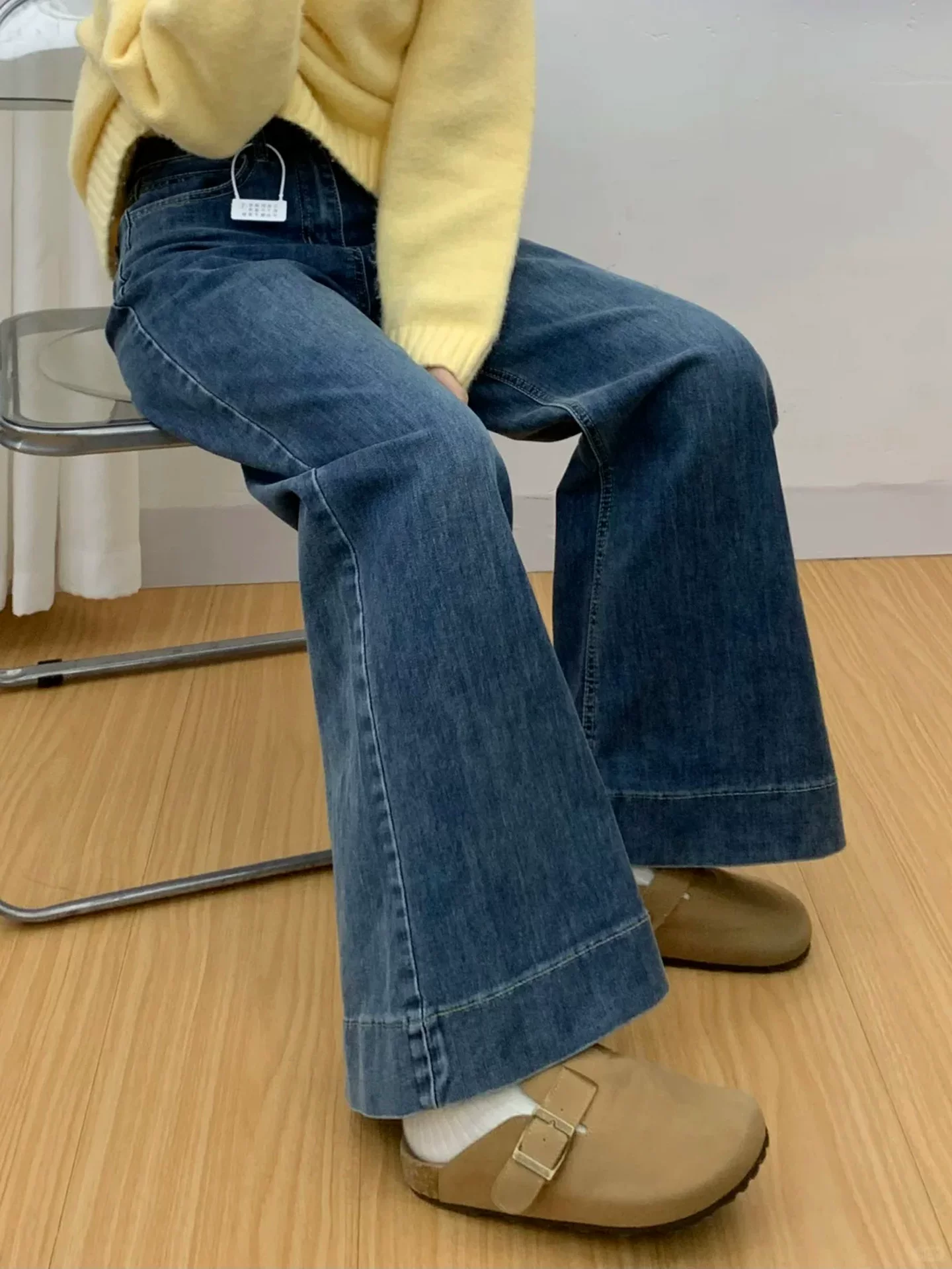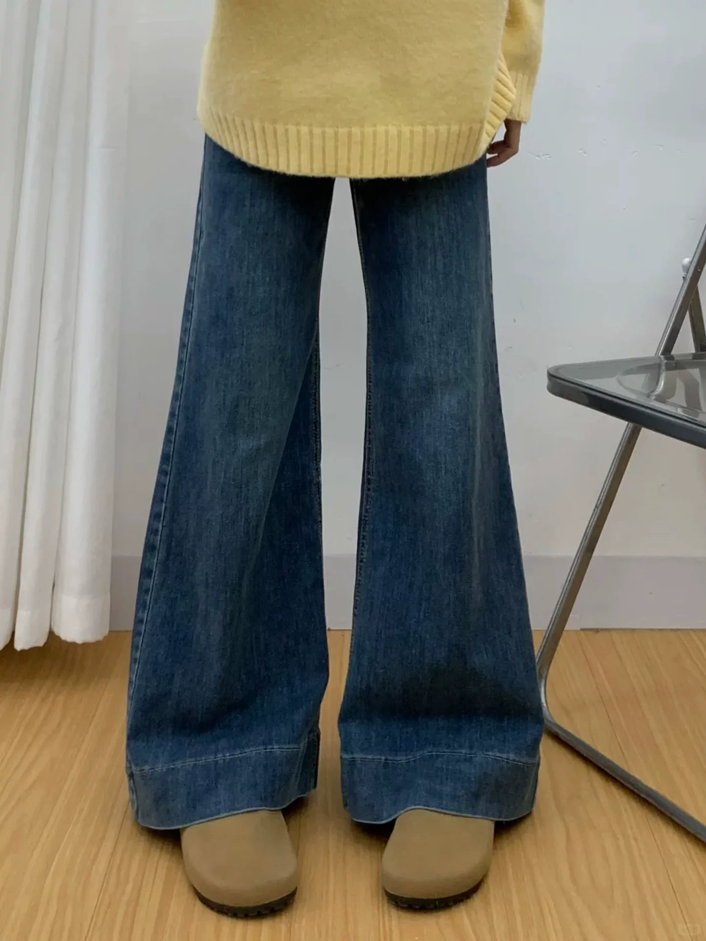 Quần jean ống đứng màu xanh cổ điển dành cho nữ, đầu thu, cỡ lớn, lưng cao, co giãn, quần ống loe thon gọn