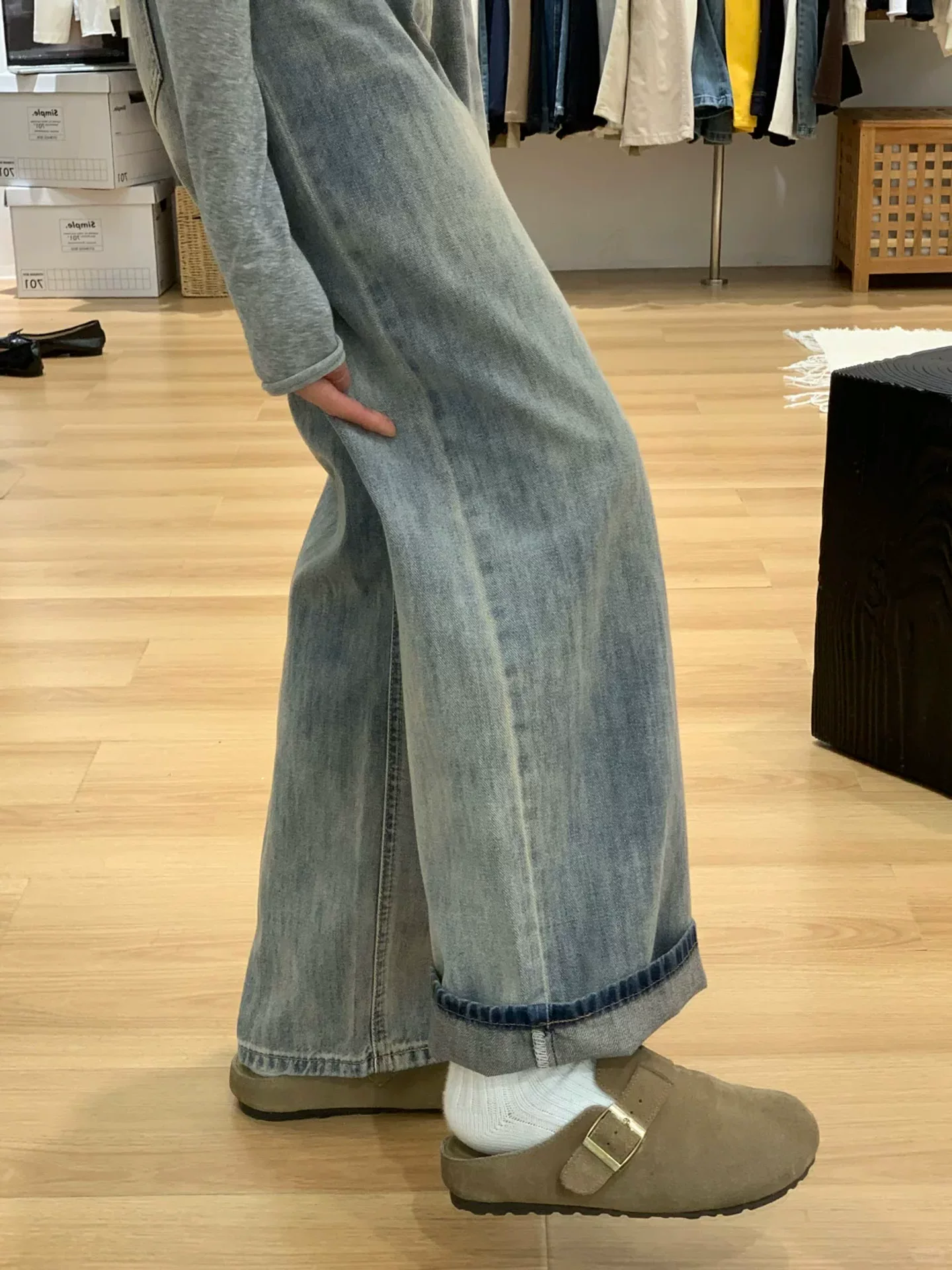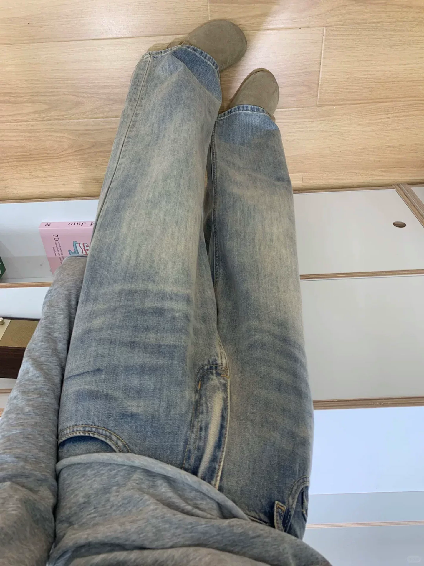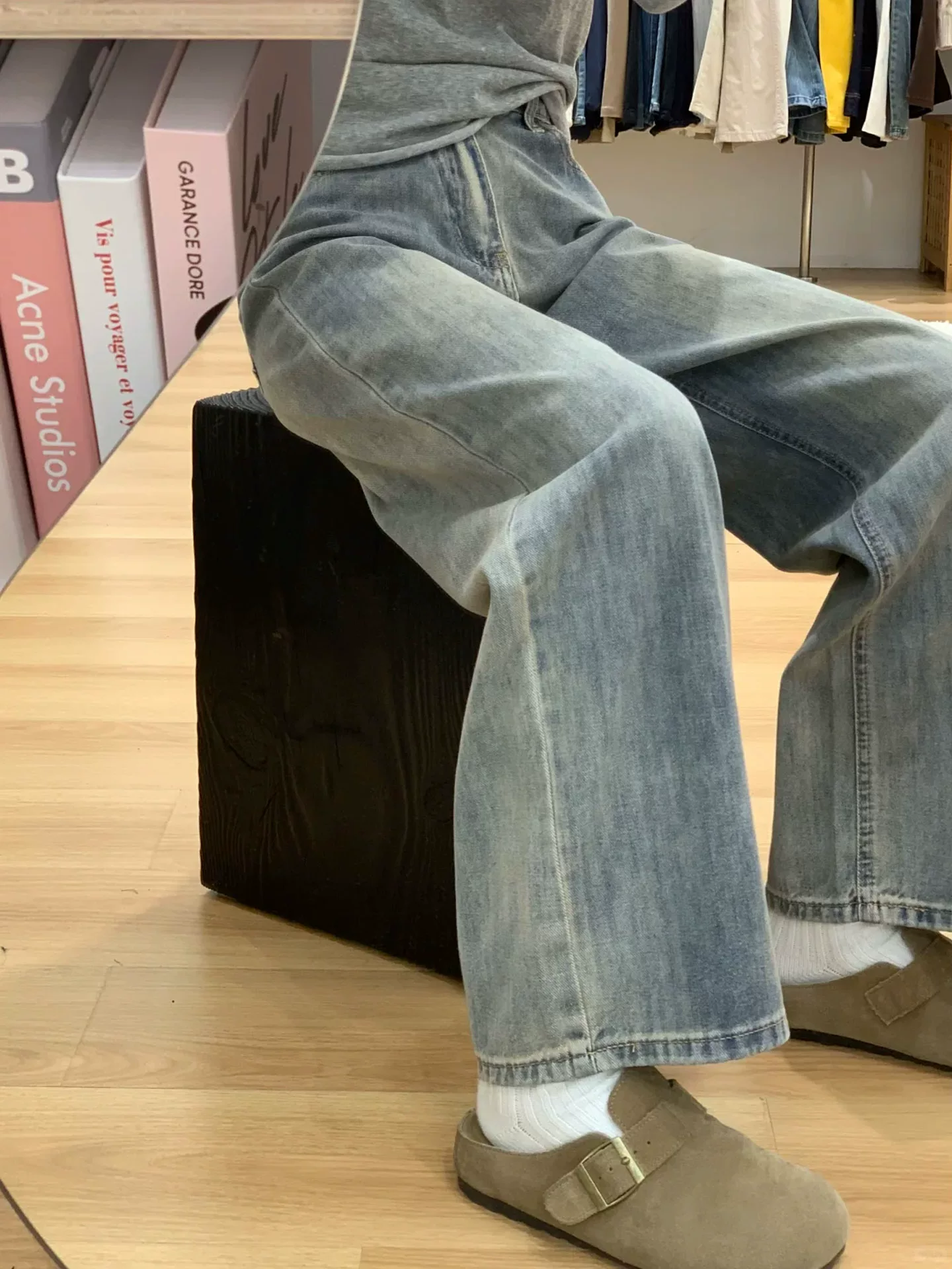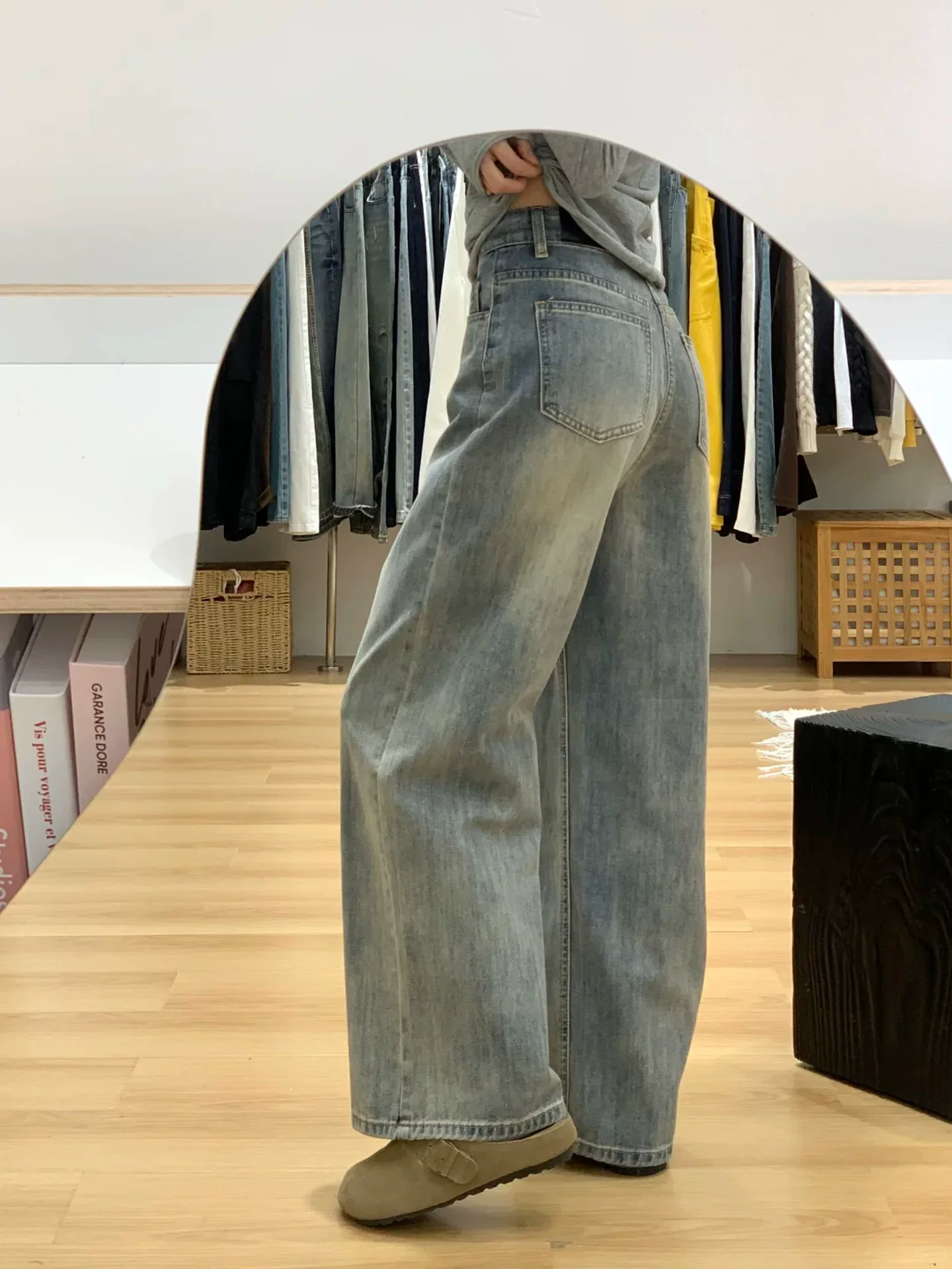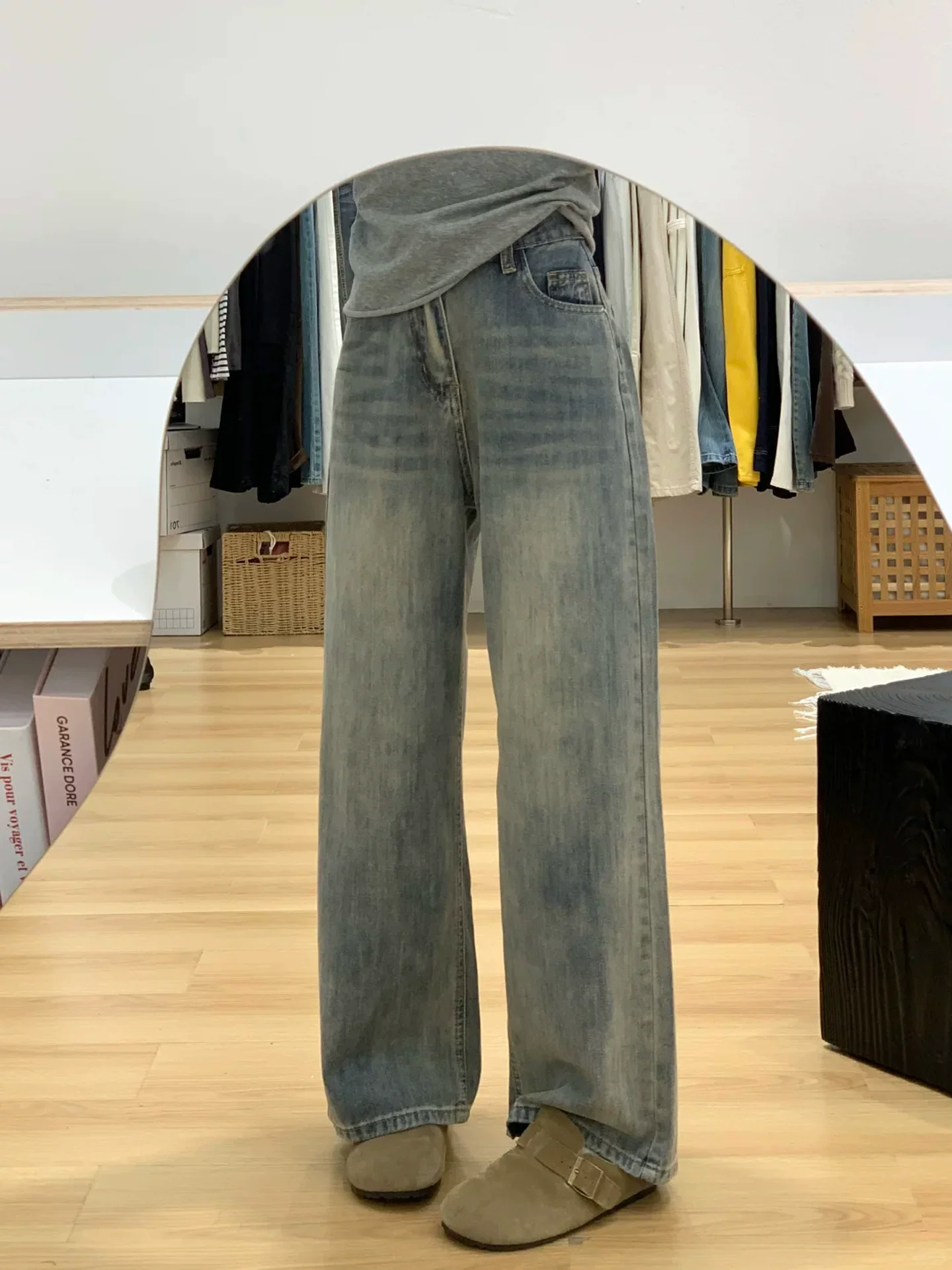 Quần jean ống đứng màu xanh cổ điển dành cho nữ, phong cách đầu thu, cỡ lớn, lưng cao, dáng rộng, tôn dáng, dáng quả lê, quần ống rộng