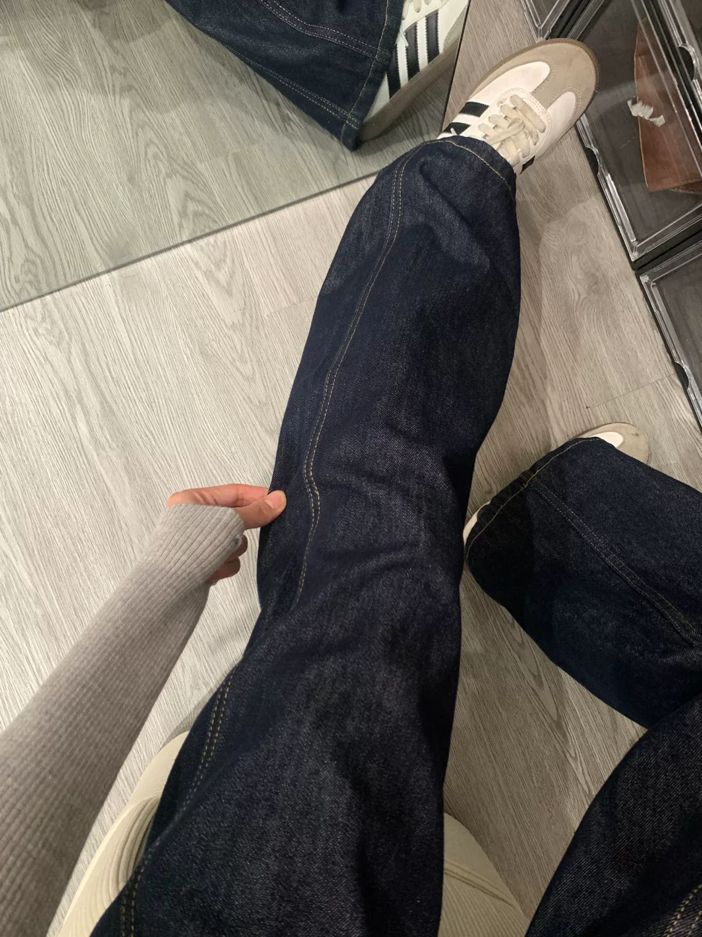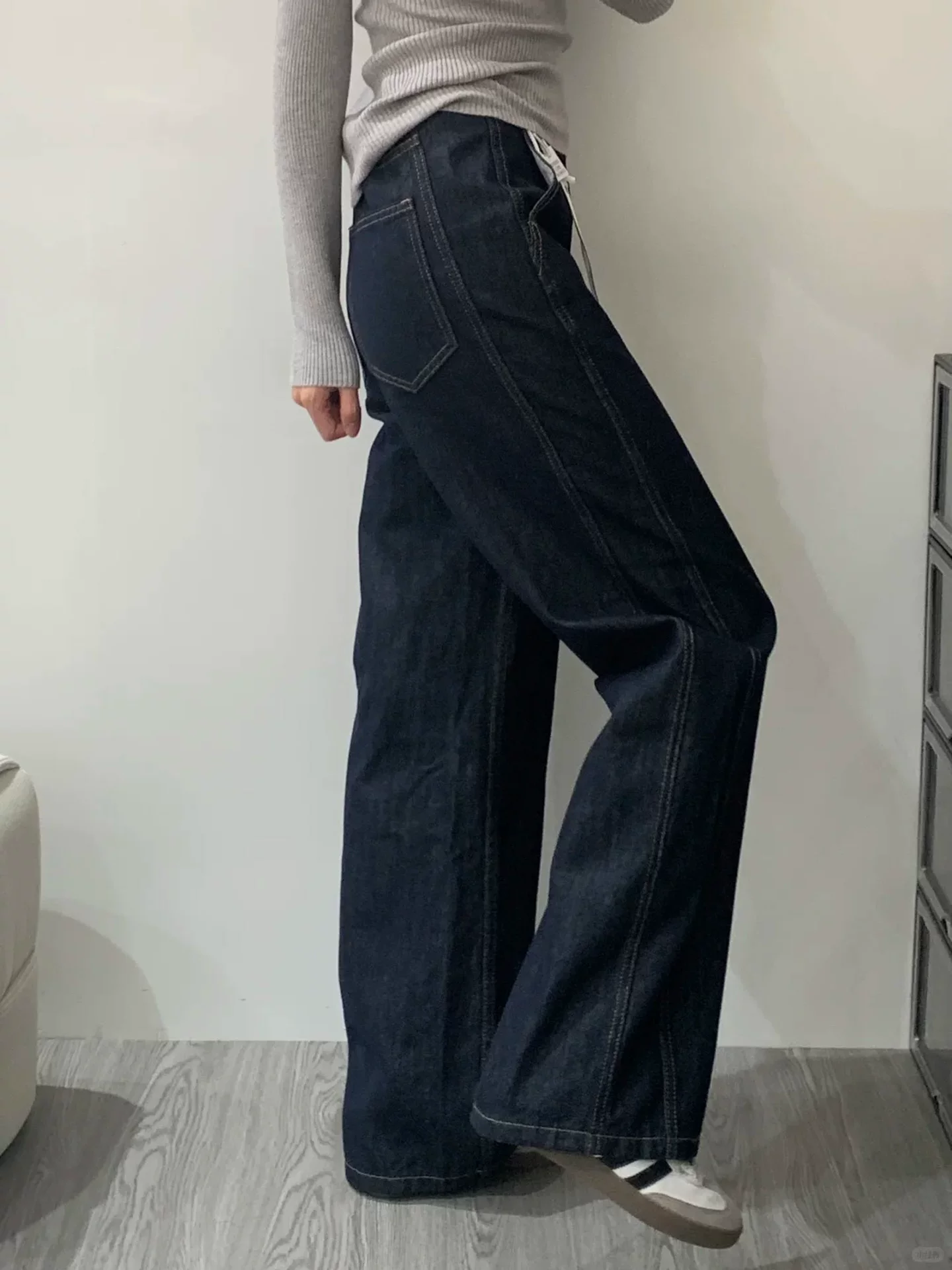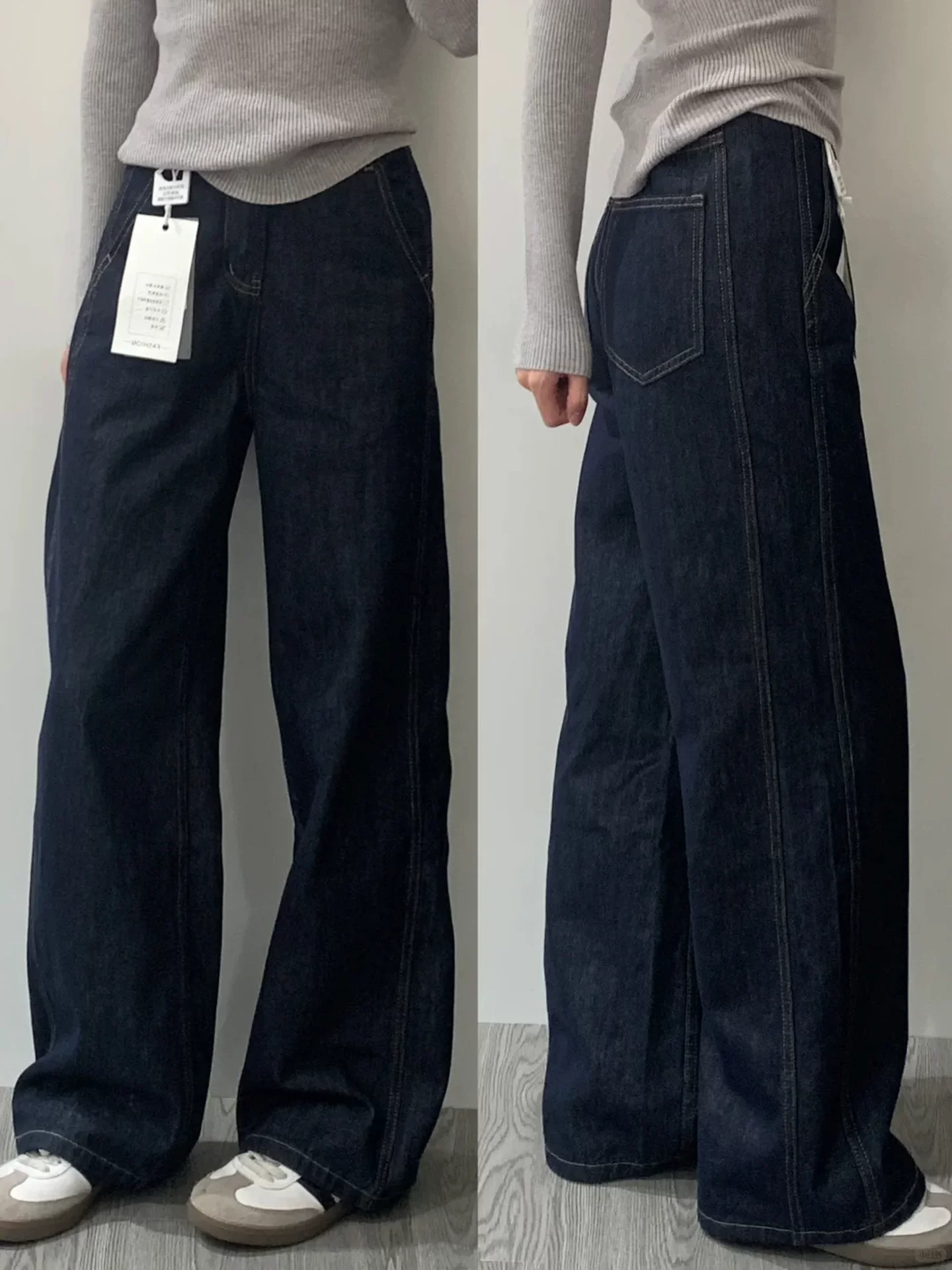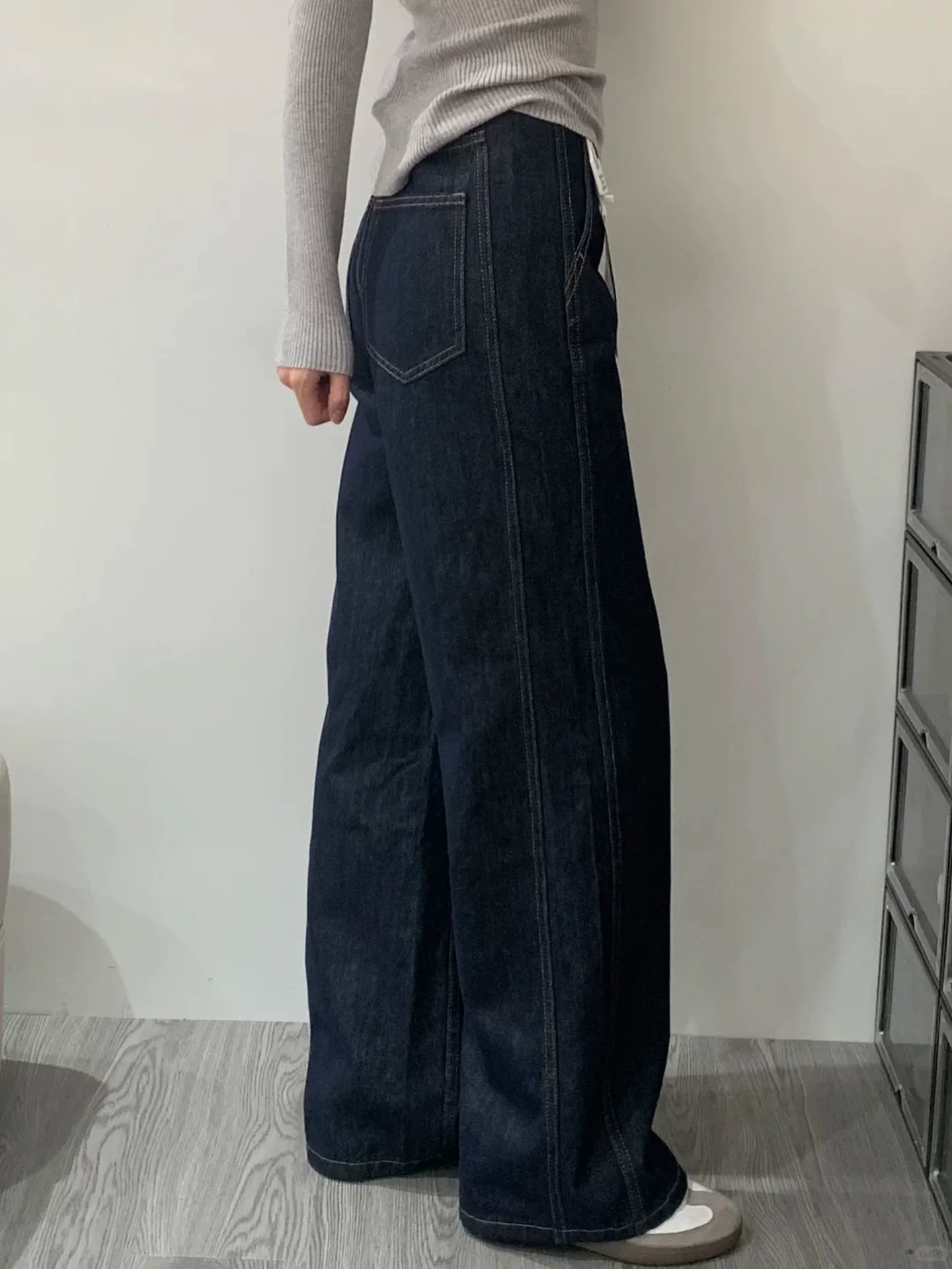 - Quần jean ống đứng màu xanh đậm dành cho nữ, mùa thu, cỡ lớn, lưng cao, che hông, giảm béo, dáng quả lê, quần ống rộng