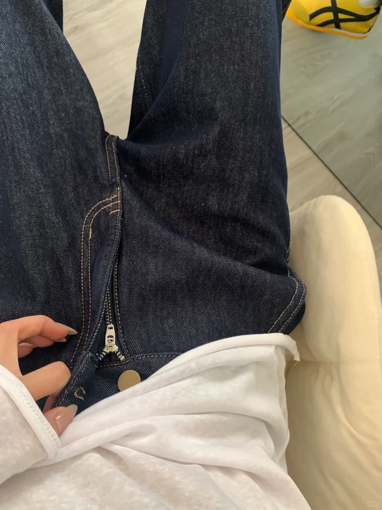 - Quần jean ống đứng màu xanh đậm dành cho nữ, mùa thu đông, cỡ lớn, lót lông cừu, dày dặn, cạp cao, che hông, giảm béo, quần ống rộng.