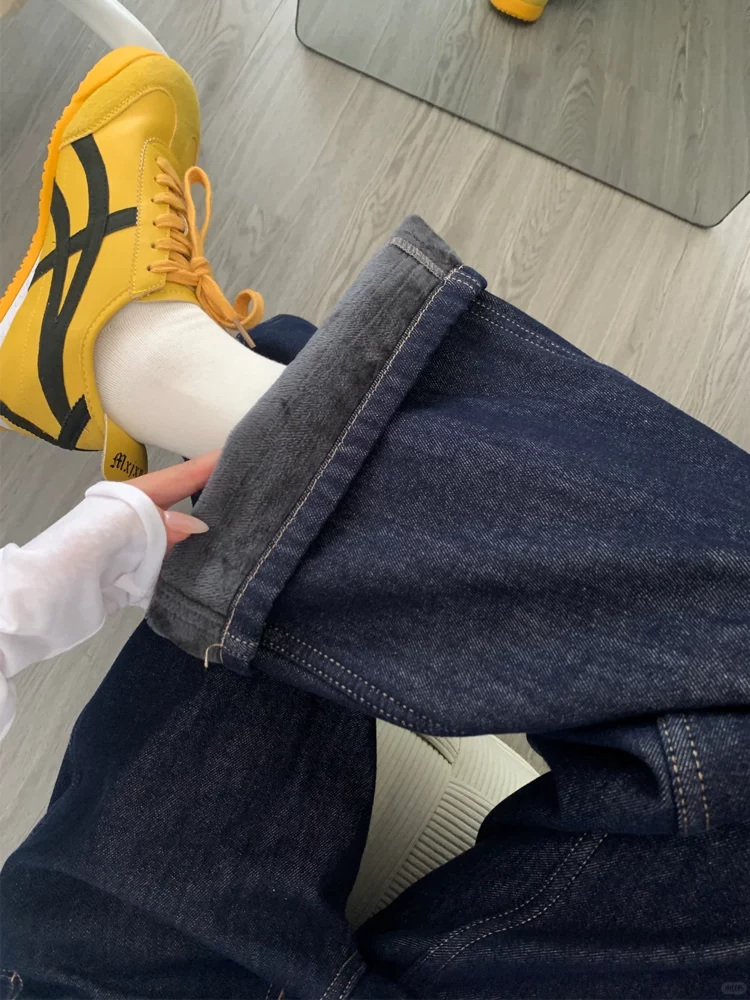 Quần jean ống đứng màu xanh đậm dành cho nữ, mùa thu đông, cỡ lớn, lót lông cừu, dày dặn, cạp cao, che hông, giảm béo, quần ống rộng.