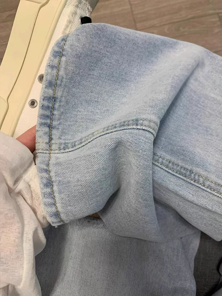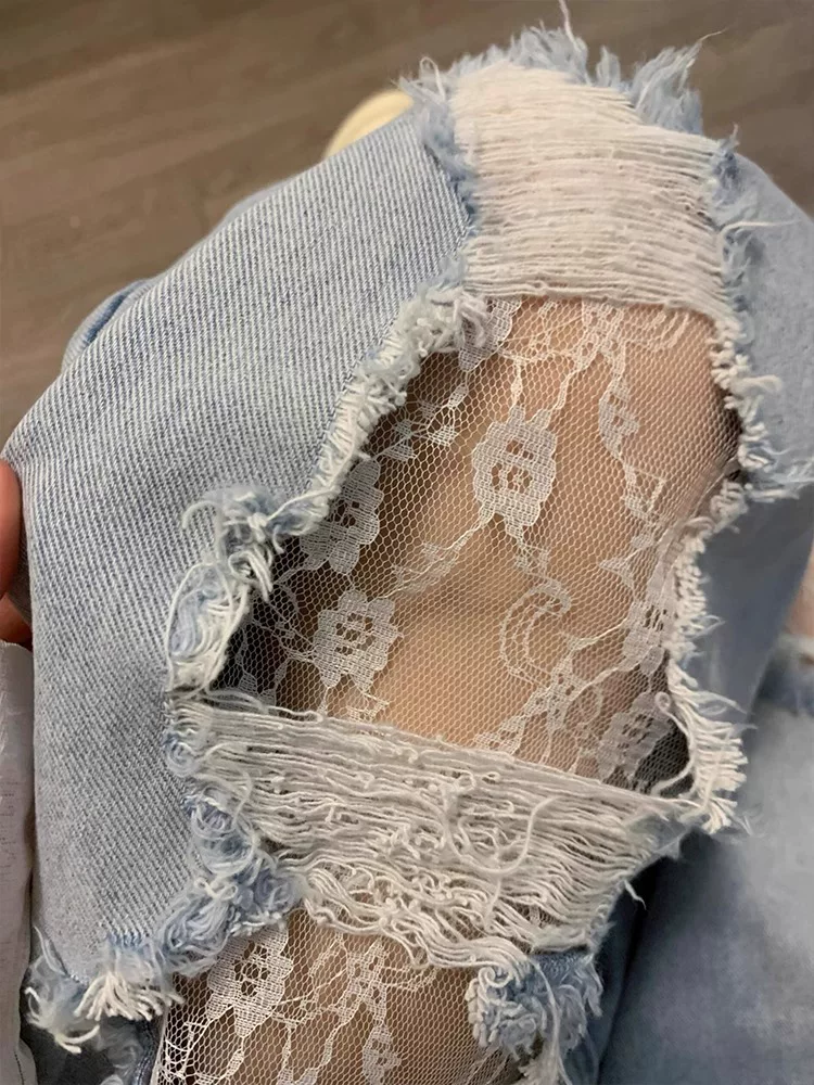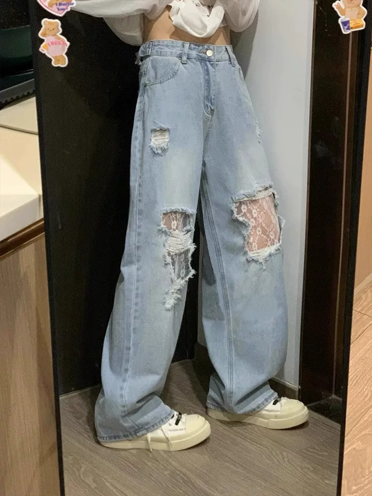 - Quần jean ống đứng màu xanh nhạt có ren rách dành cho nữ, kiểu dáng mỏng mùa hè, cỡ lớn, lưng cao, dáng rộng, quần ống rộng giúp giảm béo.