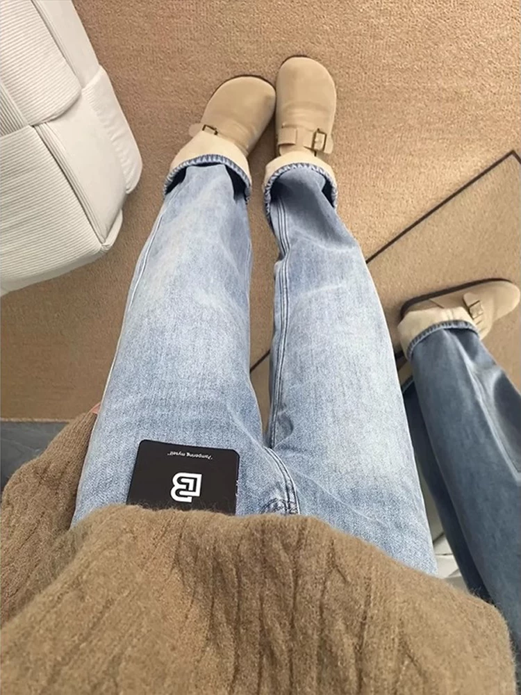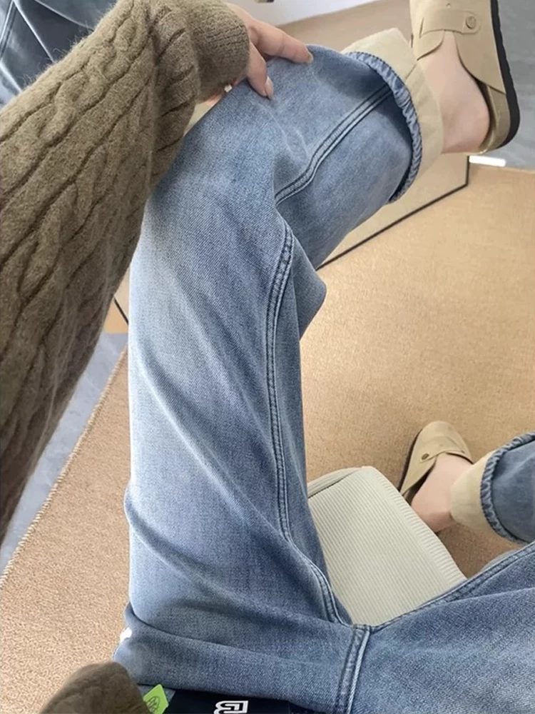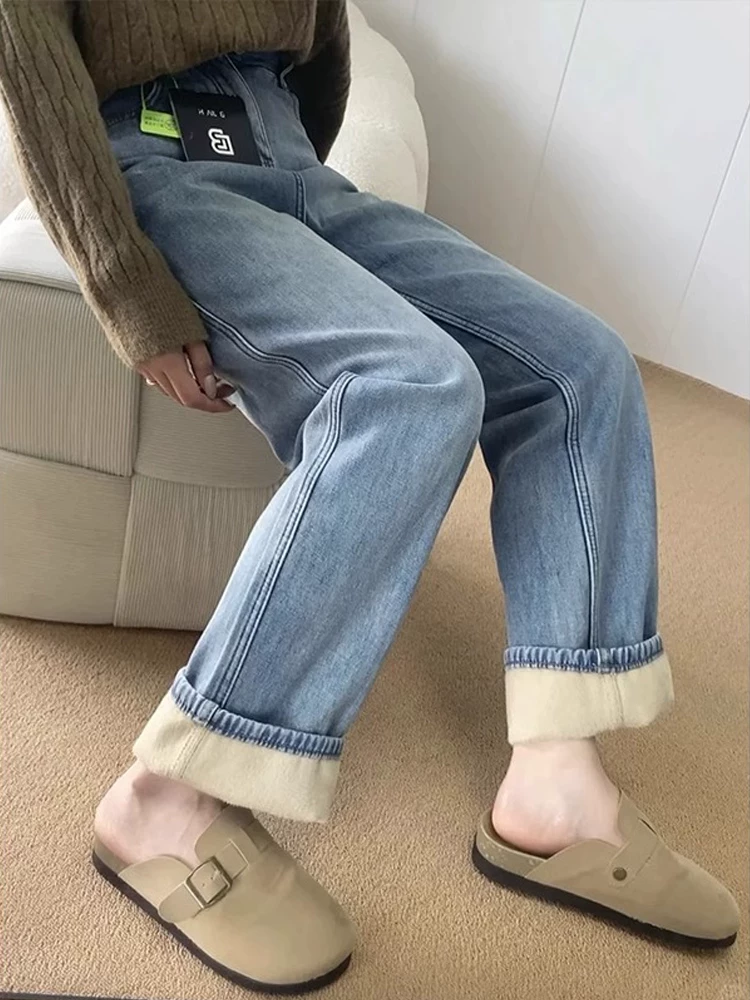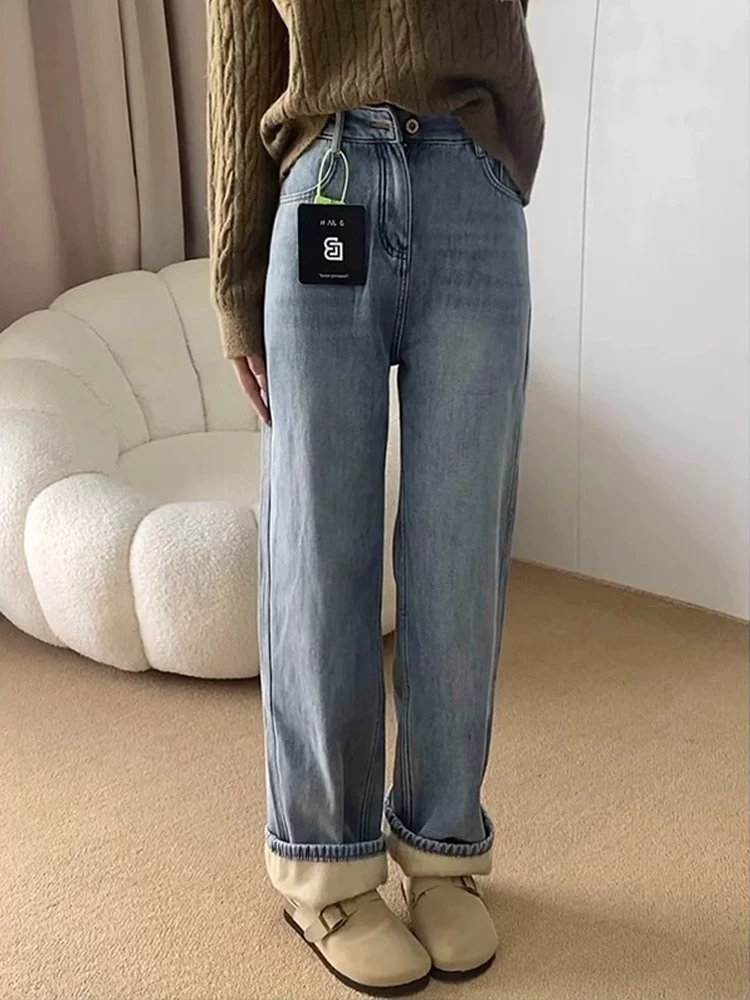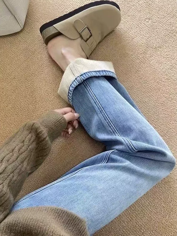 Quần jean ống đứng màu xanh nhạt dành cho nữ, mùa thu đông, cỡ lớn, lót lông cừu, dày dặn, lưng cao, dáng rộng, dáng suông, quần ống rộng hẹp.
