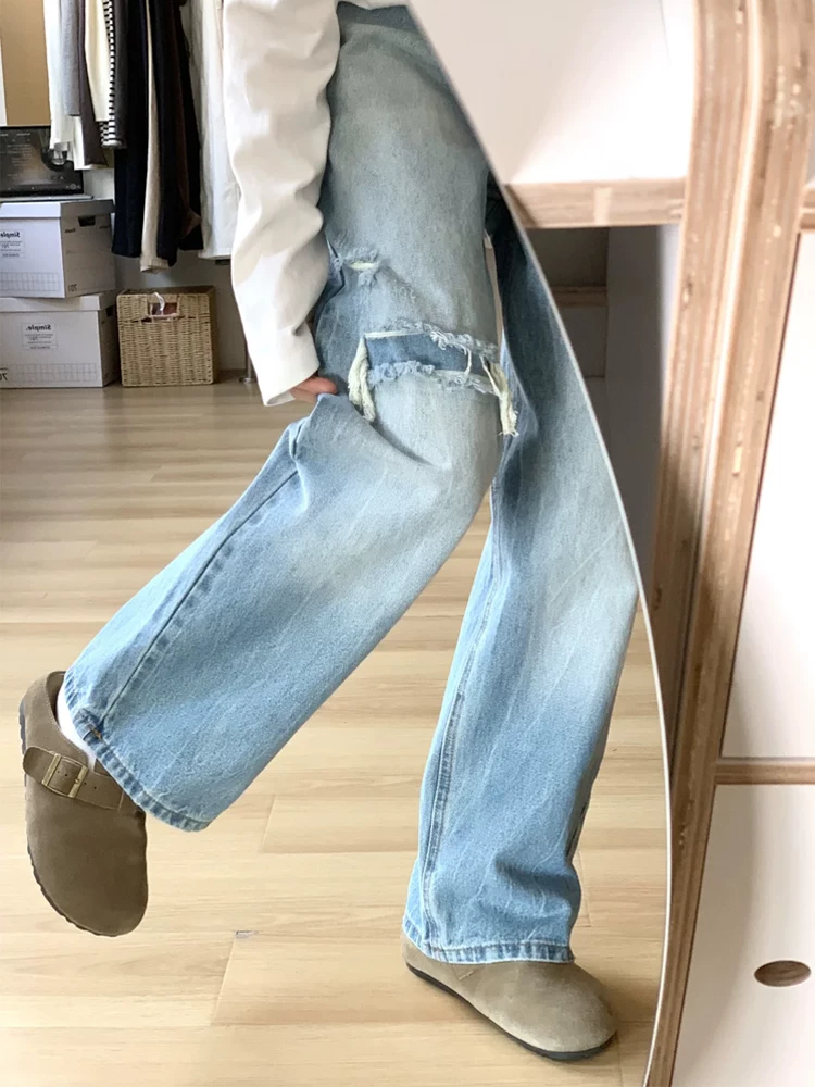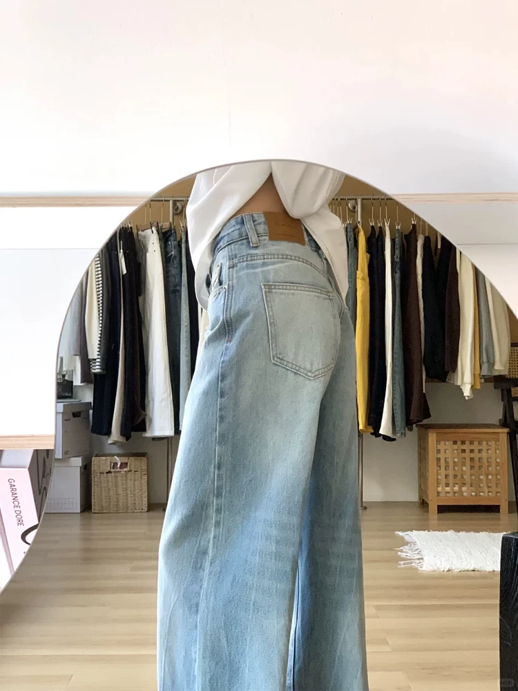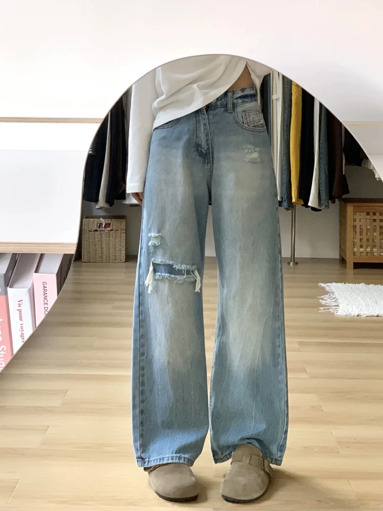 Quần jean ống đứng màu xanh nhạt dành cho nữ, thu đông 2025, size lớn, cạp cao, dáng rộng, tôn dáng, phù hợp với dáng người quả lê, quần ống rộng