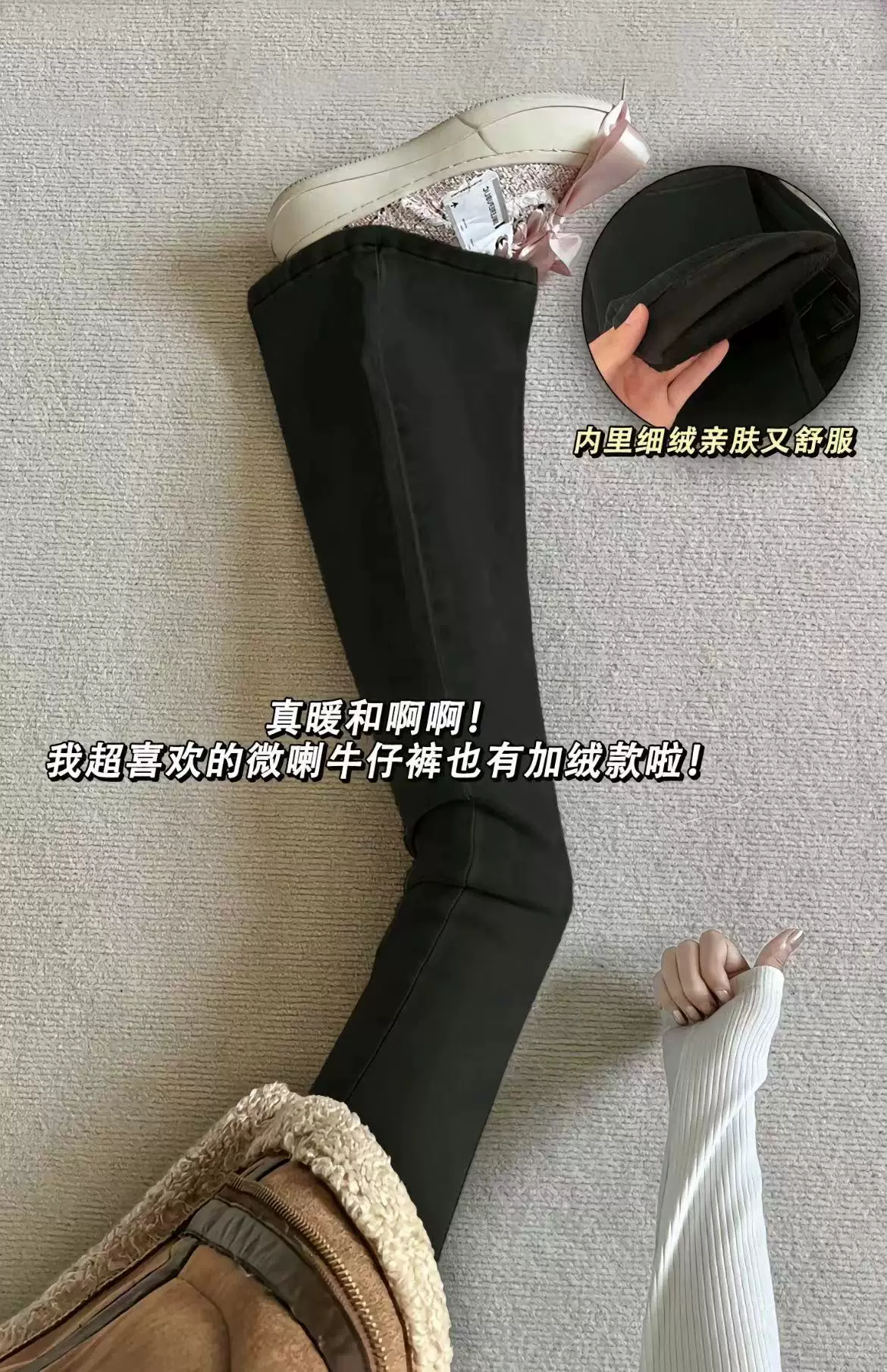 - Quần jean ống đứng ống loe dày lót lông cừu dành cho nữ, mùa thu đông, cỡ lớn, lưng cao, co giãn, che hông, quần ống loe thon gọn.