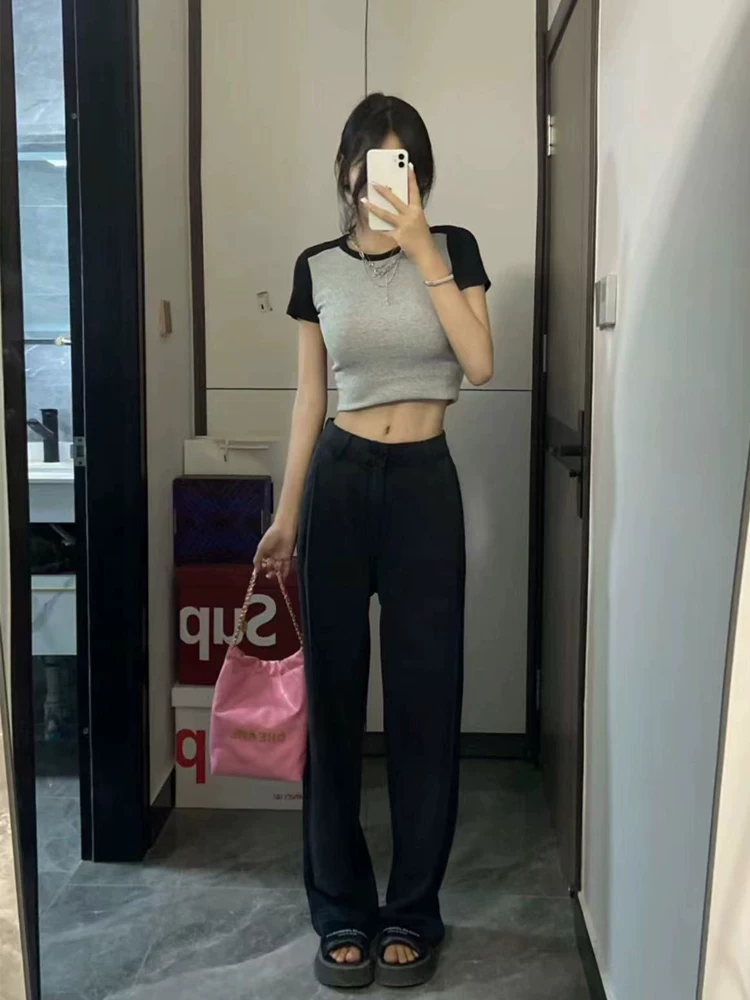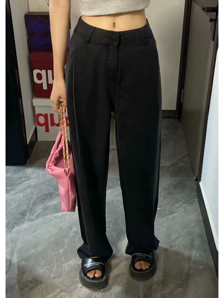 Quần jean ống đứng Tencel màu đen dành cho nữ, mùa xuân, cỡ lớn, lưng cao, dáng rộng, che hông, giảm béo, quần ống rộng bằng vải lụa băng