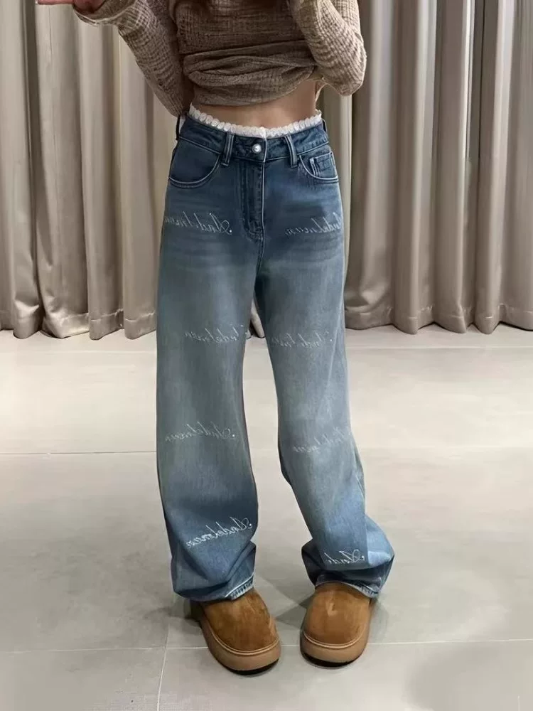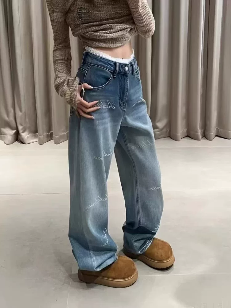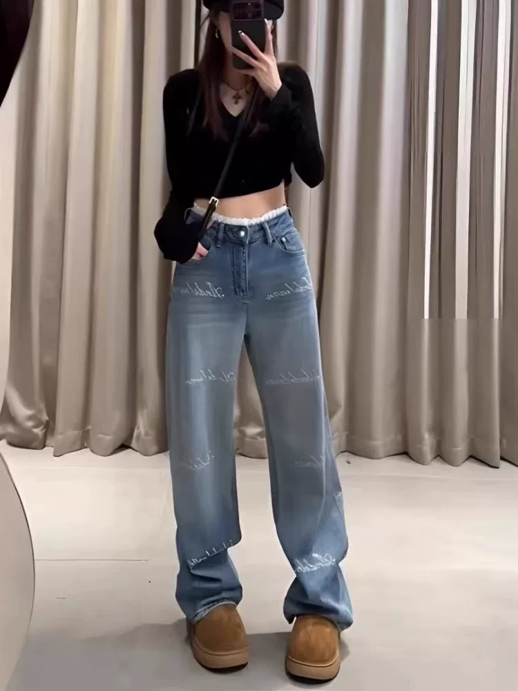 - Quần jean ống đứng thêu chắp vá dành cho nữ, kiểu dáng mùa xuân mới, size lớn, cạp cao, che hông, quần ống rộng tôn dáng.