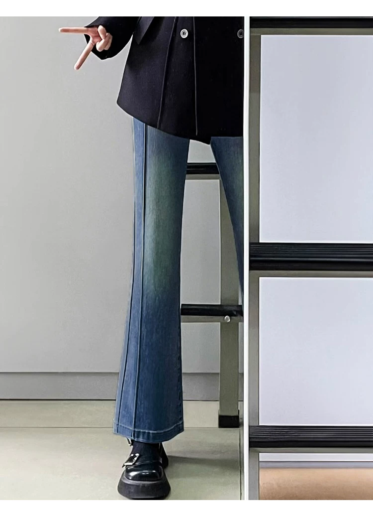 - Quần jean ống đứng xòe dành cho nữ, mùa thu, cỡ lớn, cạp cao, co giãn, che hông, thon gọn, dáng quả lê, quần ống loe