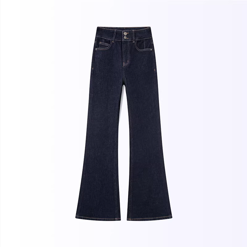 - Quần jean ống loe cạp cao chất liệu co giãn bốn chiều màu trơn mùa đông dành cho bé gái, kiểu ôm dáng, màu xanh đậm, lót lông cừu, quần dài