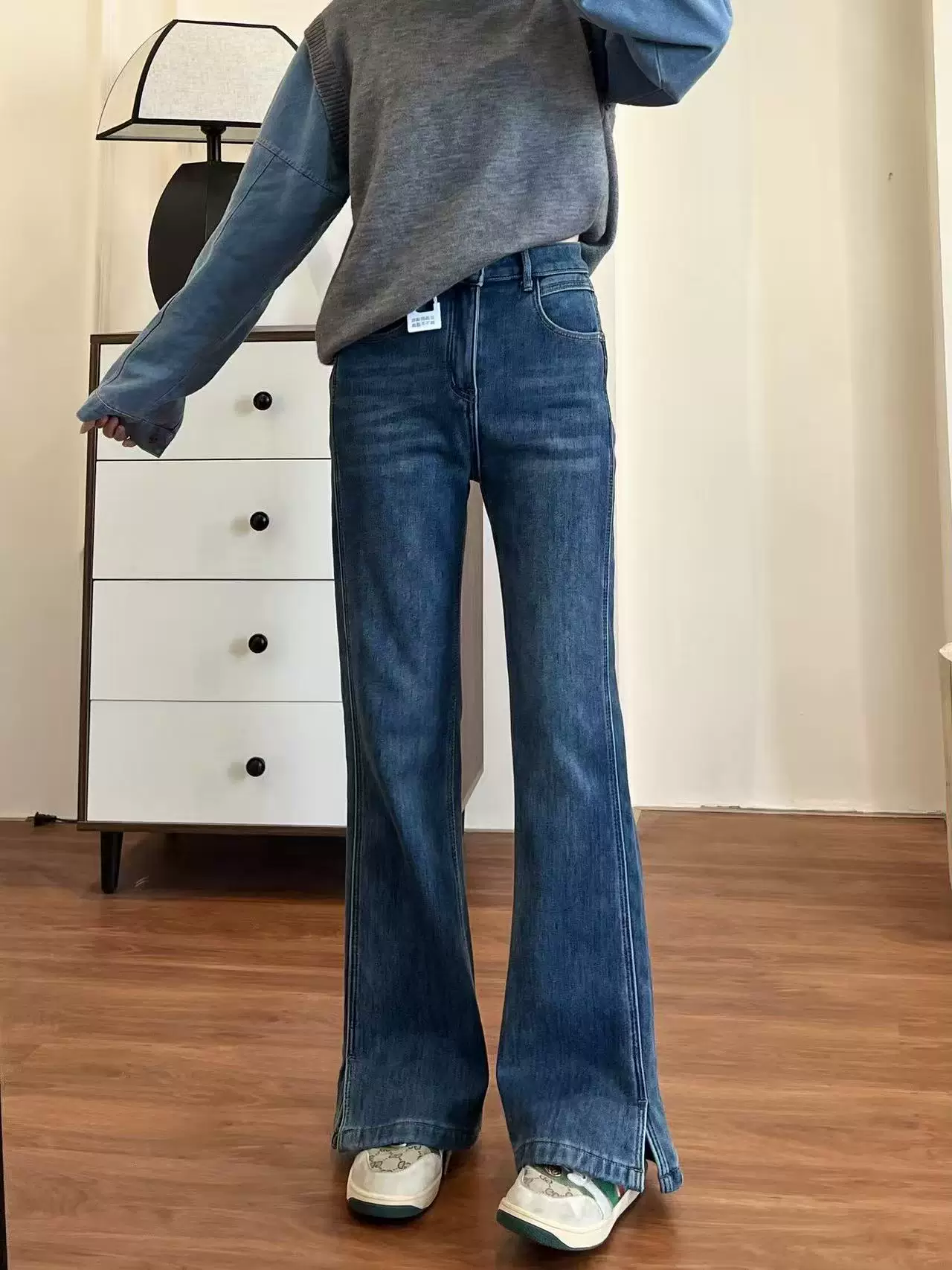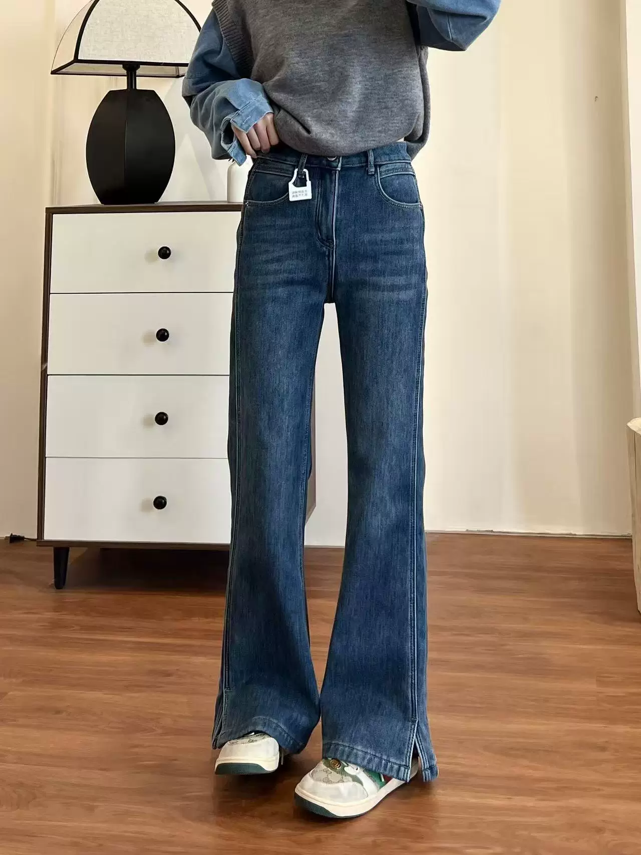 - Quần jean ống loe cạp cao dành cho nữ, mùa thu đông, lót lông cừu, cỡ lớn, màu xanh đậm, tôn dáng, co giãn, quần ống loe xẻ tà