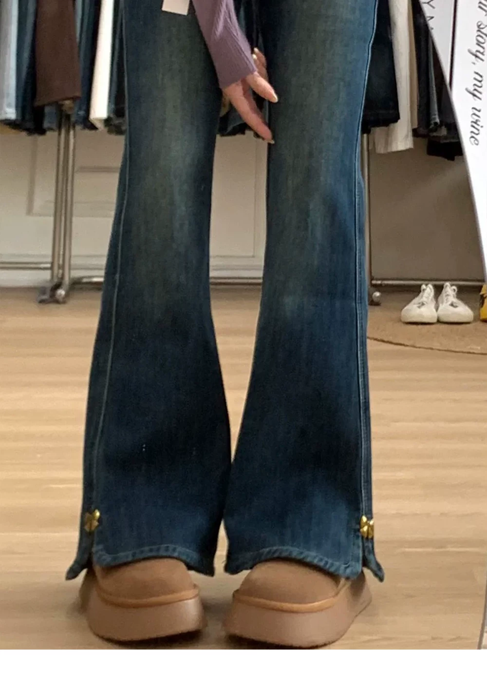- Quần jean ống loe cổ điển dành cho nữ, lót lông cừu mùa đông, dày, cỡ lớn, cạp cao, co giãn, không bó sát, quần ống chuông.