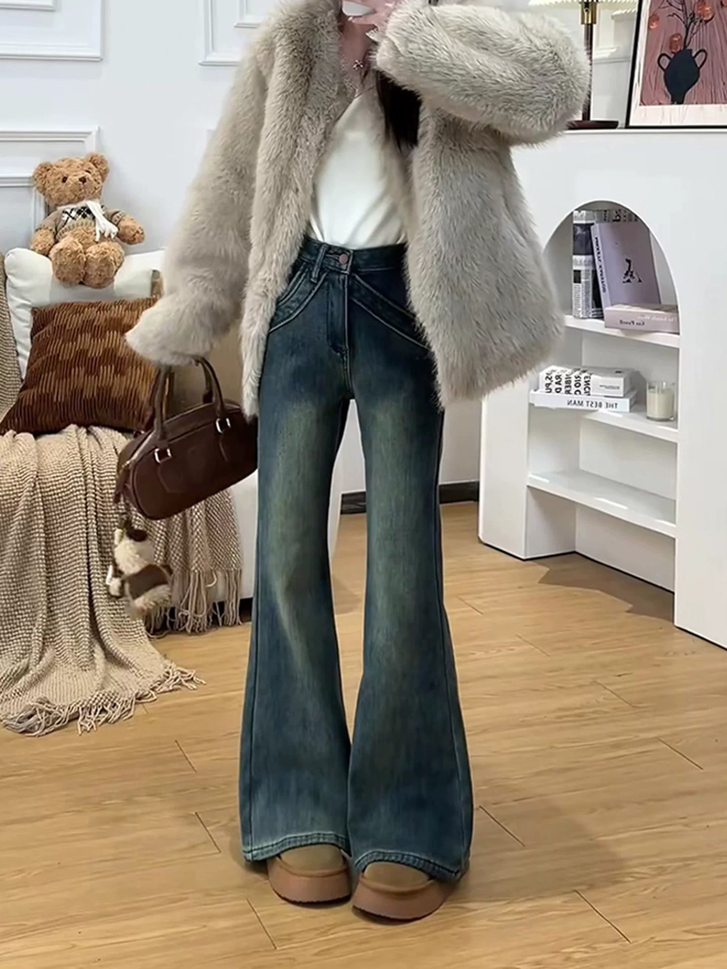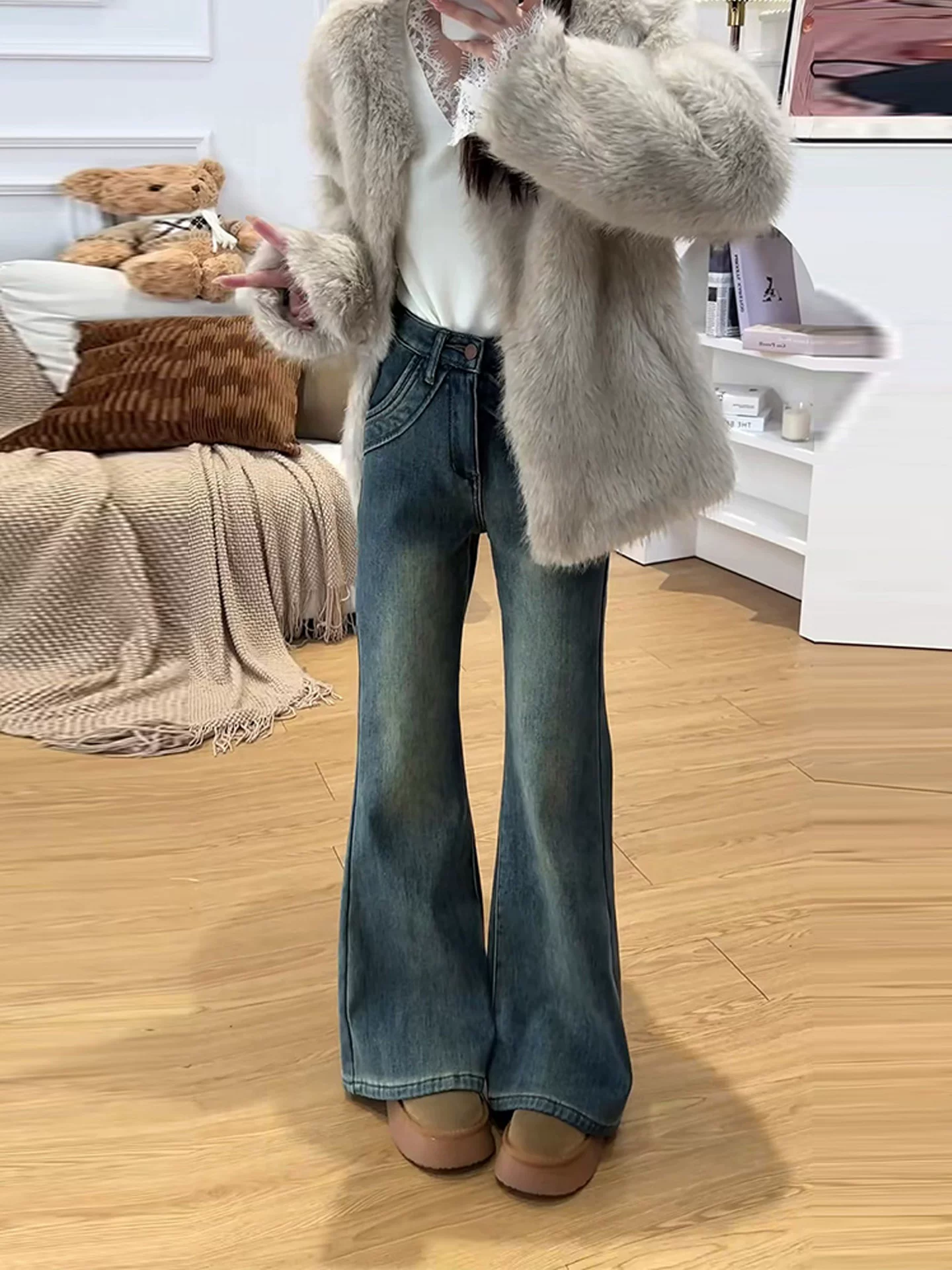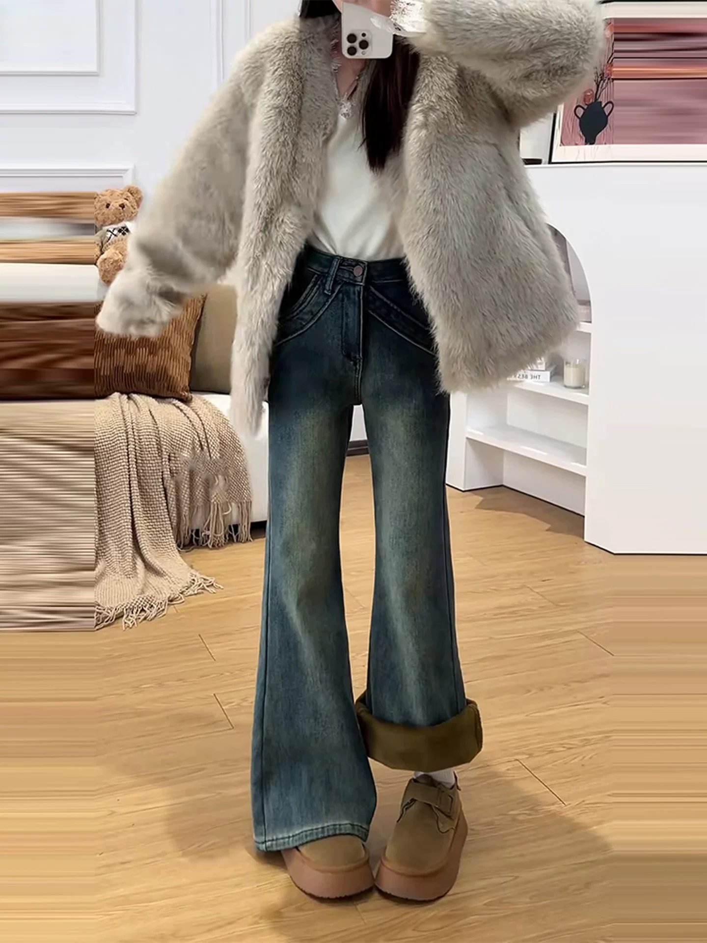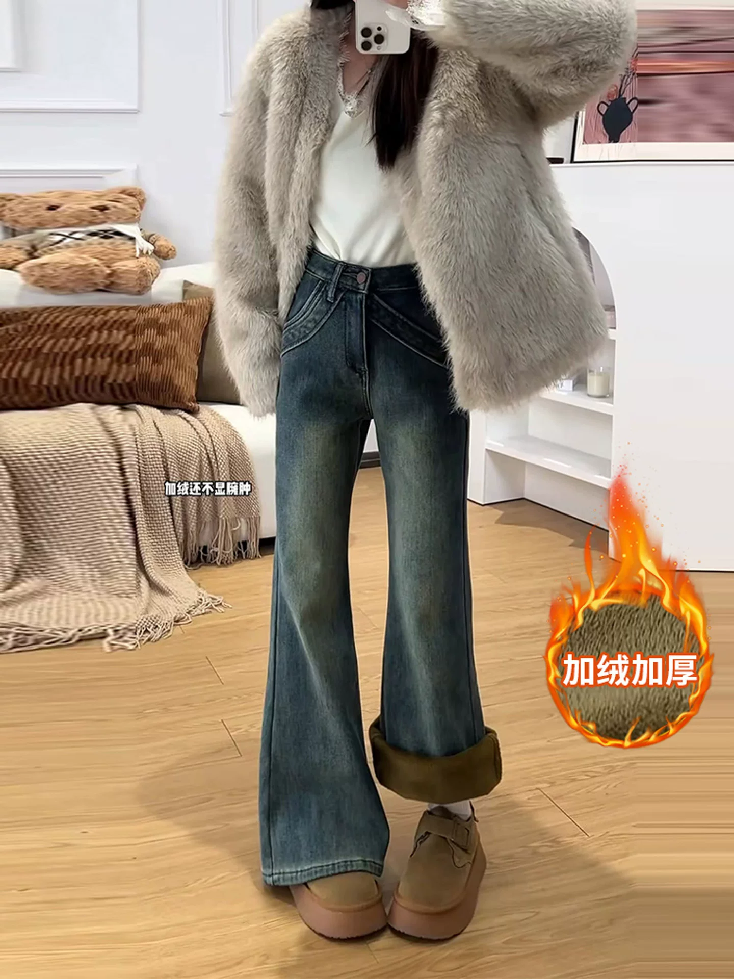 Quần jean ống loe cổ điển dành cho nữ, mùa thu đông, cỡ lớn, cạp cao, co giãn, che hông, dáng nhỏ nhắn, lót lông cừu, quần ống chuông dày dặn