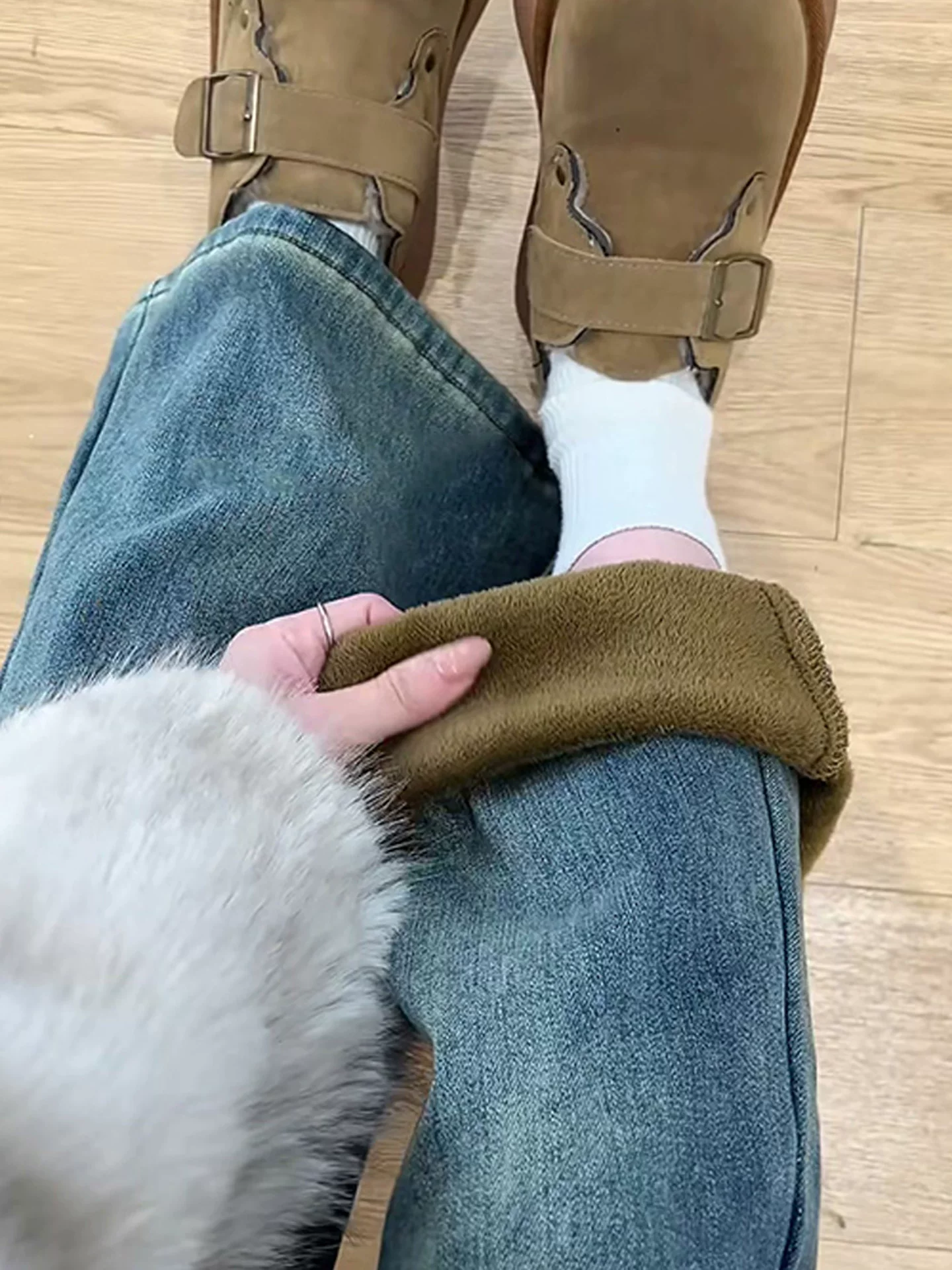 - Quần jean ống loe cổ điển dành cho nữ, mùa thu đông, cỡ lớn, cạp cao, co giãn, che hông, dáng nhỏ nhắn, lót lông cừu, quần ống chuông dày dặn