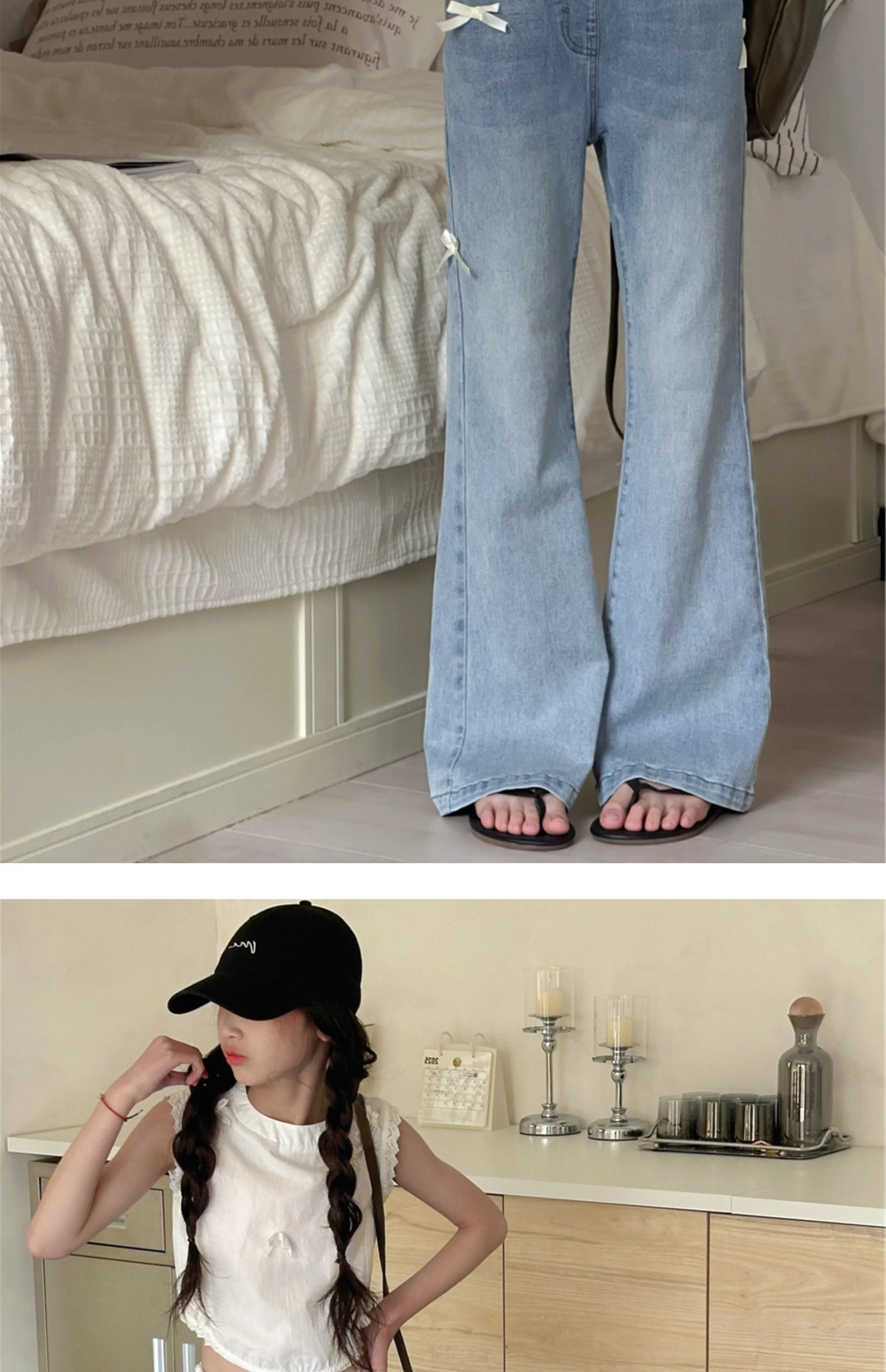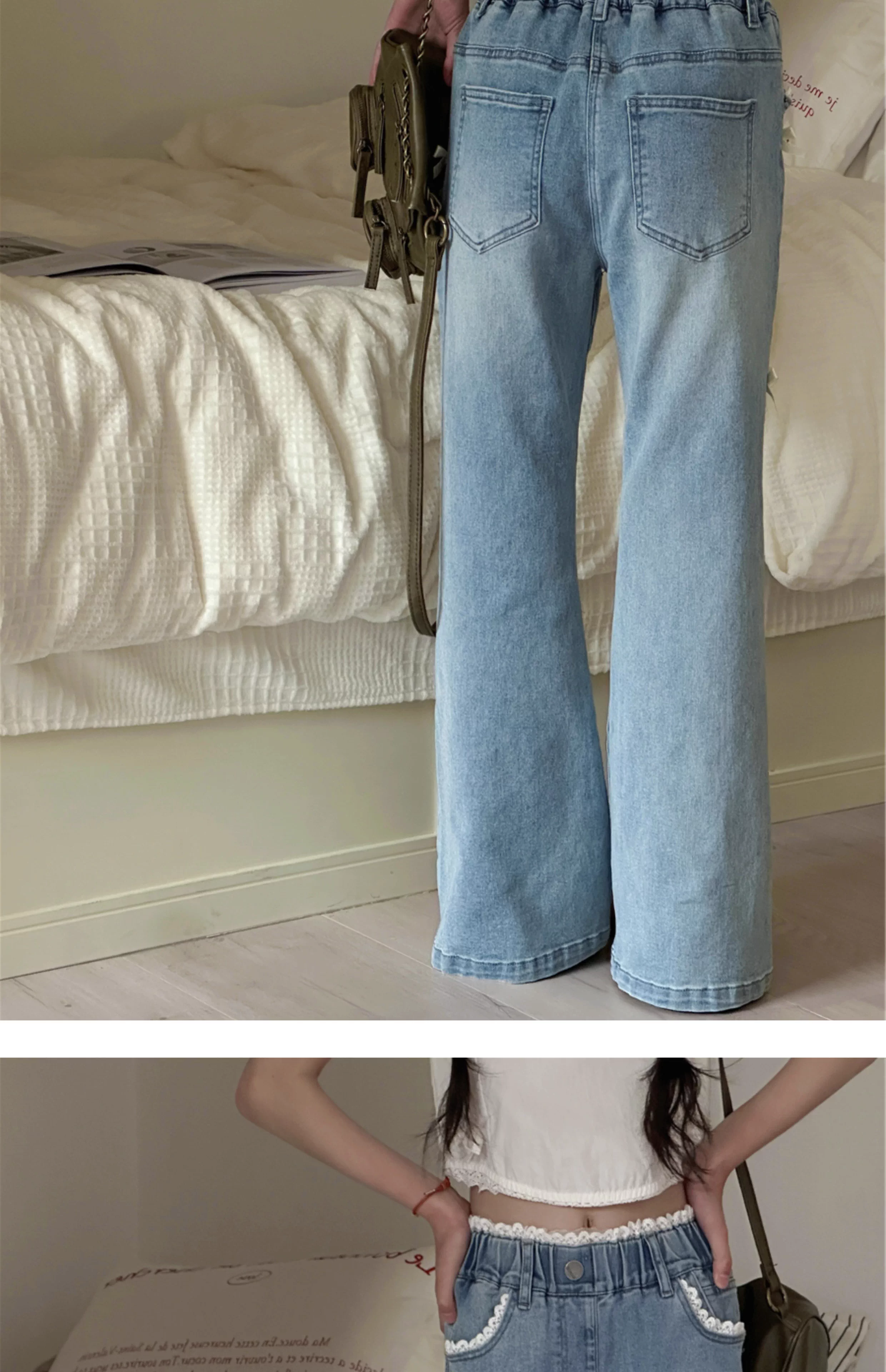 - Quần jean ống loe dành cho bé gái, quần áo trẻ em cỡ vừa và lớn, xuân hè 25, quần dài ống thẳng, dáng rộng và đa năng, viền ren, hợp thời trang.