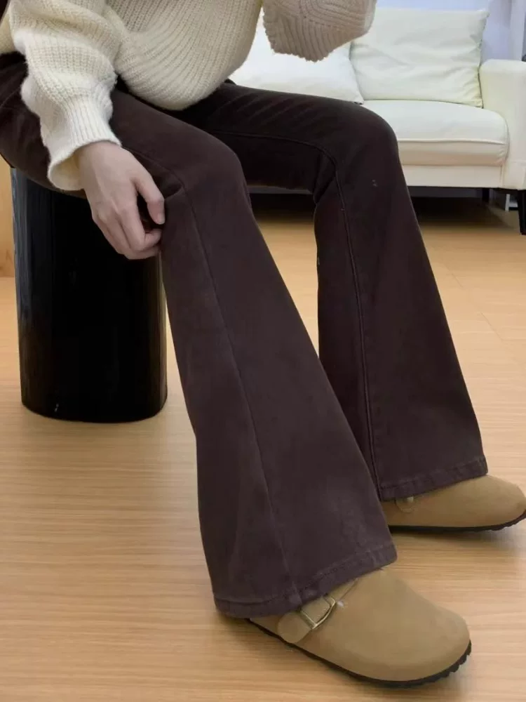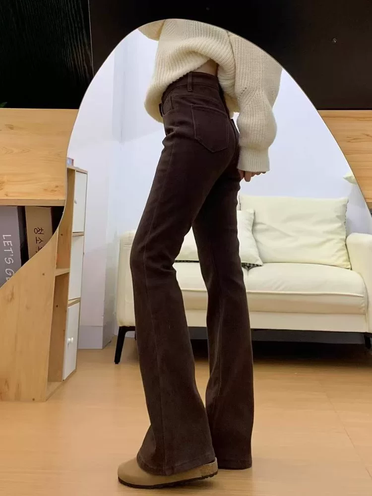 Quần jean ống loe dày dặn lót lông cừu màu cà phê dành cho nữ, cỡ lớn mùa đông, cạp cao, che hông, co giãn, quần ống loe tôn dáng.