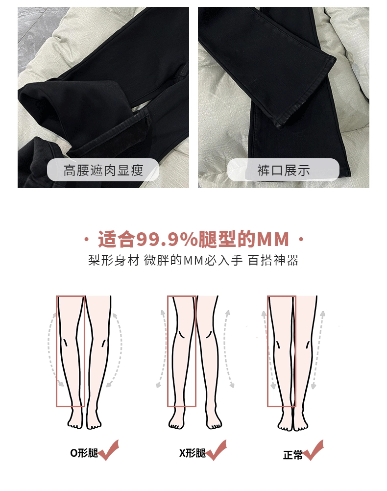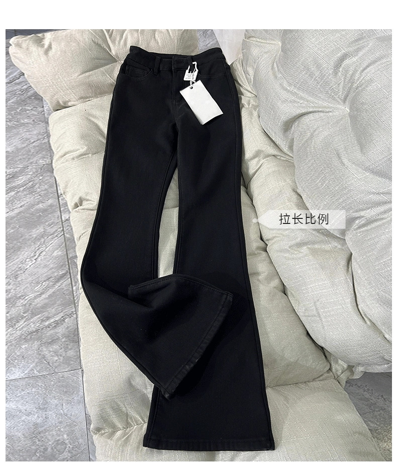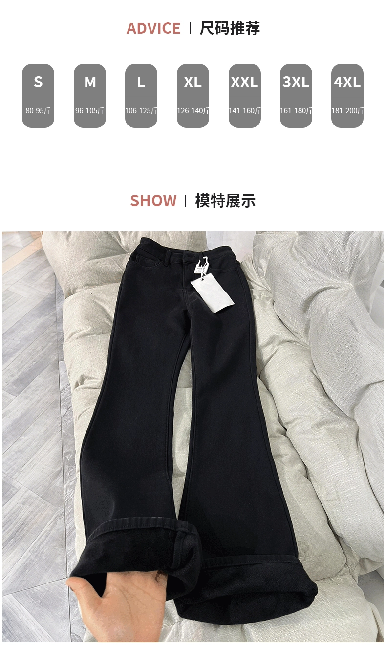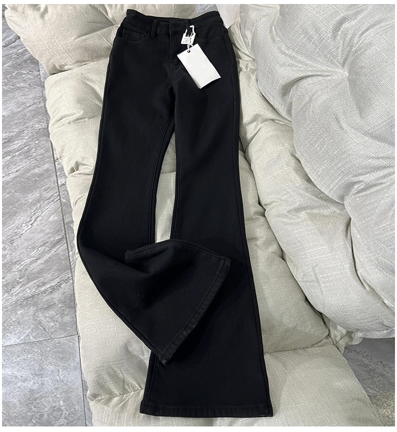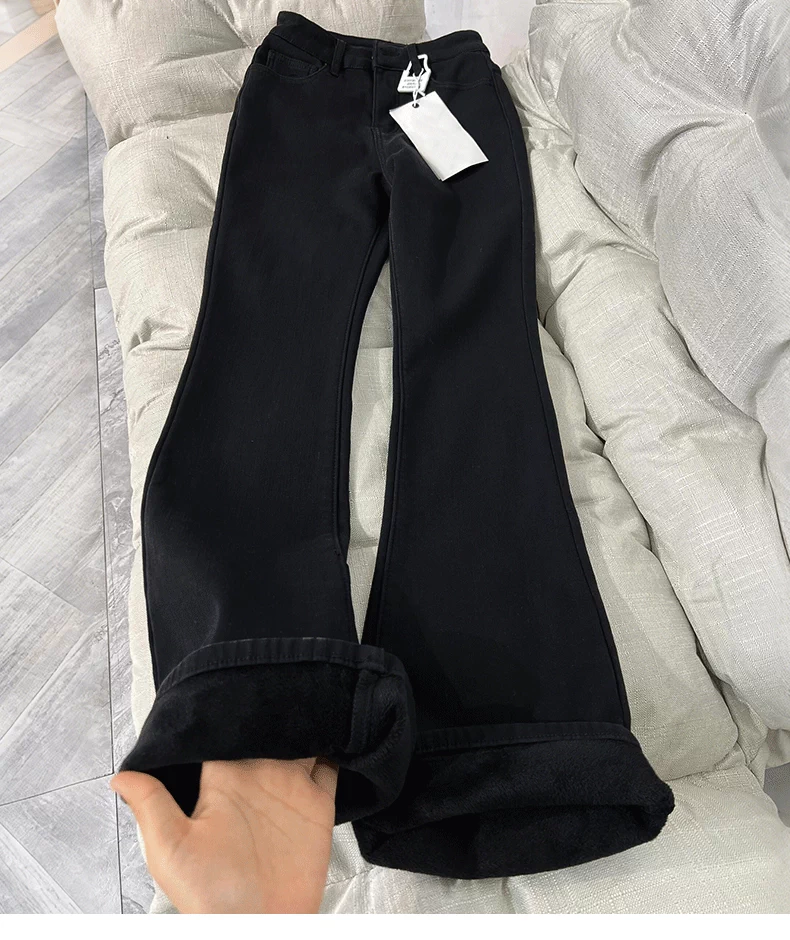 Quần jean ống loe dày lót lông cừu dành cho nữ, chất liệu co giãn mùa đông, size lớn cho người có thân hình cong, quần ống loe đen tôn dáng.