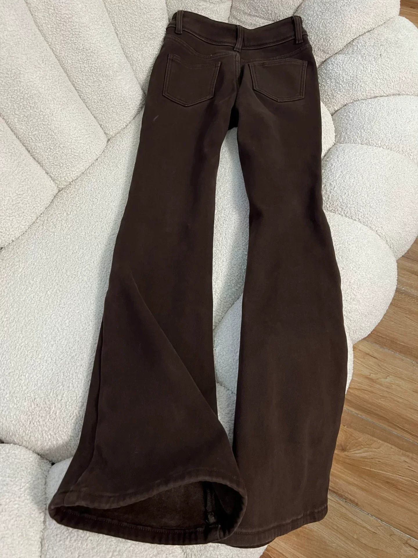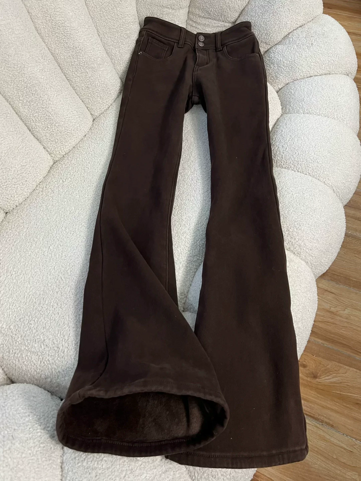 Quần jean ống loe dày lót lông cừu màu cà phê Melard dành cho nữ, mùa thu đông, cỡ lớn, lưng cao, giảm béo, ống chuông, quần dài đến sàn.