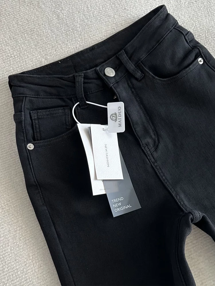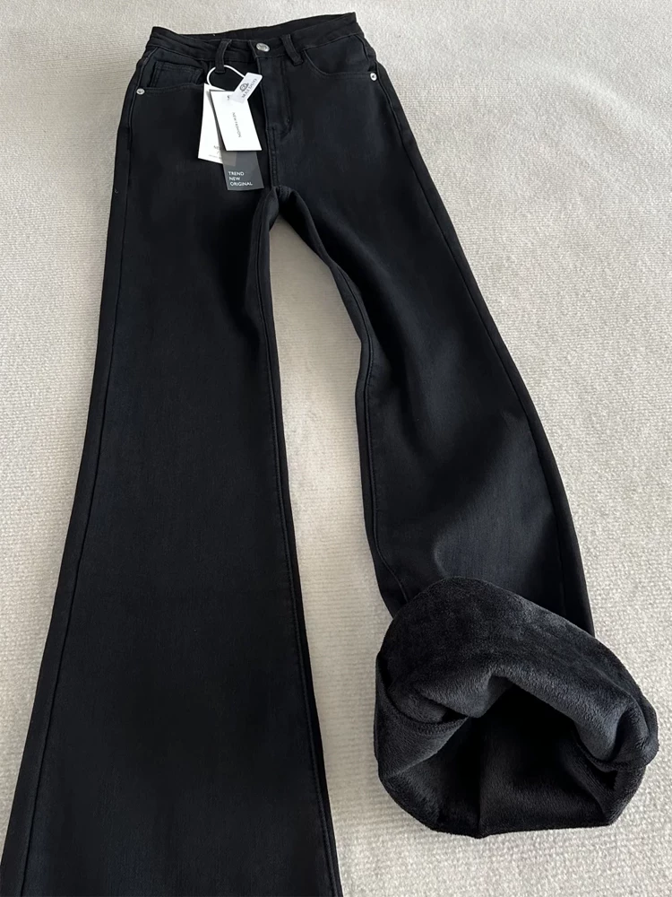 - Quần jean ống loe dày lót lông cừu màu đen dành cho nữ, mùa thu đông, cỡ lớn, lưng cao, che hông, giảm béo, quần ống loe co giãn.
