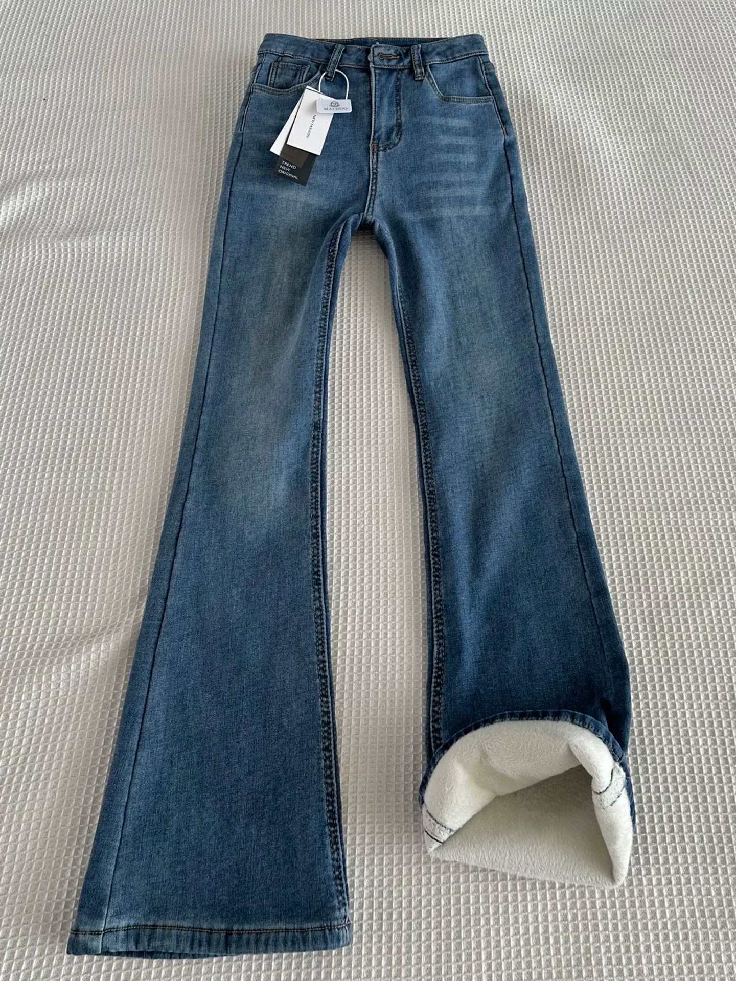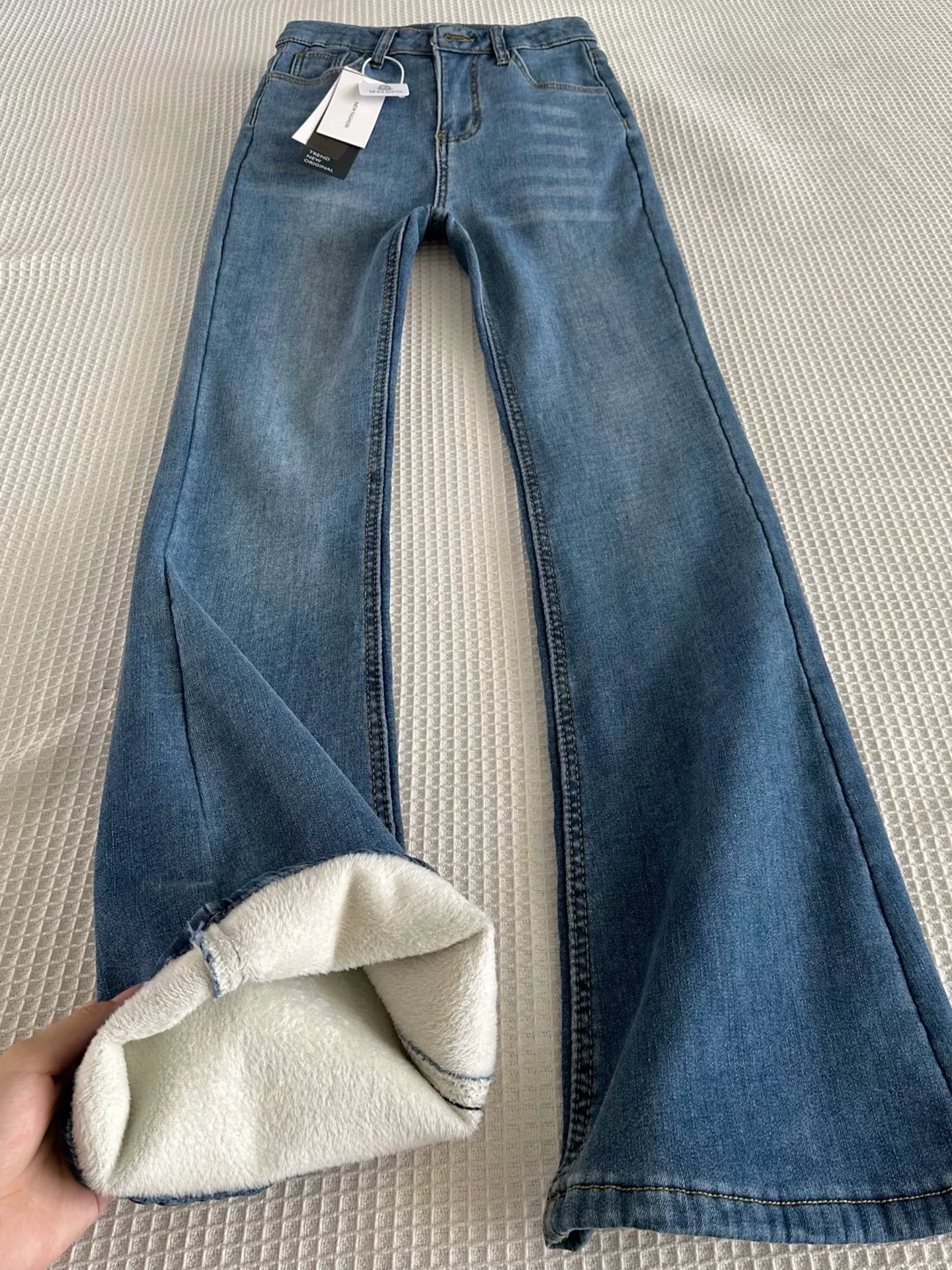 Quần jean ống loe dày lót lông màu xanh đậm dành cho nữ, mùa thu đông, cỡ lớn, lưng cao, co giãn, che hông, quần ống loe thon gọn.