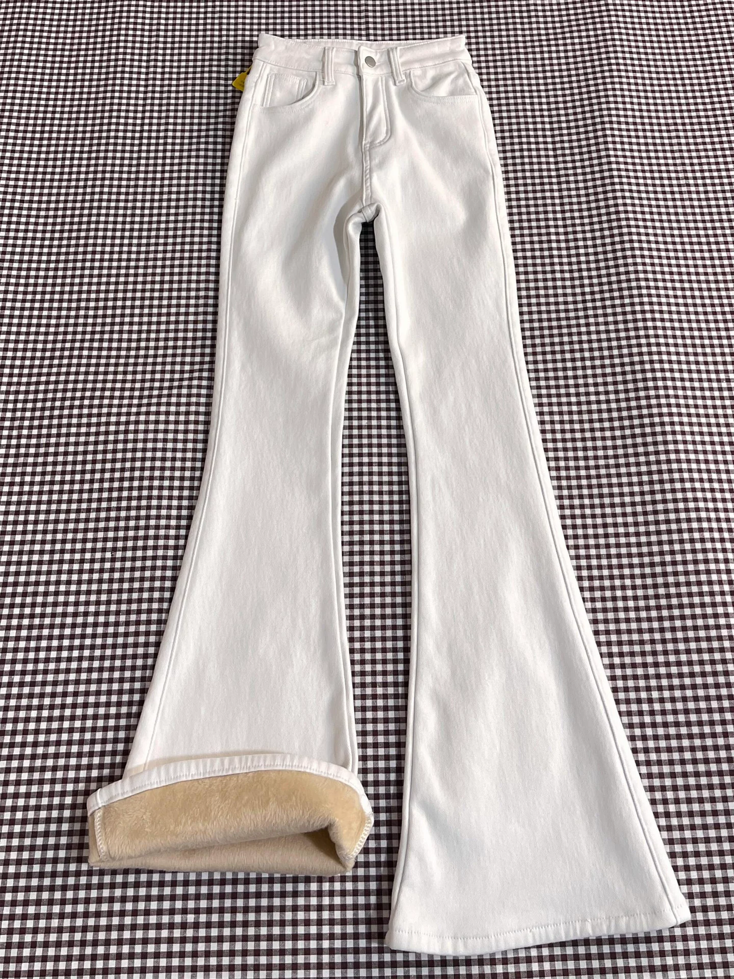Quần jean ống loe lót lông cừu màu trắng dành cho nữ, mùa thu đông, cỡ lớn, lưng cao, co giãn, che hông, giảm béo, quần dài ống loe