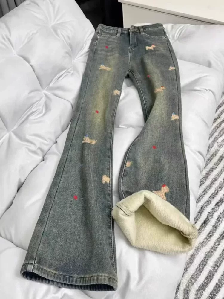 Quần jean ống loe lót lông cừu thêu Dachshund dành cho nữ, mùa thu đông, cỡ lớn, lưng cao, co giãn, che hông, quần ống loe giảm béo
